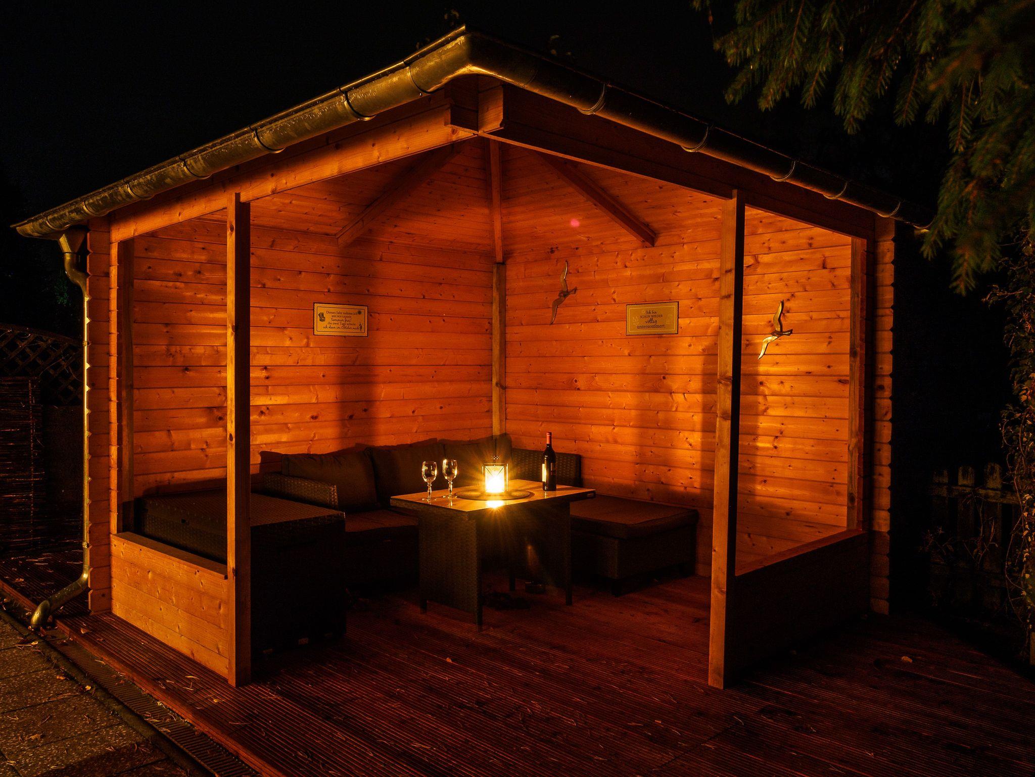 Im Außenbereich erwartet Sie eine großzügige Terrasse mit Gartenmöbeln sowie ein Pavillon mit gemütlicher Lounge-Ecke. Für Fahrräder gibt es eine Unterstellmöglichkeit. Für gesellige Abende im Freien steht außerdem ein eigener Grill bereit. Das gesamte Objekt verfügt über kostenfreies WLAN. Das Ferienhaus ist ein Nichtraucherhaus, Raucher können jedoch gerne den Außenpavillon nutzen. Außerdem steht eine Sauna zur Verfügung, deren Nutzung kostenpflichtig ist und bei Abreise entsprechend dem Stromverbrauch abgerechnet wird.