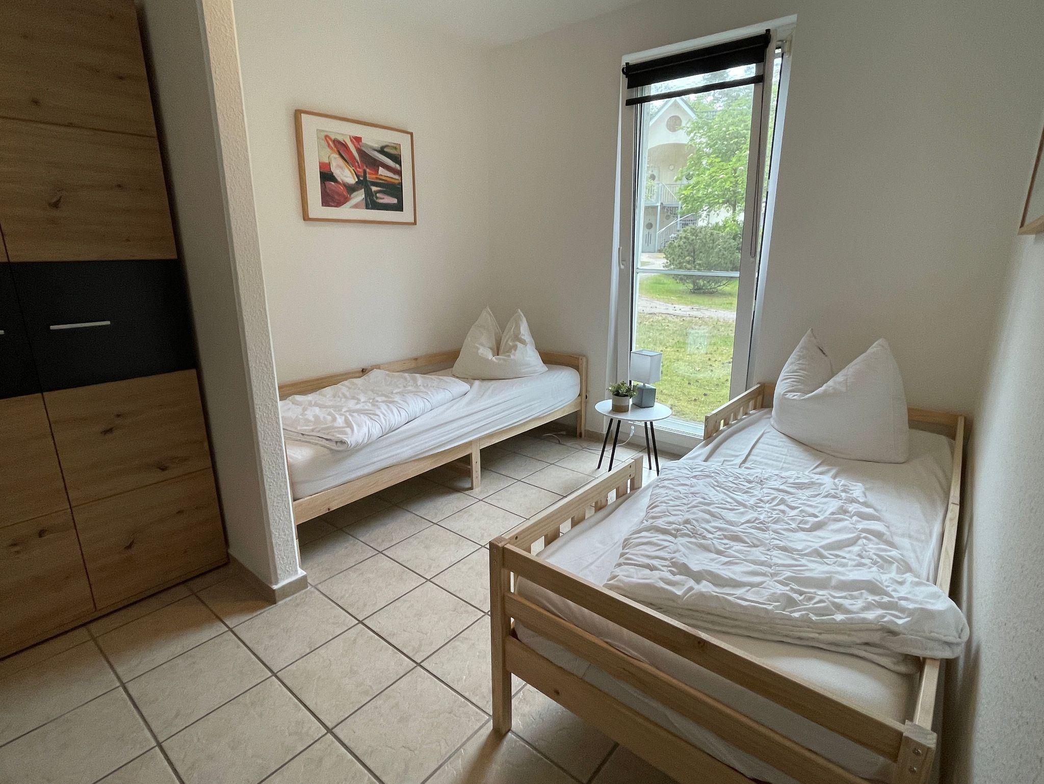 1 Wohnzimmer mit Küche (ausgestattet E-Herd, Geschirrspüler, Mikrowelle, Kühlschrank, Kaffeemaschine,Wasserkocher,Toaster..) 2 Schlafzimmer einmal mit einem 1 Doppelbett 90+90 x 200cm und das 2. Schlafzimmer mit Einzelbetten 100 x 200cm, 1 DU/WC ,Terrasse (mit Gartenmöbeln) PKW-Stellplatz und Fahrradabstellmöglichkeiten vor dem Haus, Wohnung ist für 4+1 Personen (Kind bis 3 Jahre im Kinderbett) geeignet, Kindereisebett und Kinderhochstuhl inklusive