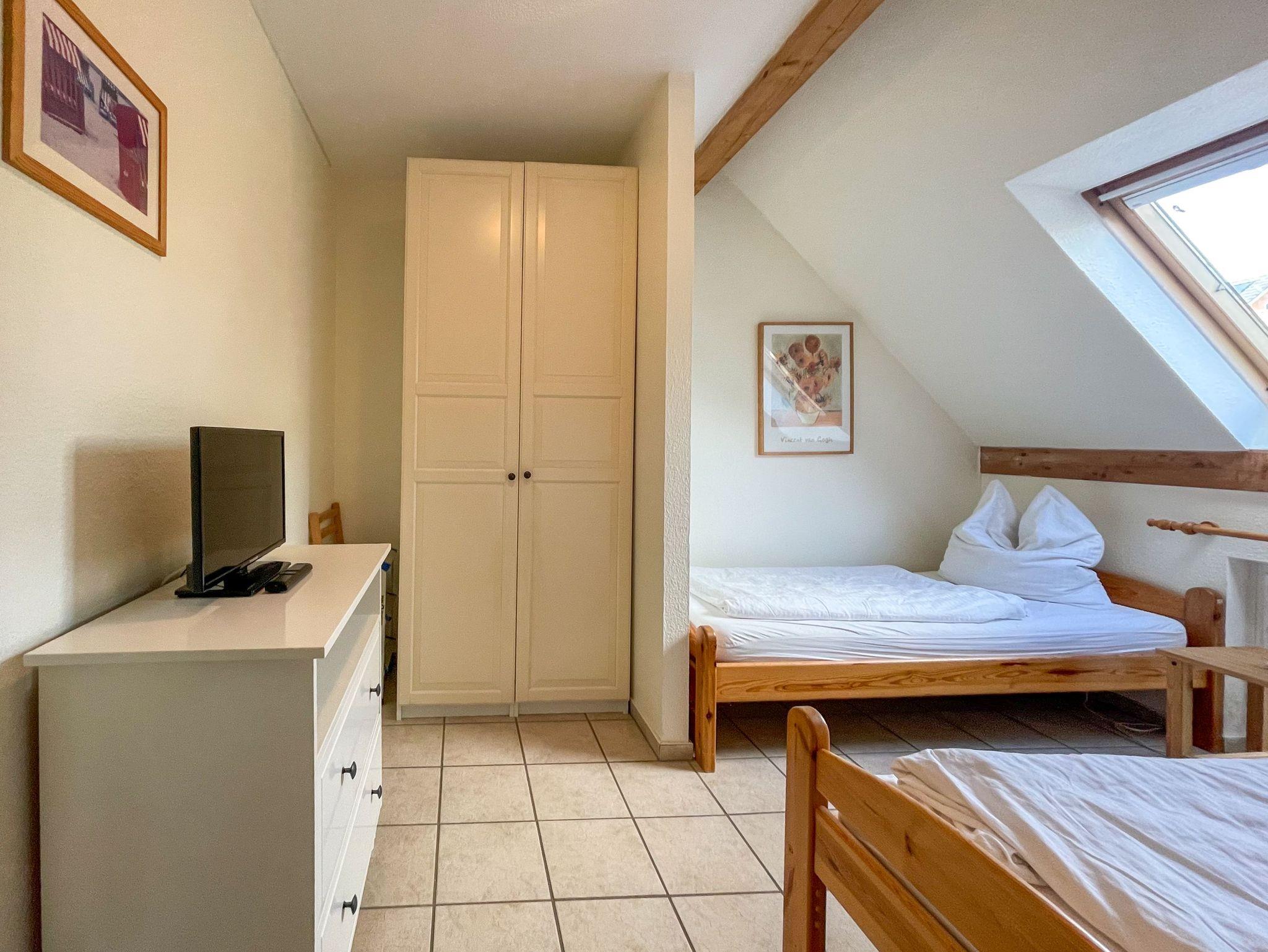 Neben dem Wohnzimmer liegt ein Schlafzimmer mit zwei Einzelbetten (je 100x200cm), einem großen Kleiderschrank und einer Kommode mit einem kleinen Flat-TV. Anschließend finden Sie das zweite Schlafzimmer mit einem großen Doppelbett (zwei Matratzen je 90x200cm) und einem Sideboard. Für die kleinen Gäste steht ein Reisebett und ein Hochstuhl kostenfrei zur Verfügung. Wäschepakete können Sie kostenpflichtig dazu buchen, geben Sie dies bitte bei der Buchung mit an.