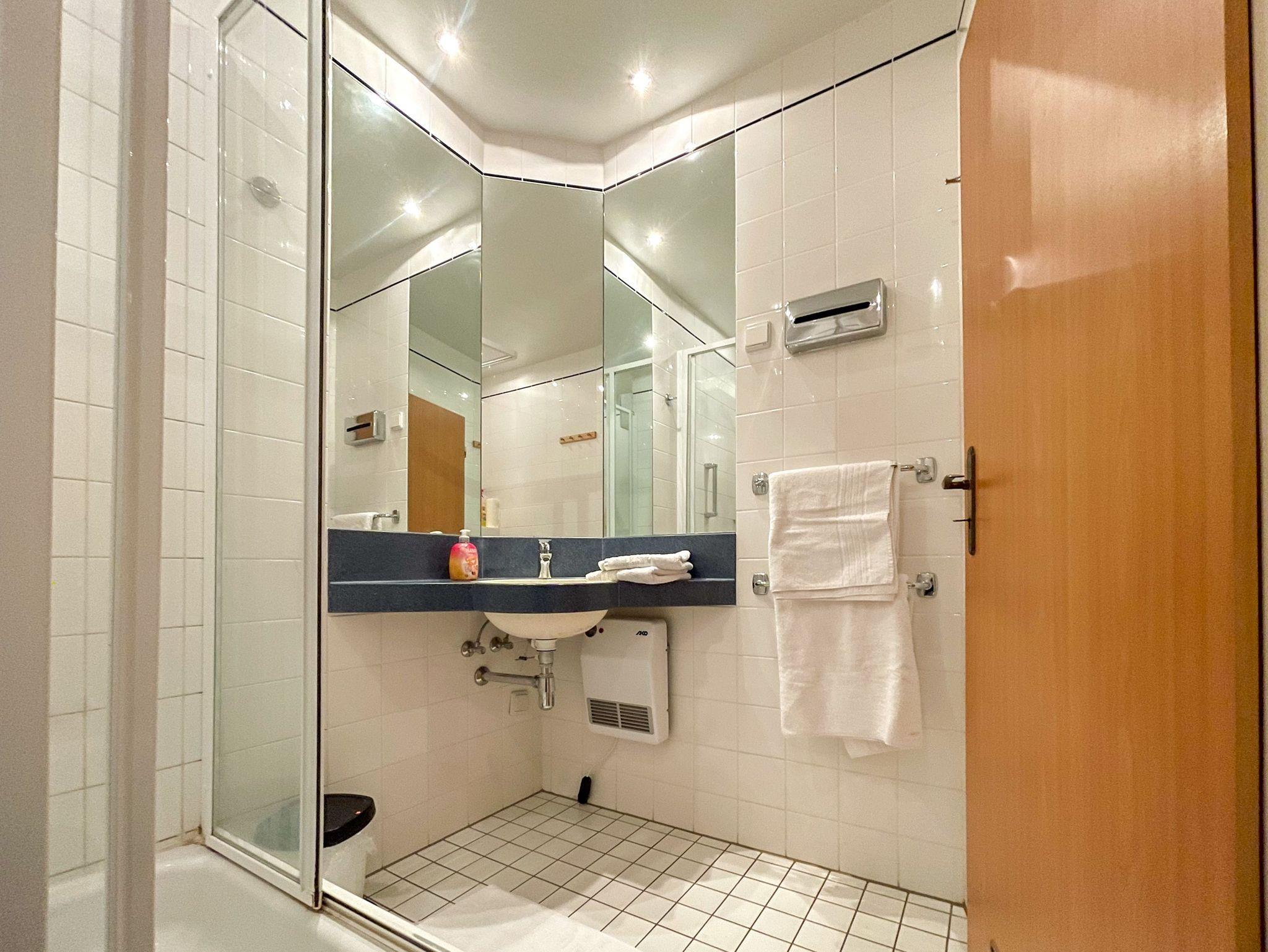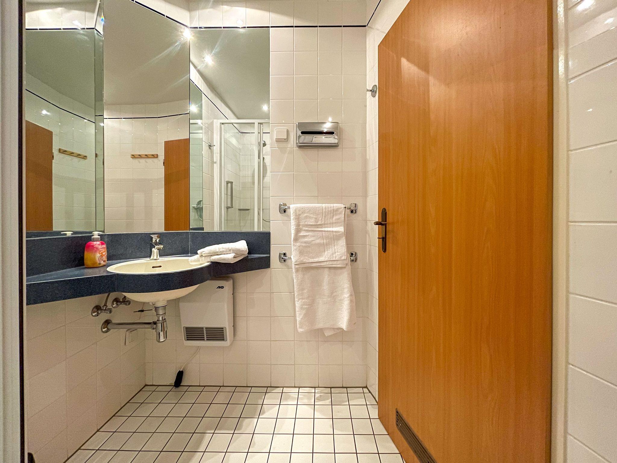 Zuletzt kommen Sie vom Flur in das Badezimmer, ausgestattet mit einer Dusche, einem WC und einem Waschbecken.
