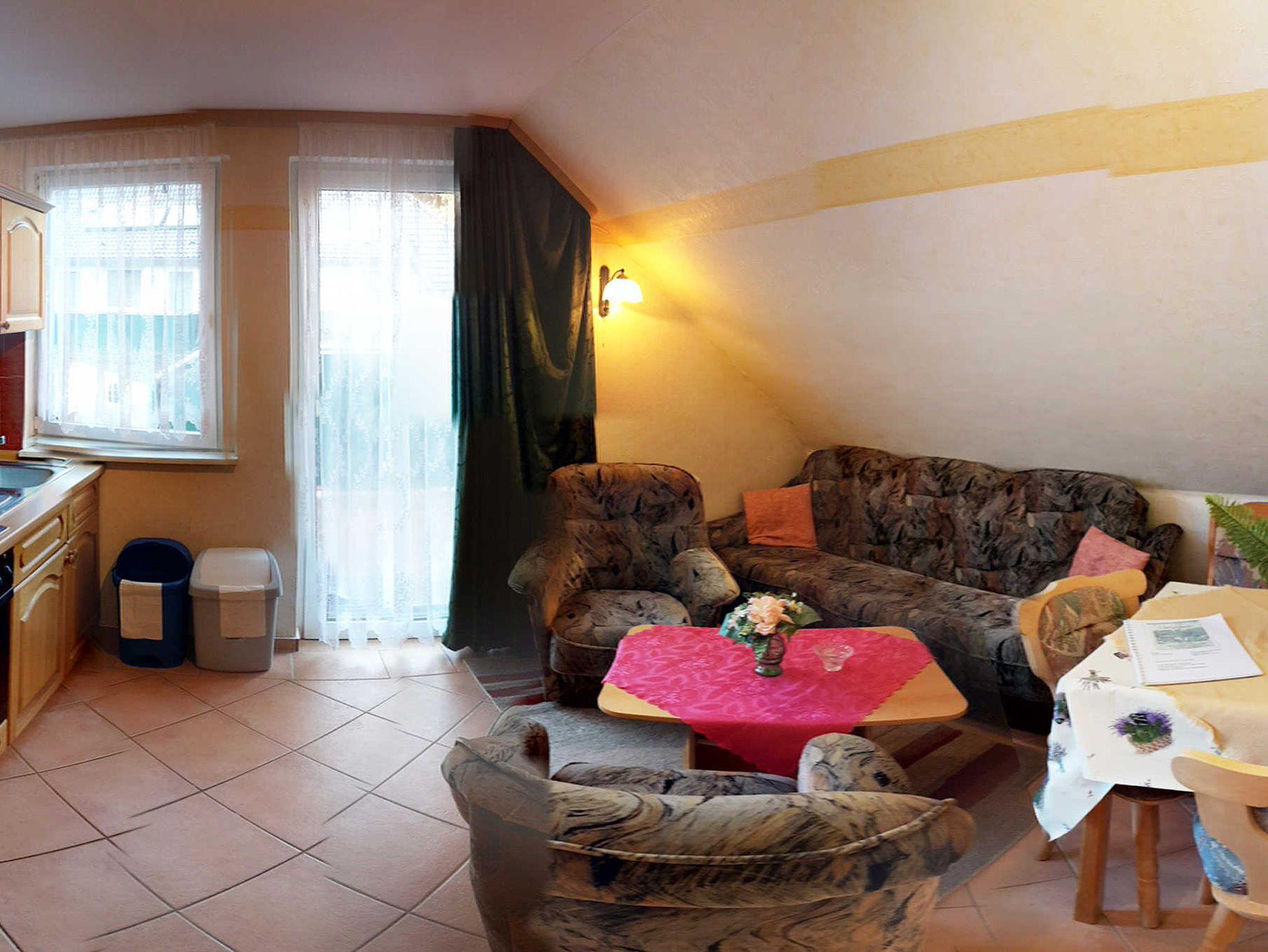 3 Raum-Wohng., 2 SZ, Küche, Wohnzimmer, Bad mit Dusche/WC, Flur, Balkon, Terrasse. Frühstücksbüfett mit Voranmeldung möglich und auch Abendessen à la carte. Haustiere nur auf Anfrage!