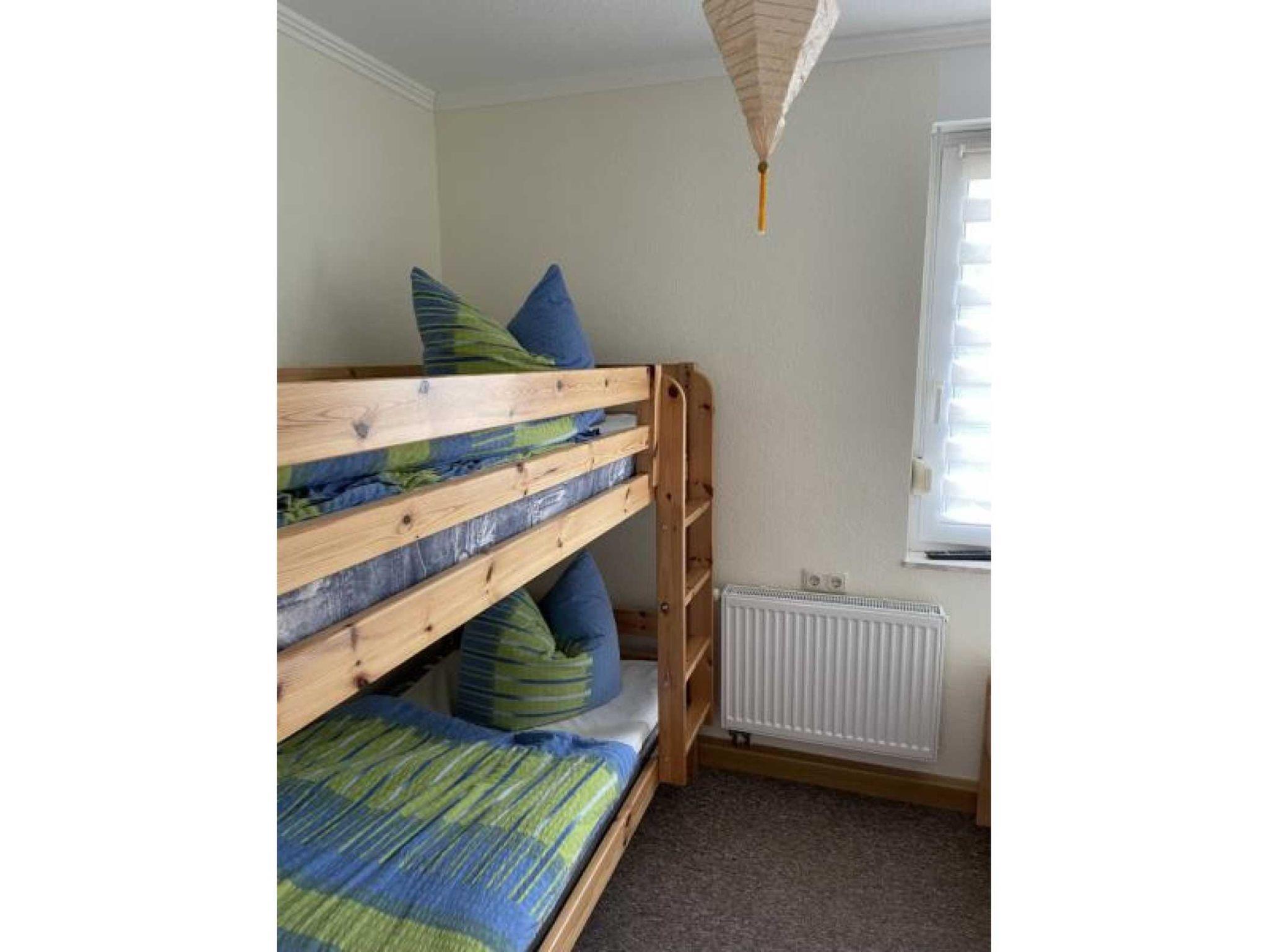 Die Ferienwohnung verfügt über 2 Schlafräume (1x Doppelbett, 1x Etagenbett & 1 Einzelbett und zus. TV), einer voll ausgestatteten Küche mit Backofen, Kühlschrank mit Gefrierfach, Wasserkocher, Toaster und Kaffeemaschine. Der Wohn- und Essbereich verfügt über einen Flat-TV für gemütliche Stunden. Das Badezimmer ist mit Dusche/WC, Waschmaschine und Fön ausgestattet. Die Fußböden sind teilweise mit Teppich im Wohn- und Schlafbereich, mit Linoleum im Küchen- und Essbereich und mit Fliesen im Bad ausgelegt. Die Wohnung hat eine separate Sitzmöglichkeit im Außenbereich. Ein PKW-Stellplatz und WLAN stehen Ihnen kostenfrei zur Verfügung.