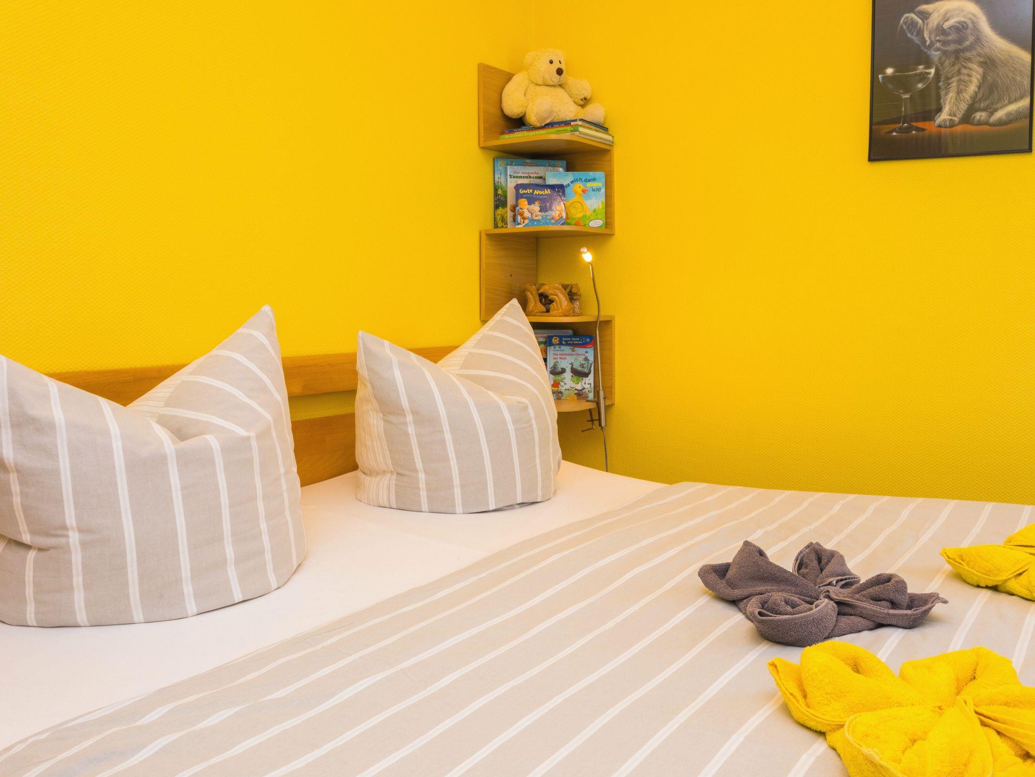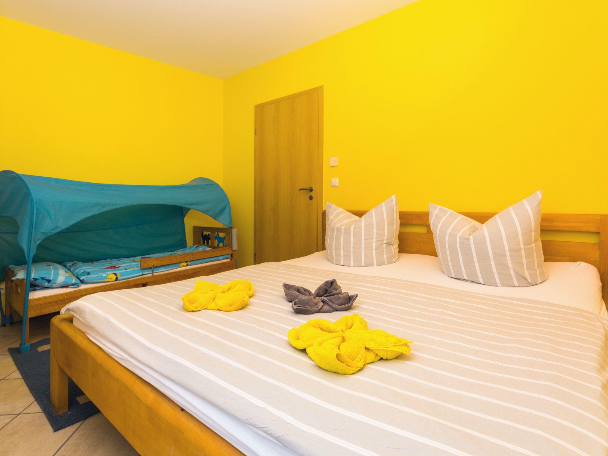 • 1 Schlafzimmer mit Doppelbett (ca. 1,80 m x 2,00 m), mit durchgehender Matratze, zusätzliches Kinderbett (Kinder bis 10 Jahre)
