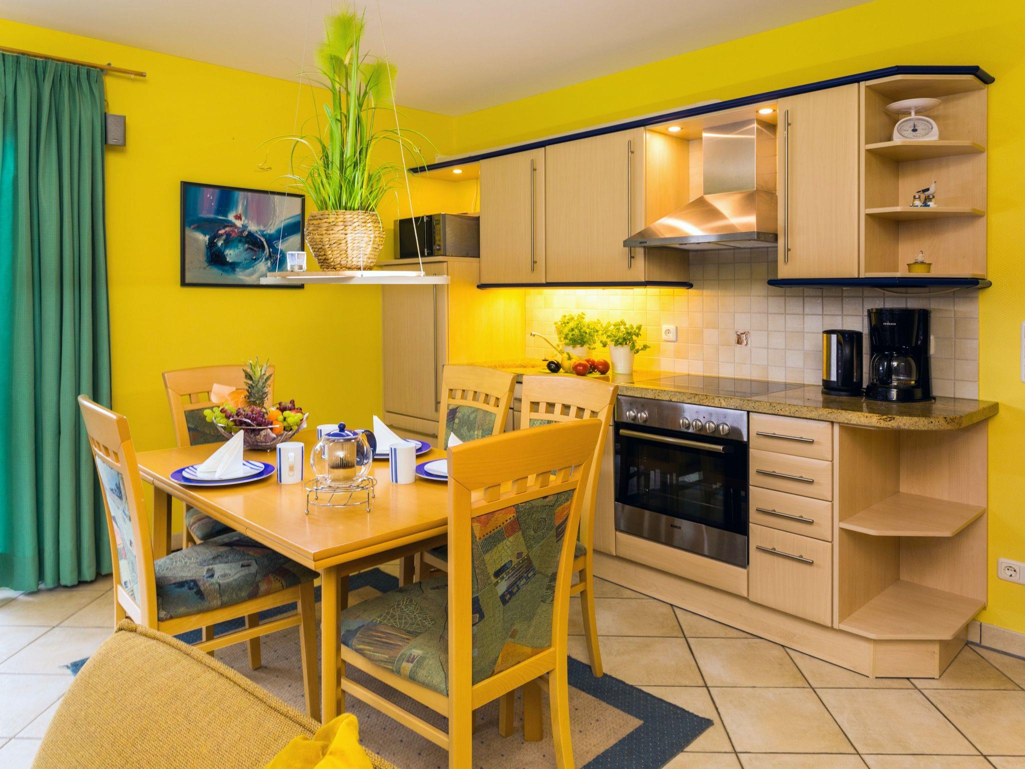 • Herd mit Backofen, Mikrowelle, Kühlschrank mit Gefrierfach, Geschirrspüler, Kaffeemaschine, Wasserkocher und Toaster