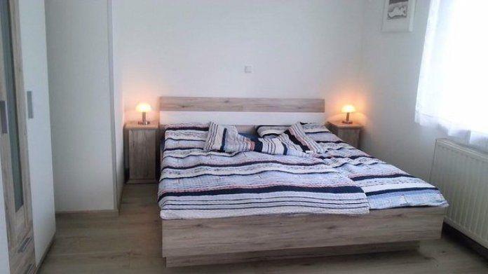 Schlafzimmer 1: Ein gemütliches Schlafzimmer mit einem Doppelbett (2 x 90 x 200 cm) und einem zusätzlichen Platz für ein Babybett.