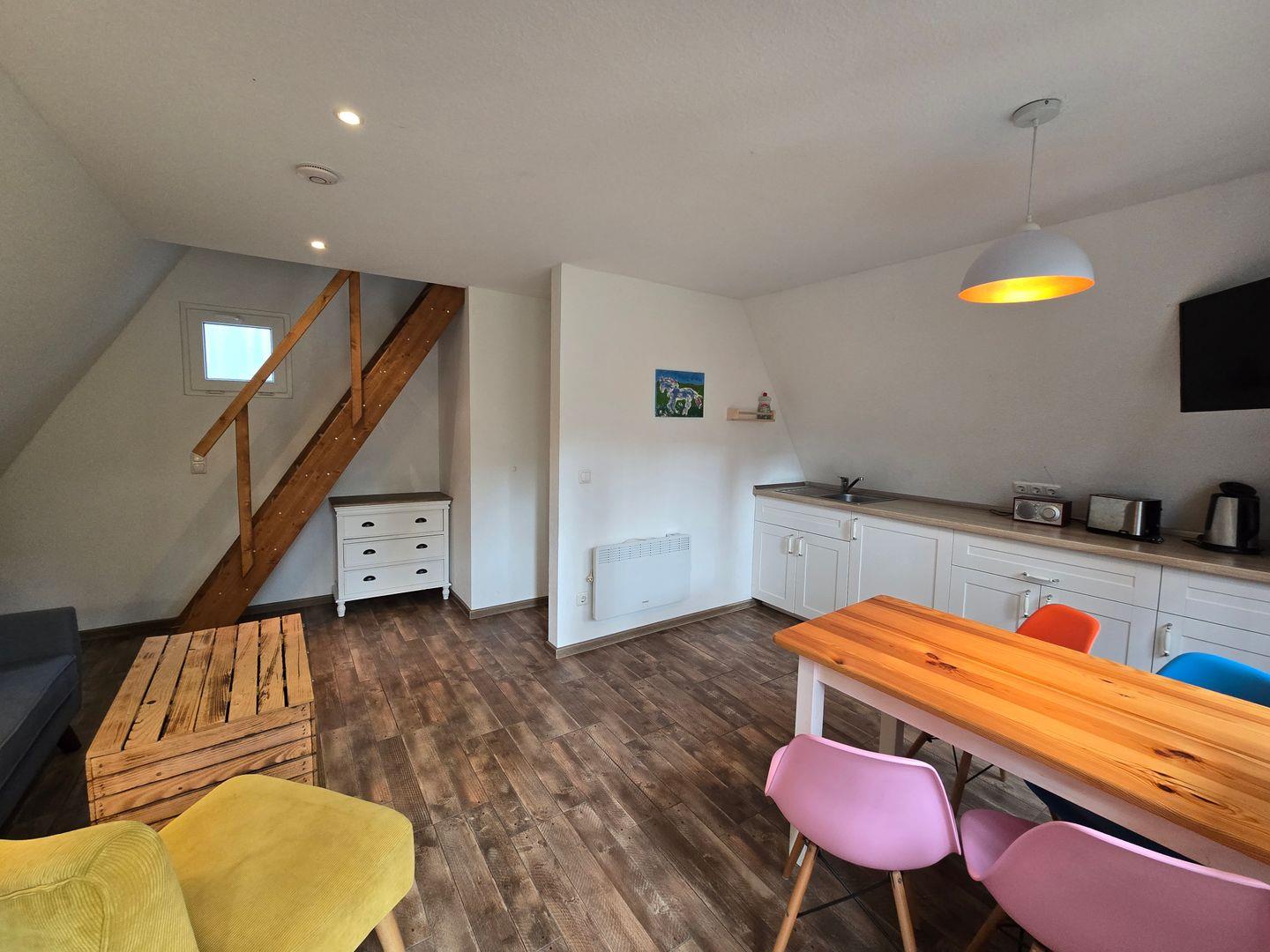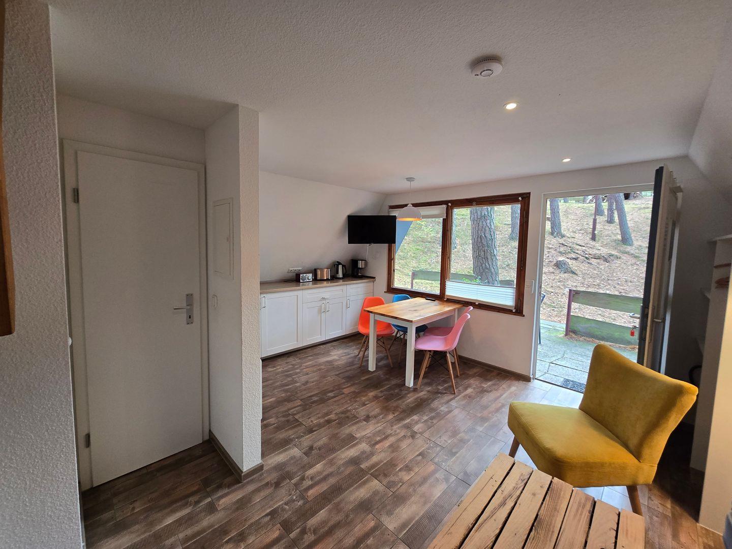 Drinnen warten ca. 30 m², die mehr können, als man denkt. Im Wohnzimmer treffen Sofa, Tisch und Stühle auf eine große Terrassentür, die den Wald direkt ins Haus holt. Die Schlafgalerie unterm Dach ist kuschelig und luftig zugleich – vier Betten für Erwachsene oder Kinder. IAlles schlicht, praktisch, ein bisschen skandinavisch – und mit Heizung für kühle Abende.