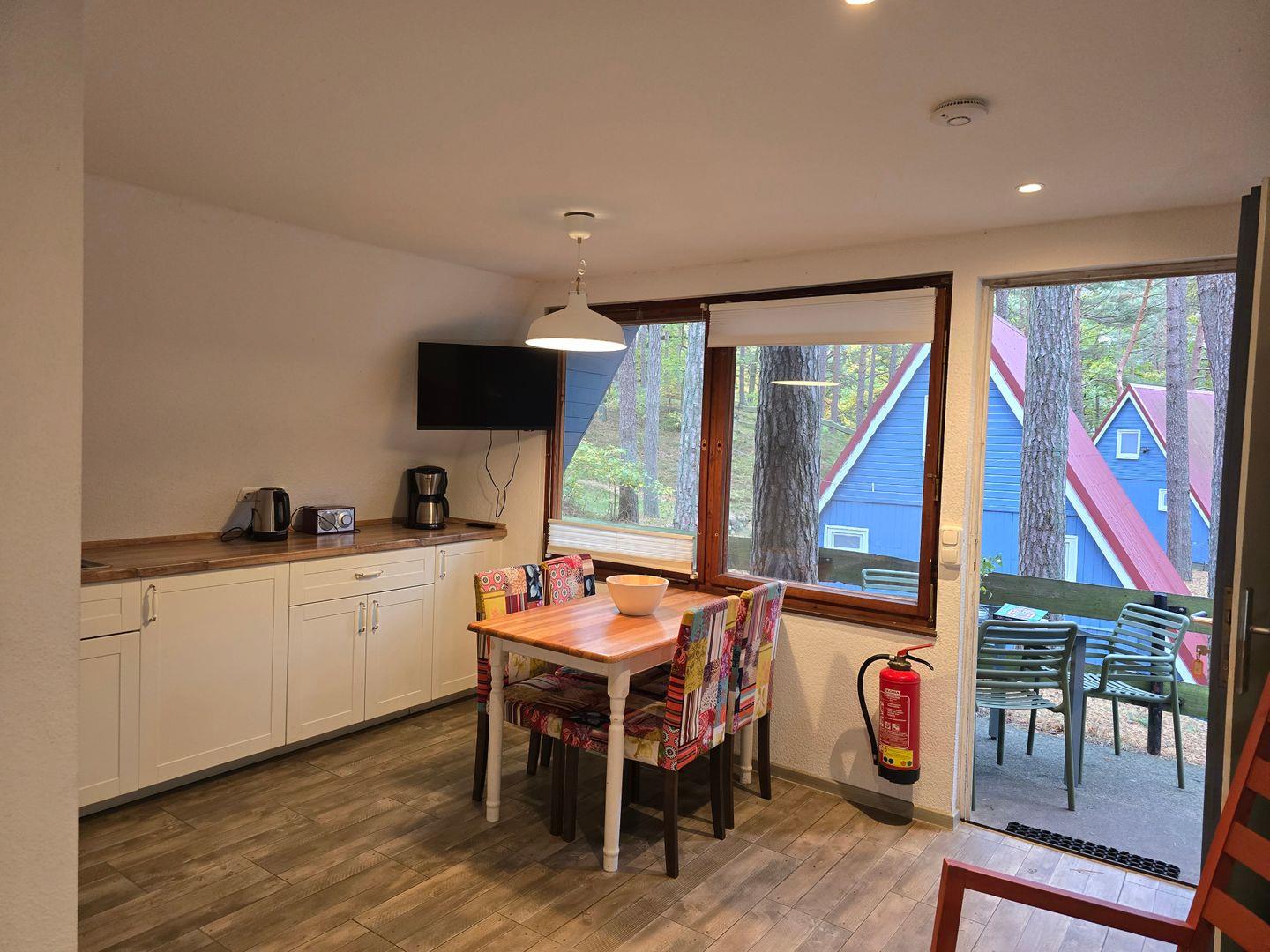 Drinnen warten ca. 30 m², die mehr können, als man denkt. Im Wohnzimmer treffen Sofa, Tisch und Stühle auf eine große Terrassentür, die den Wald direkt ins Haus holt. Die Schlafgalerie unterm Dach ist kuschelig und luftig zugleich – vier Betten für Erwachsene oder Kinder. IAlles schlicht, praktisch, ein bisschen skandinavisch – und mit Heizung für kühle Abende.