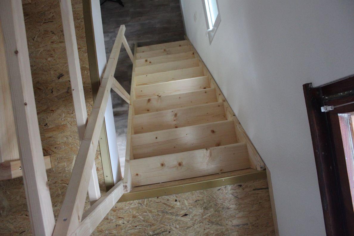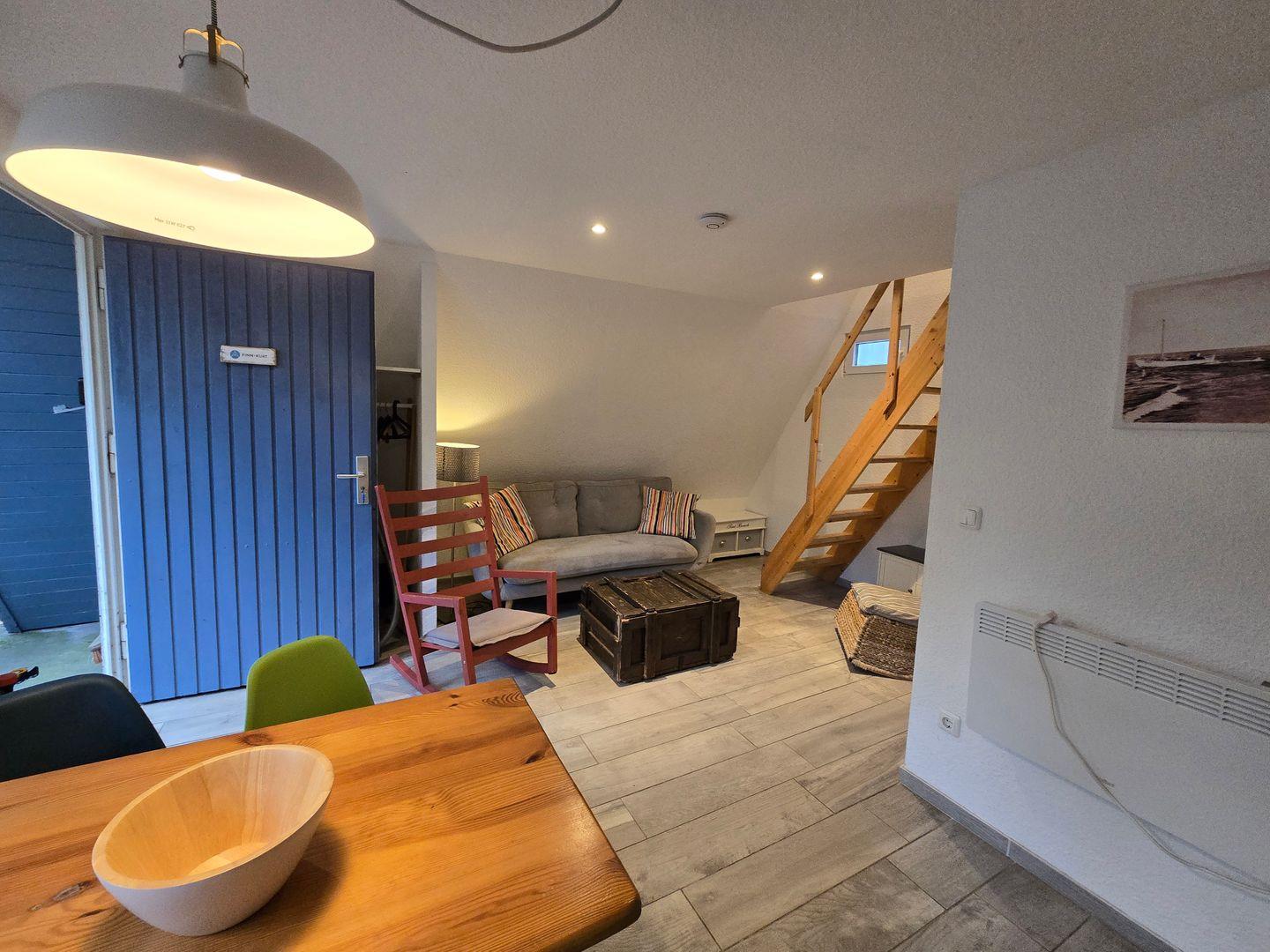 Drinnen warten ca. 30 m², die mehr können, als man denkt. Im Wohnzimmer treffen Sofa, Tisch und Stühle auf eine große Terrassentür, die den Wald direkt ins Haus holt. Die Schlafgalerie unterm Dach ist kuschelig und luftig zugleich – vier Betten für Erwachsene oder Kinder. IAlles schlicht, praktisch, ein bisschen skandinavisch – und mit Heizung für kühle Abende.