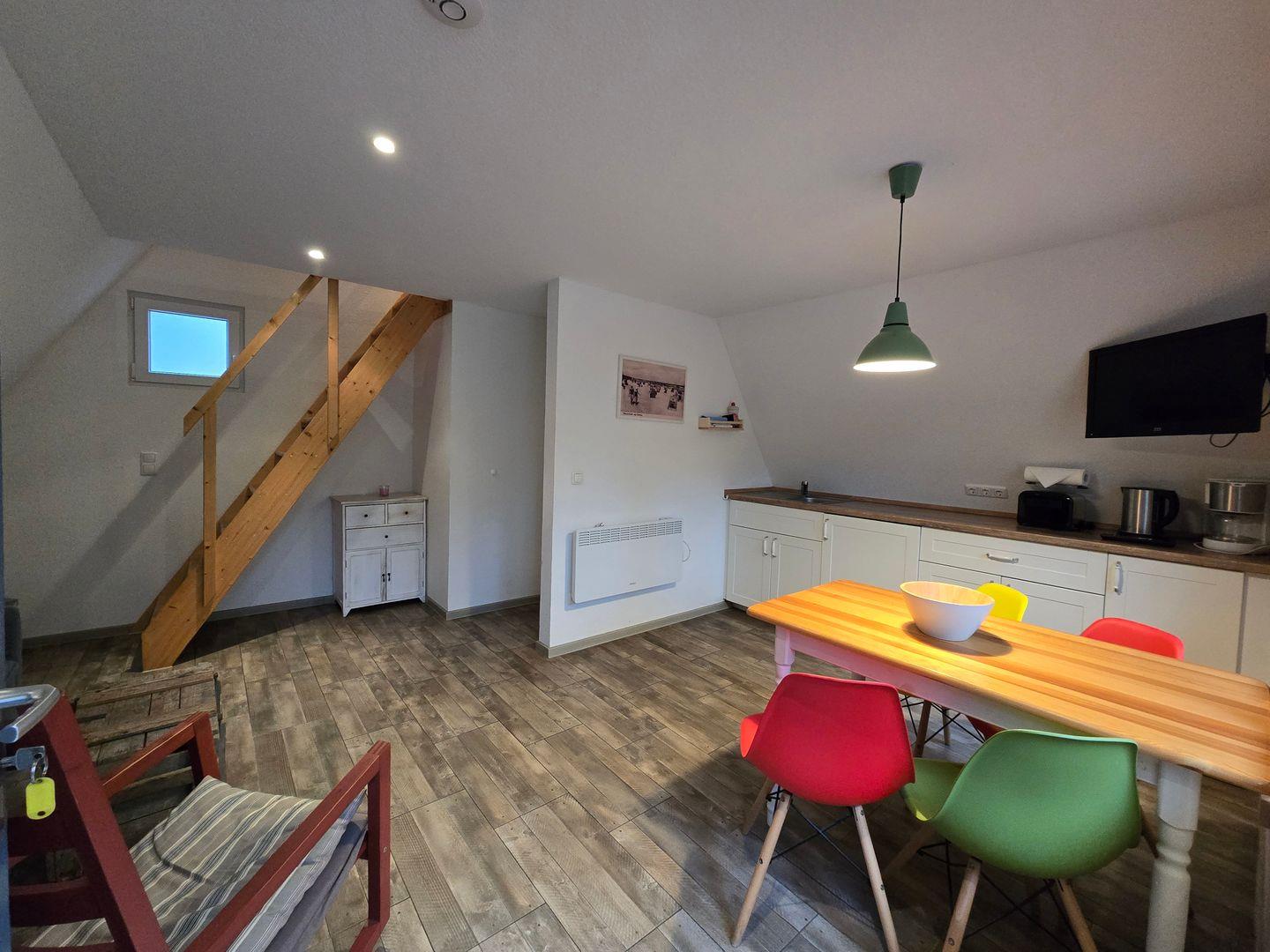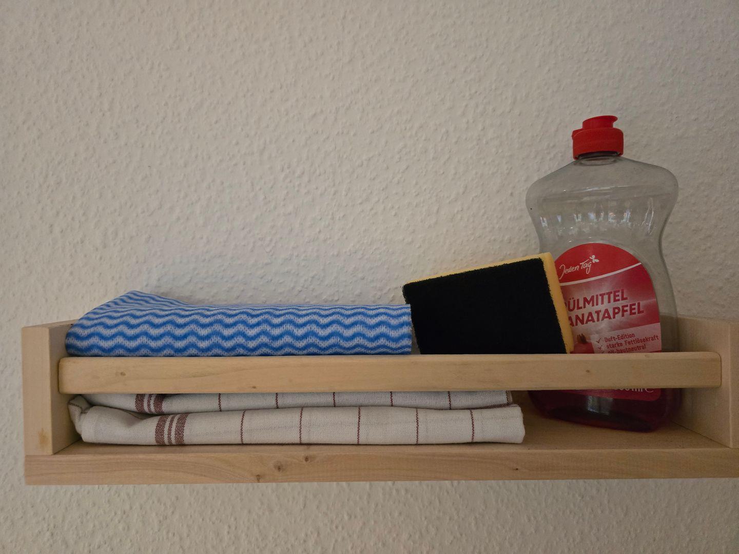 Die kleine Küchenzeile hat alles, was es für große Urlaubsgerichte braucht: Herd mit zwei Platten, Kühlschrank mit Gefrierfach, Kaffeemaschine, Toaster, Wasserkocher – dazu Geschirr und Besteck für vier Personen. Sollte einmal etwas fehlen: einfach melden, wir sorgen dafür. Daneben das eigene Duschbad mit WC – klein, aber fein und ganz für Sie allein.