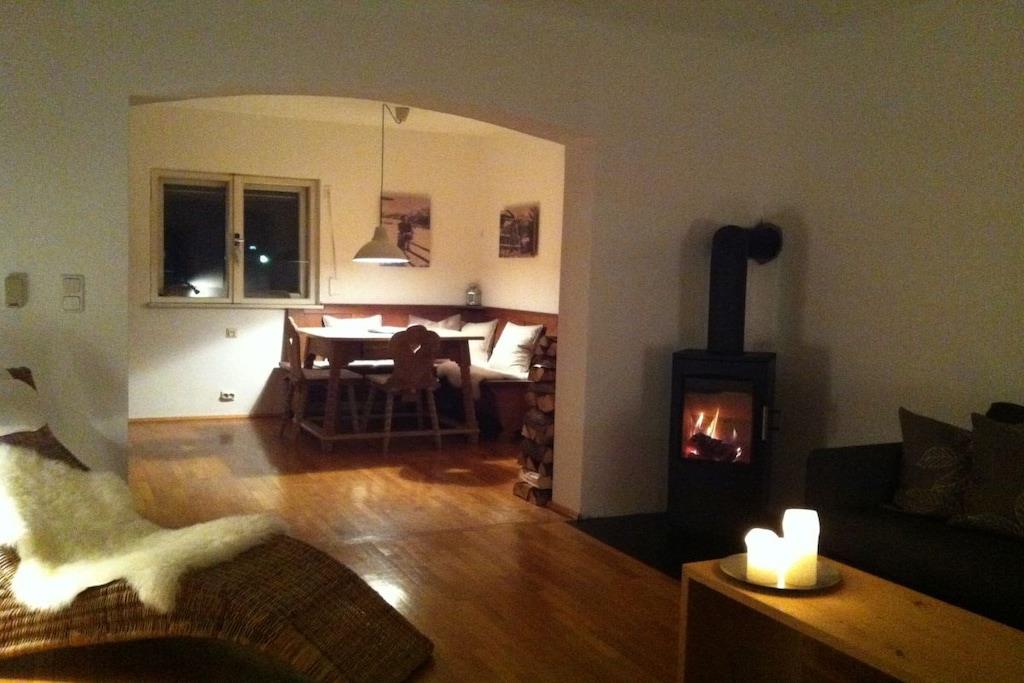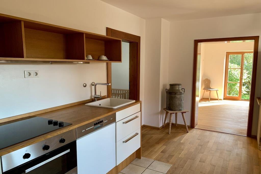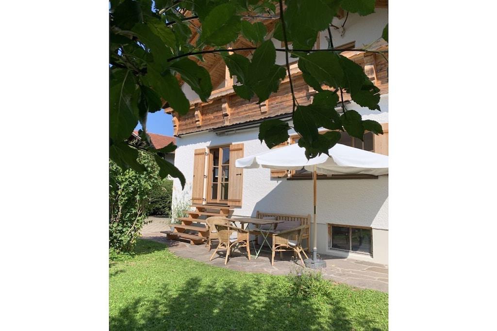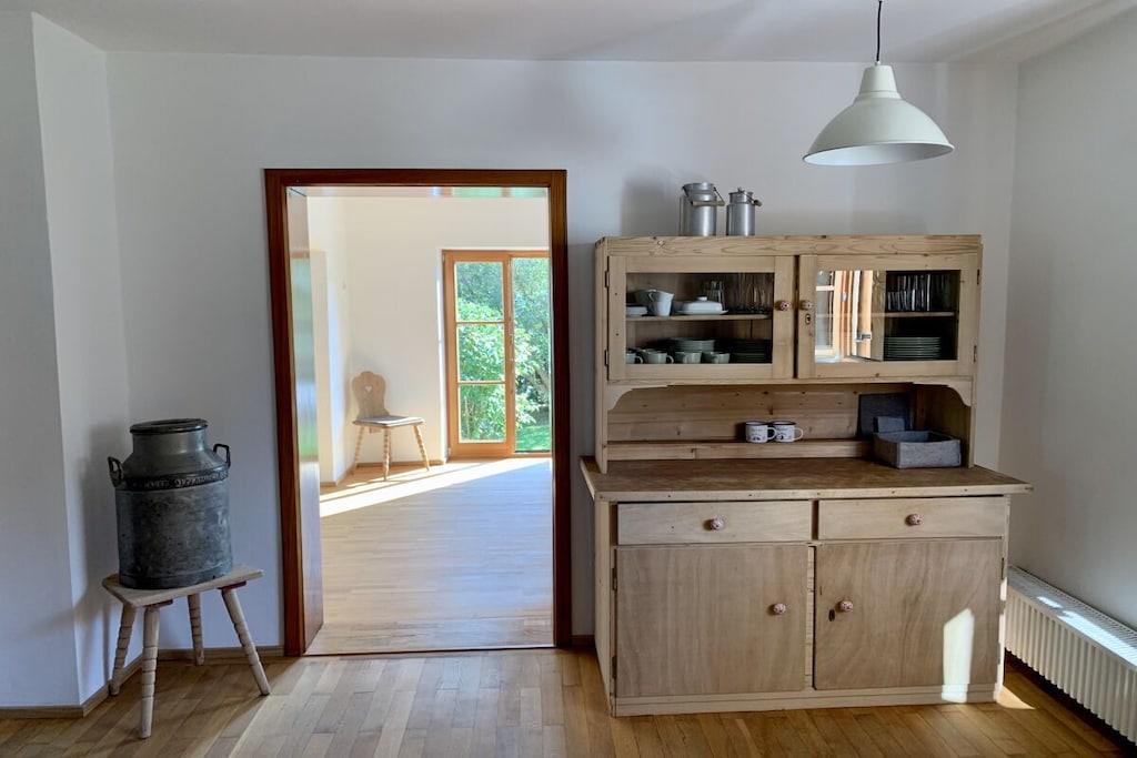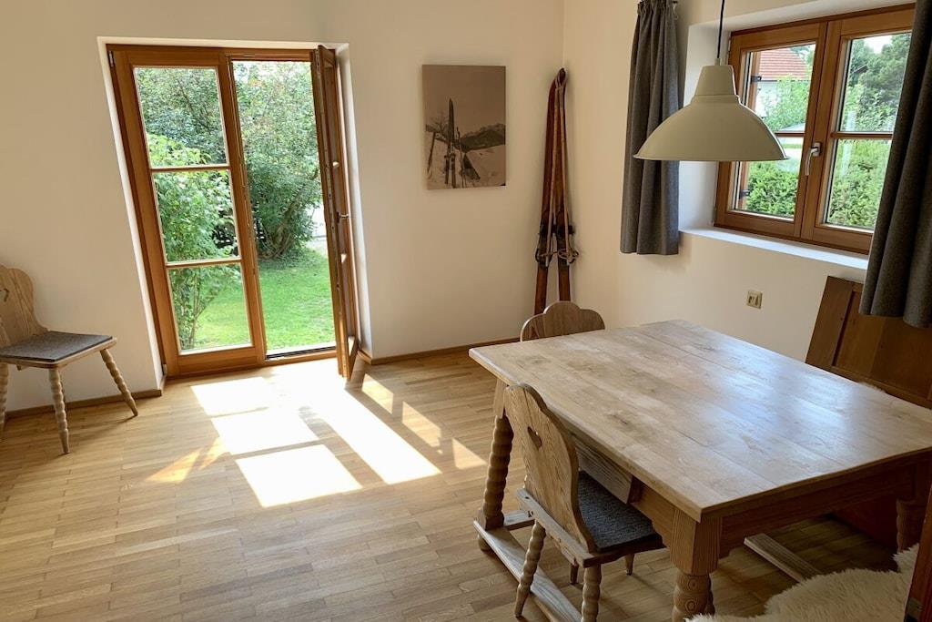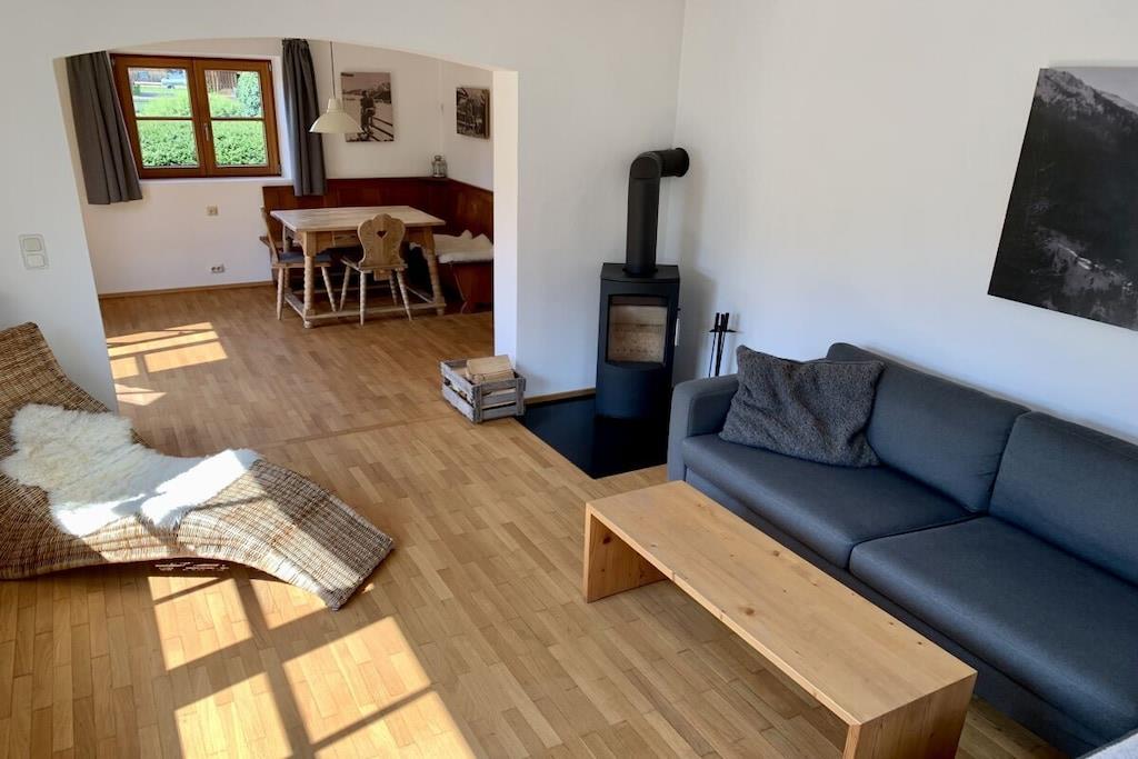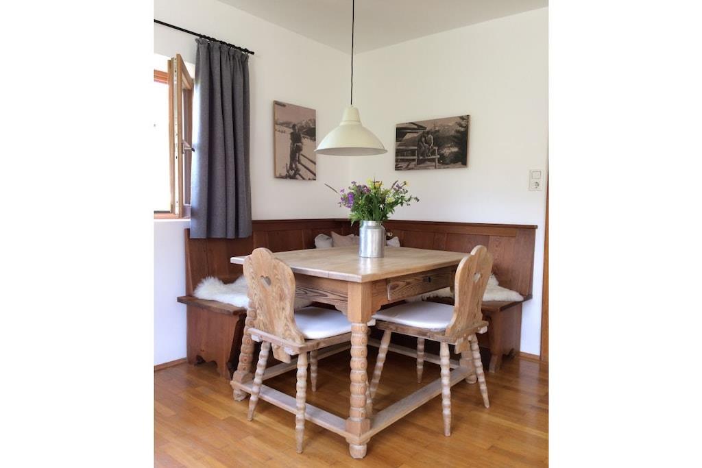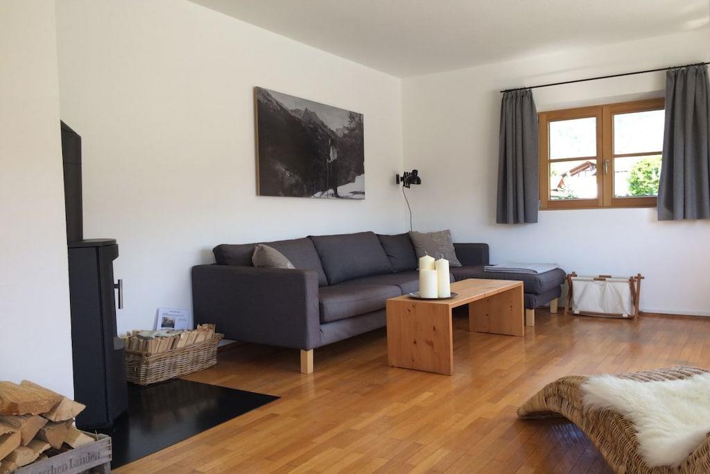 Die helle, gemütliche Ferienwohnung "Sepp" befindet sich im Hochparterre des Ferienhauses "Liesl & Sepp". Das kleine, komplett renovierte Häuschen liegt in ruhiger Ortsrandlage am Fuß der Ammergauer Alpen. Auf ca. 80 qm bietet die Wohnung mit vier Zimmern ein behagliches Zuhause, das den Charme einer Berghütte im Tal mit modernem, minimalistischem Stil verbindet. Der Parkettboden, die lichtdurchfluteten Räume und die gemütliche Stube mit direktem Zugang zum Garten schaffen eine einladende Atmosphäre. An kalten oder ungemütlichen Tagen sorgt der Schwedenofen im Wohnzimmer für wohlige Wärme. Die Wohnung verfügt über zwei separate Schlafzimmer, eine voll ausgestattete Küche mit Speisekammer sowie ein Bad mit Dusche. Von der Stube besteht direktet Zugang zum Garten. Dort kann man auf der Südterrasse bei einem Frühstück mit Bergblick den Tag beginnen oder nach einer Bergtour auf der Liege unter den Apfelbäumen die Seele baumeln lassen. Das Liesl & Sepp ist der ideale Ausgangspunkt zu zahlreichen, Wander- und Radtouren in den wunderschönen Ammergauer Alpen, zu denen Sie direkt vor der Haustür starten können. An heißen Sommertagen sorgen die zahlreichen Seen mit Bergpanorama in unmittelbarer Umgebung für Abkühlung. Im Winter lädt, bei ausreichender Schneelage, die Loipe direkt vor dem Haus zu ausgedehnten Langlaufskitouren ein. Schneesichere Skigebiete sind in etwa 30 Minuten erreichbar, sodass Sie auch bei winterlichem Wetter vielfältige Freizeitmöglichkeiten genießen können. Sportequipment kann bequem in der abschließbaren Garage oder in der Hütte untergebracht werden.