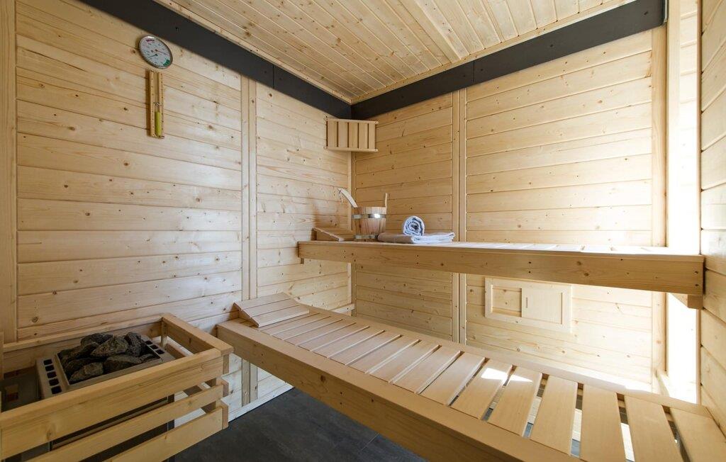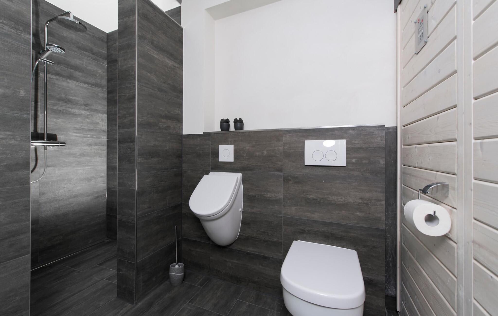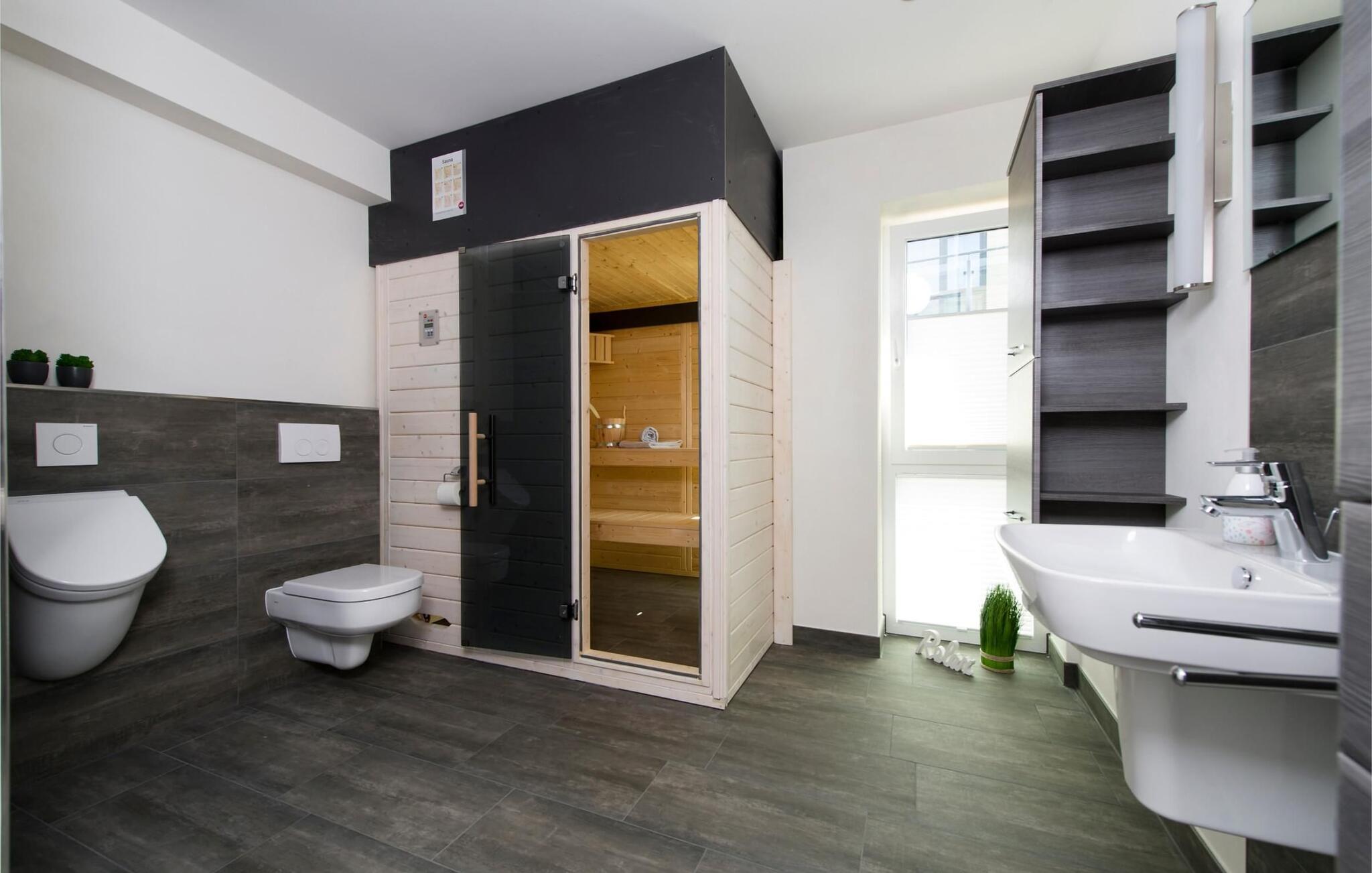 Das Hauptbadezimmer bietet neben einer bodengleichen Dusche auch ein persönliches Spa-Programm, denn die große finnische Sauna sorgt für Wellnessmomente.