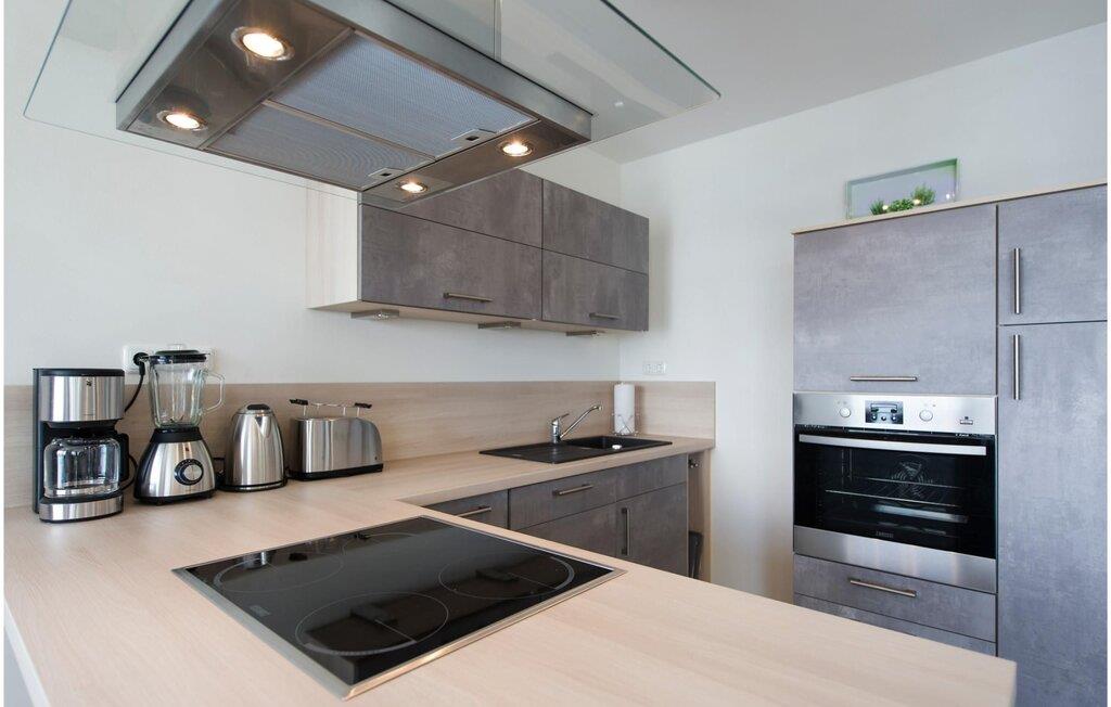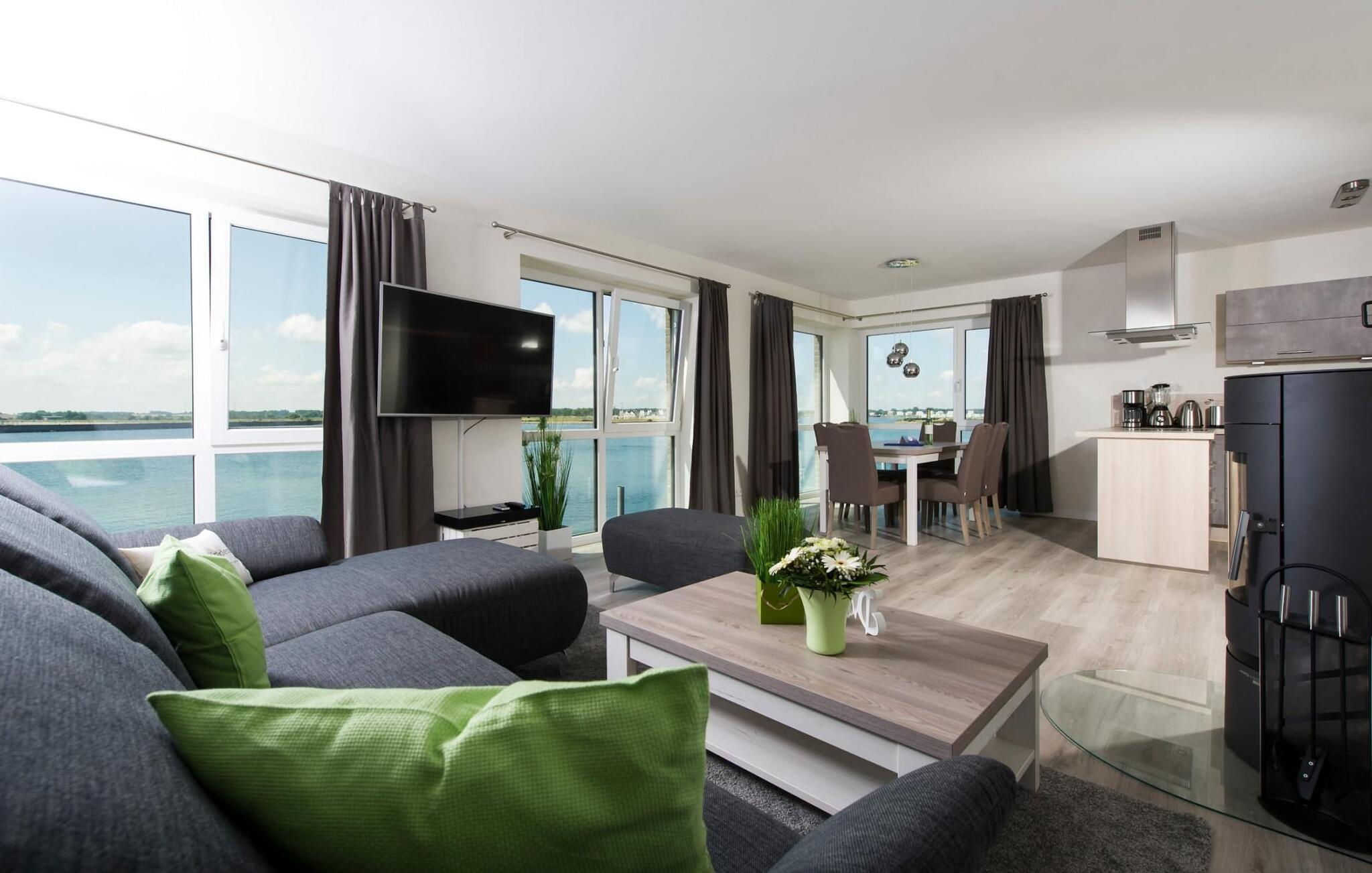Der großzügige und lichtdurchflutete Wohn- /Essbereich stellt den Mittelpunkt der Ferienwohnung dar und überzeugt mit bodentiefen Fenstern, einer gemütlichen Sitzlandschaft und einem großen Esstisch, alles vor einzigartiger Wasserkulisse. Die offen gestaltete Küche bietet an hochwertiger Technik und Ausstattung alles, was das Kochherz begehrt.