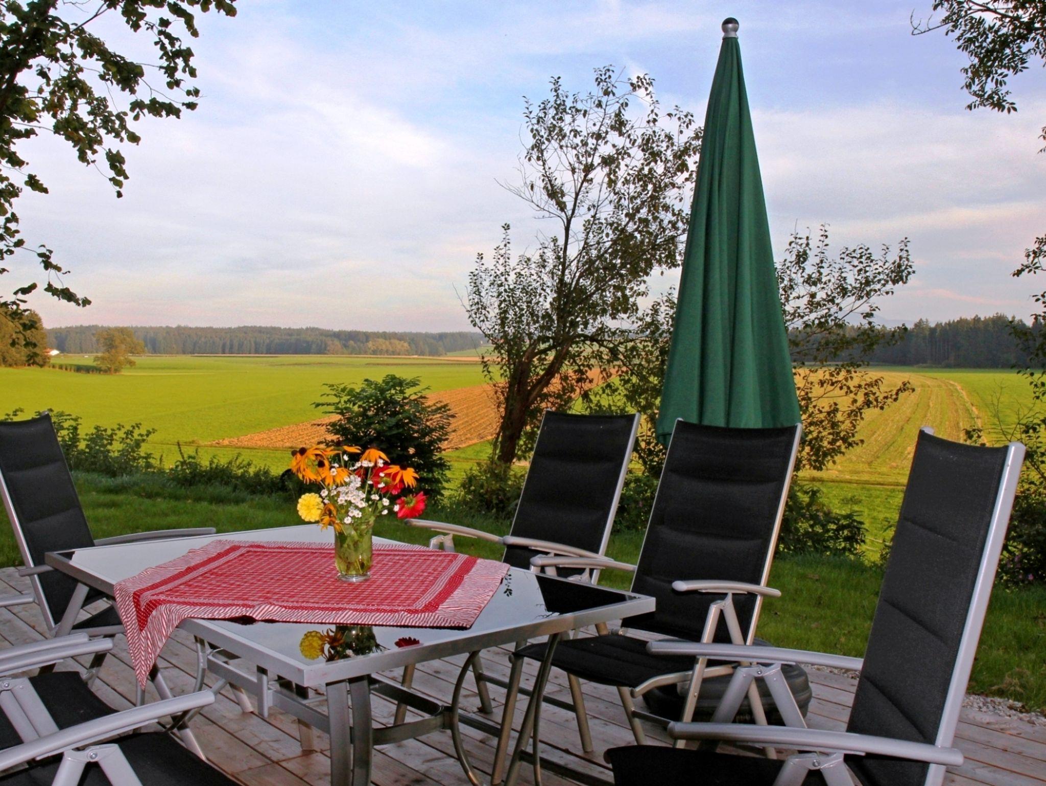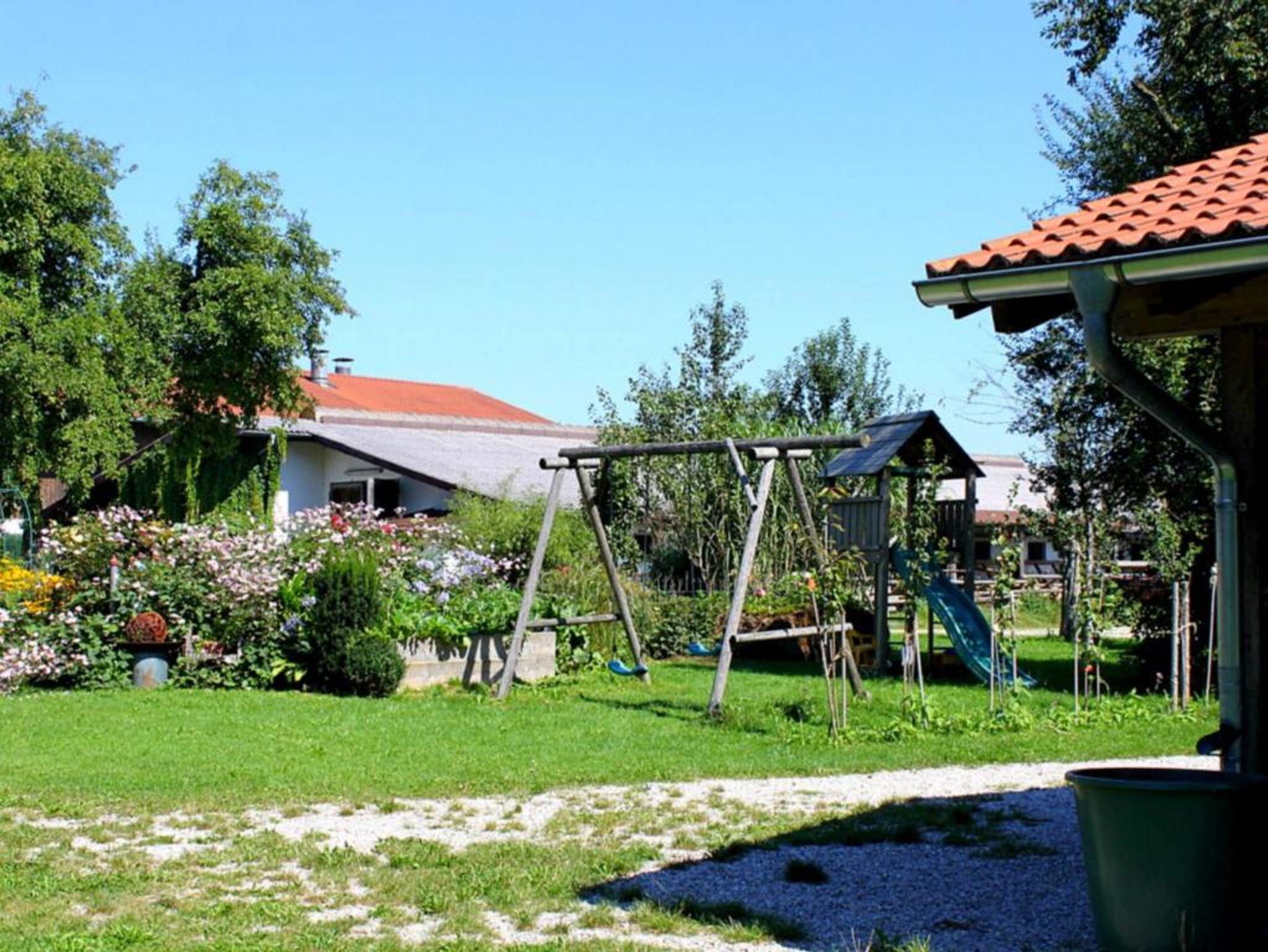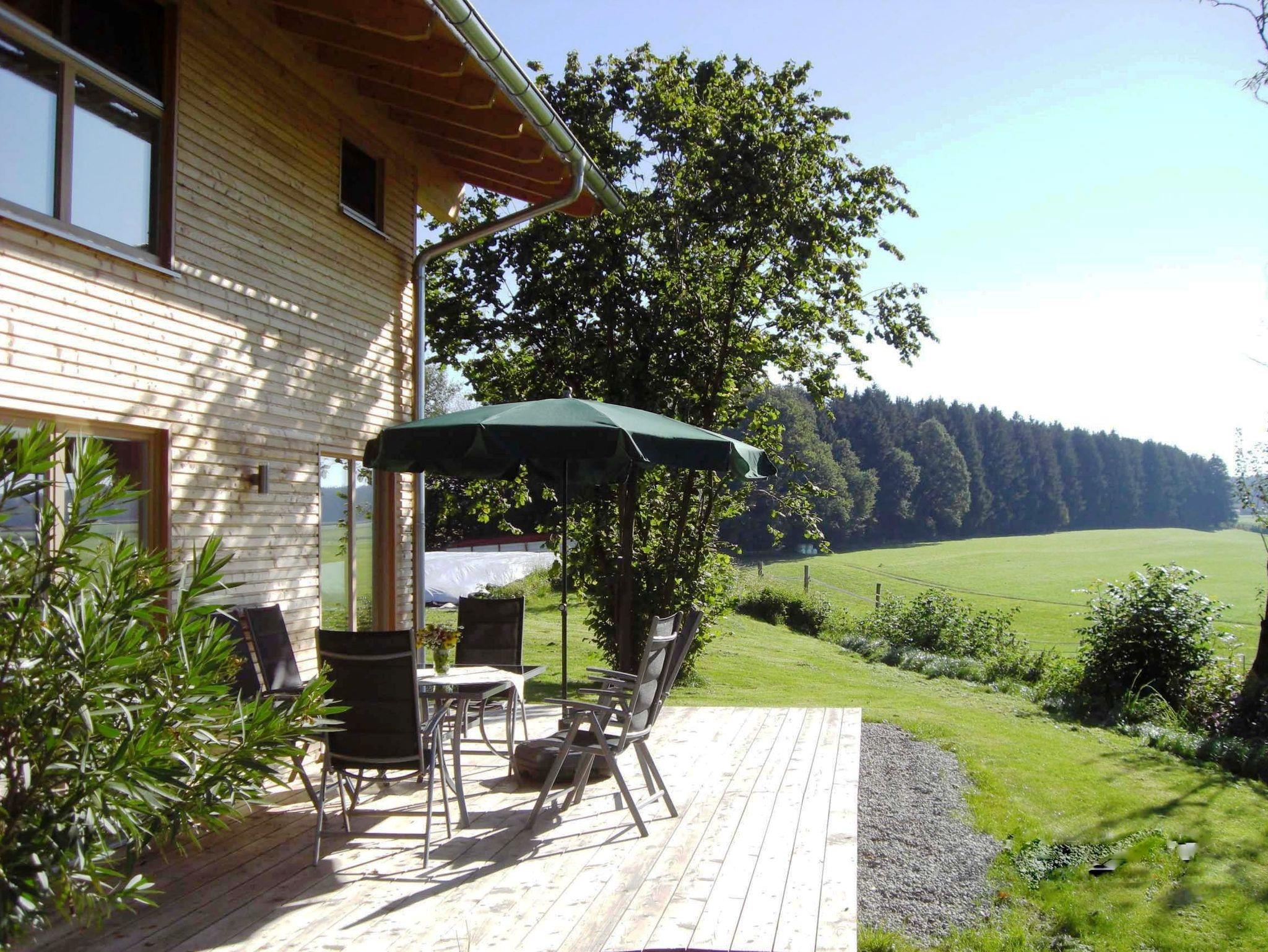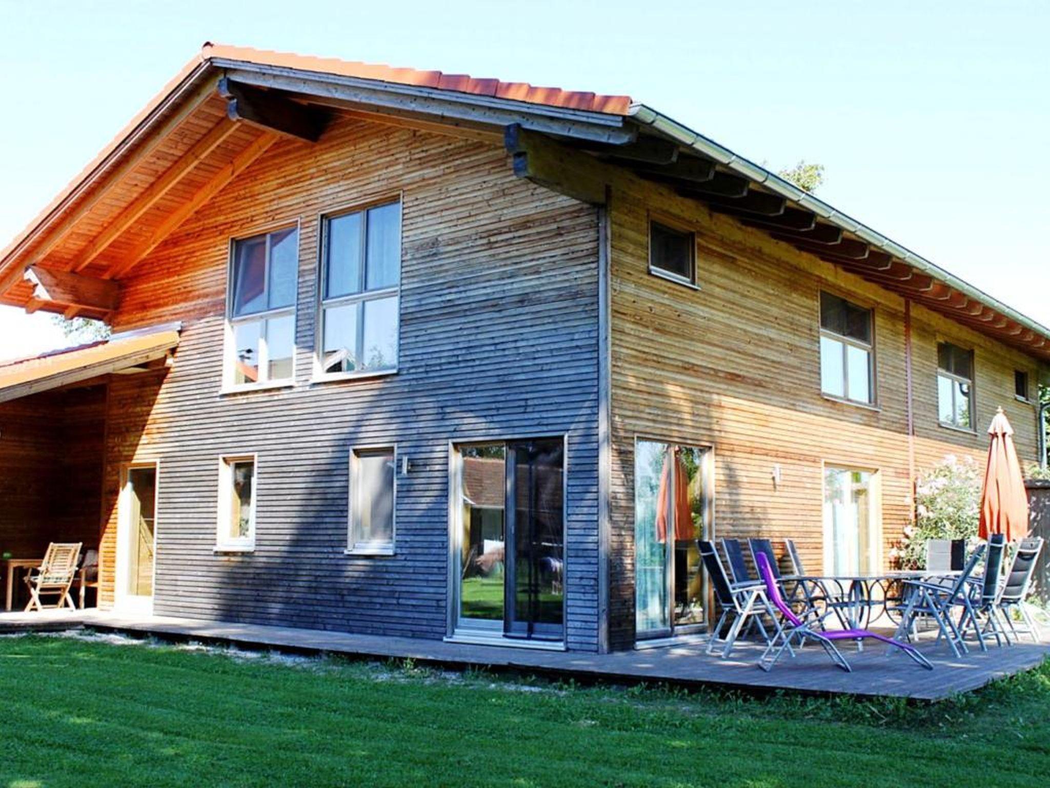 Komfortables ökologisch gebautes Holzhaus mit drei Schlafzimmer, großzügiger Wohnbereich mit vollausgestatteter Küche, eigene Waschmaschine, TV, W-Lan und großer Holzterrasse mit freien Blick auf die Chiemgauer Alpen. Demeter Bio-Bauernhof, Kinderfuhrpark, Spielwiese für Federball, Volleyball, Fußball, Trampolin und Lagerfeuer mit Grillplatz.Ausreichend Sitzgarnituren und einen wunderschönen Bauerngarten mit vielen verschiedenen Kräutern,- Blumen und Gemüse.