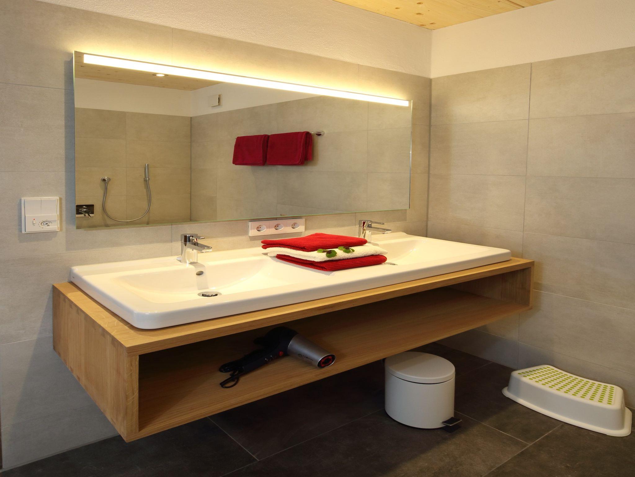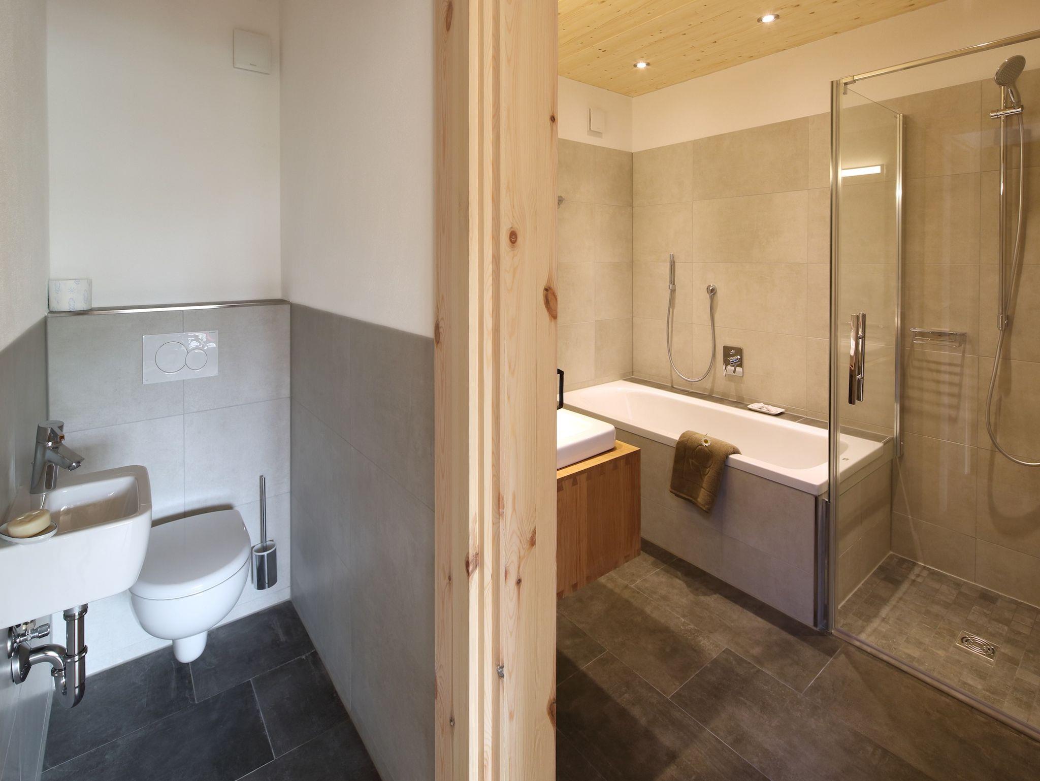 Schönes Bad mit zwei Waschbecken, großem Spiegel, Badewanne und Dusche, separate Toilette;