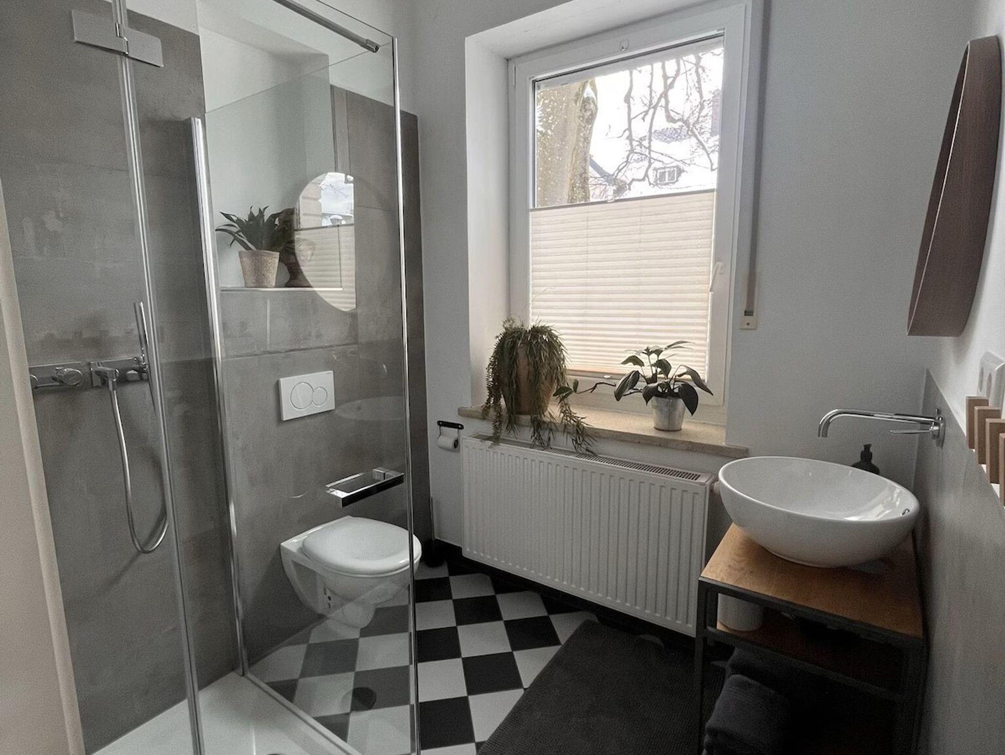 1 Badezimmer mit Dusche, Toilette, Waschbecken