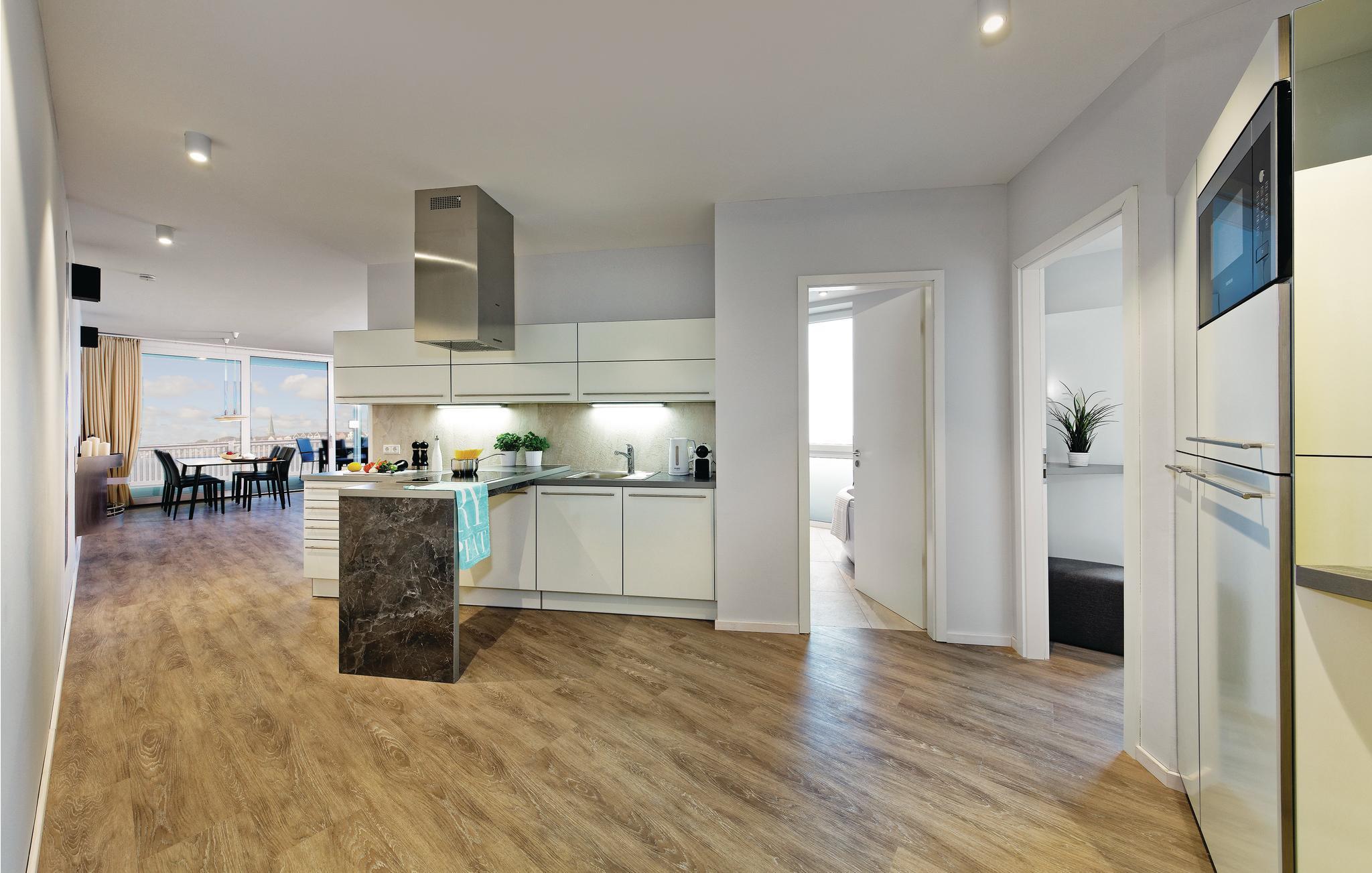 Das Penthouse ist stilvoll, hochwertig und modern eingerichtet. Ein besonderes Highlight ist das Bad, Ihr persönlicher kleiner Wellnessbereich mit Sauna, Whirlpool und Dampfbad mit integrierter Doppelregendusche. Dieses Badezimmer ist durch das zweite Schlafzimmer zu erreichen. Das Wohlfühlprogramm setzt sich im Wohnbereich fort, denn die flackernden Flammen des Kaminofens tauchen den Raum in ein besonders gemütliches Licht. Das Sofa lässt sich mit wenigen Handgriffen in zwei bequeme Schlafmöglichkeiten umwandeln.
