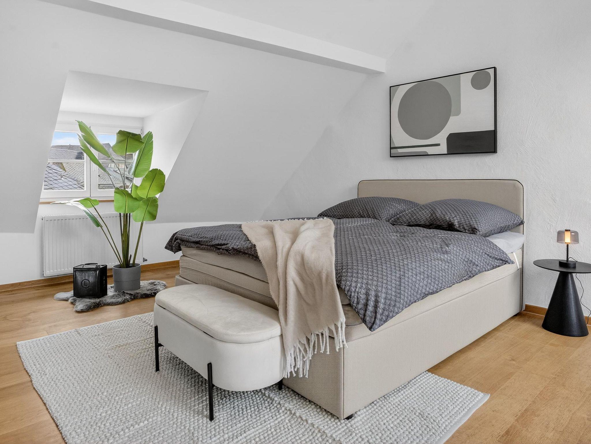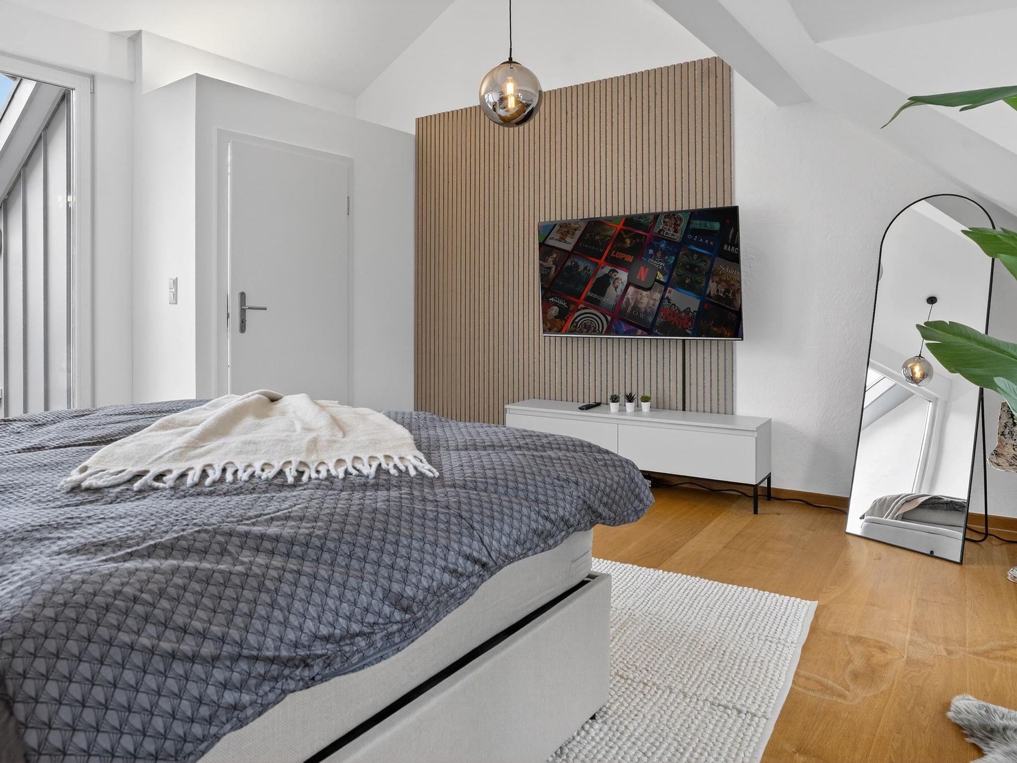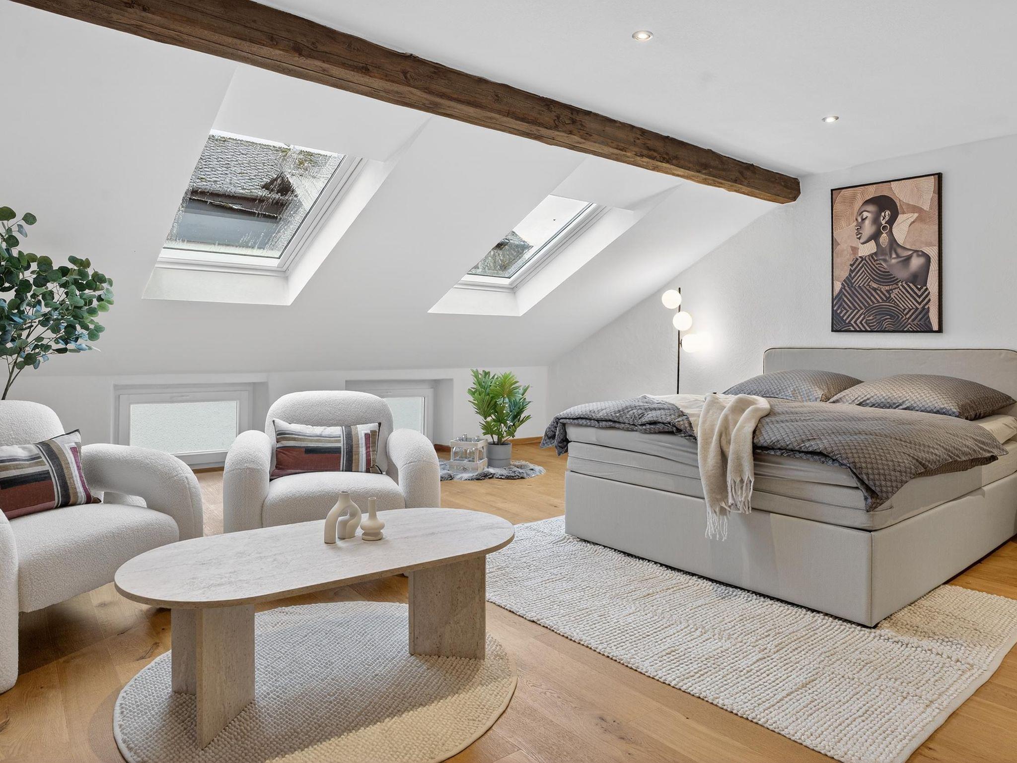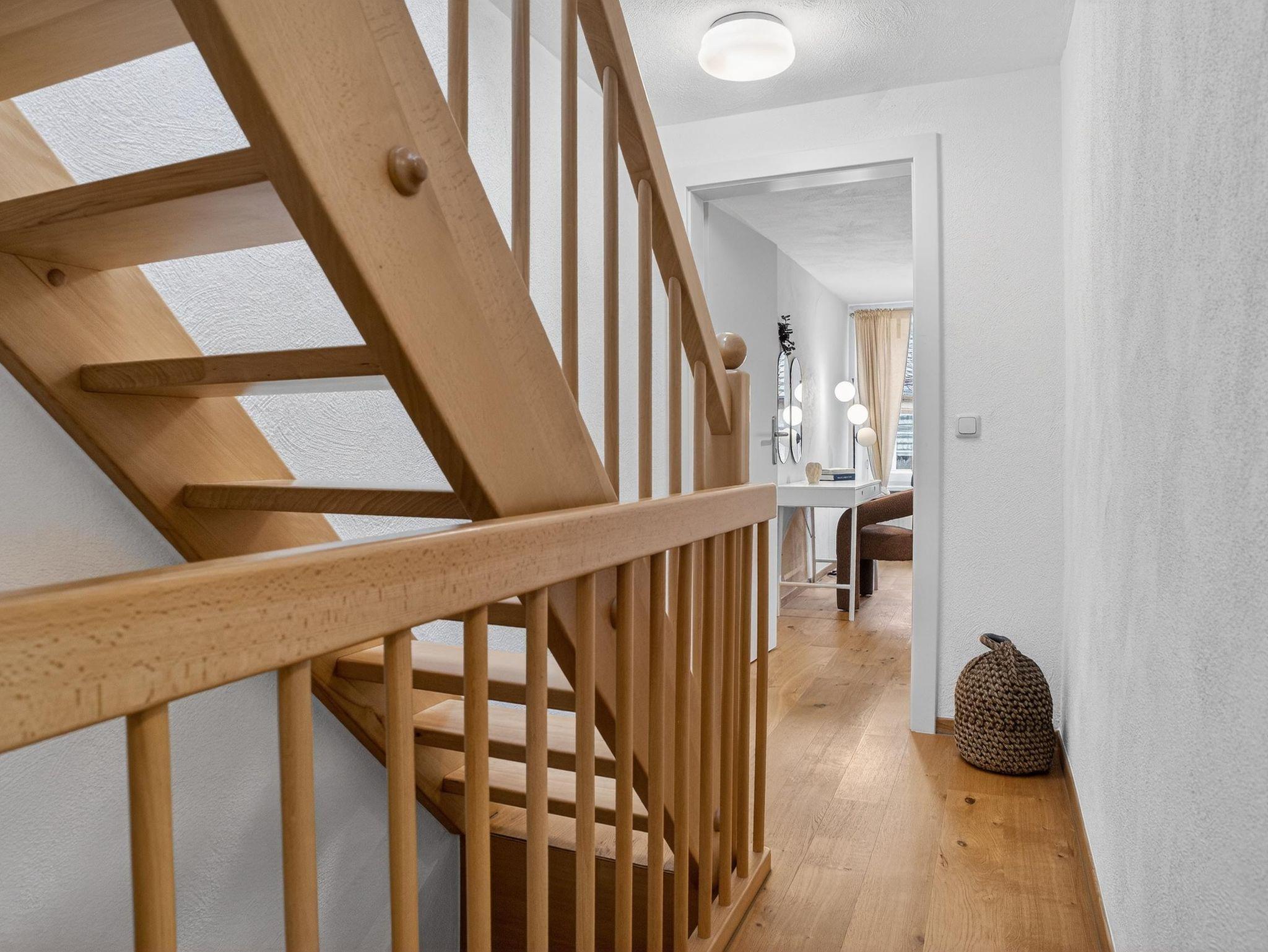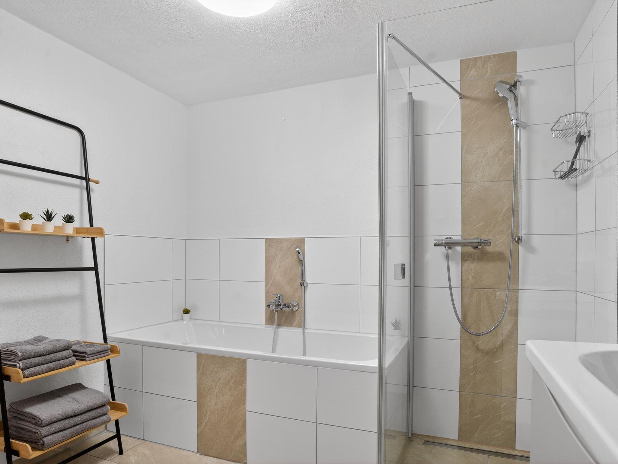 Ein besonderes Highlight ist die Dachterrasse mit herrlichem Blick über die Dächer von Saarburg und auf die umliegenden Weinberge. Zudem stehen Ihnen zwei moderne Bäder (1 x mit Badewanne) zur Verfügung.