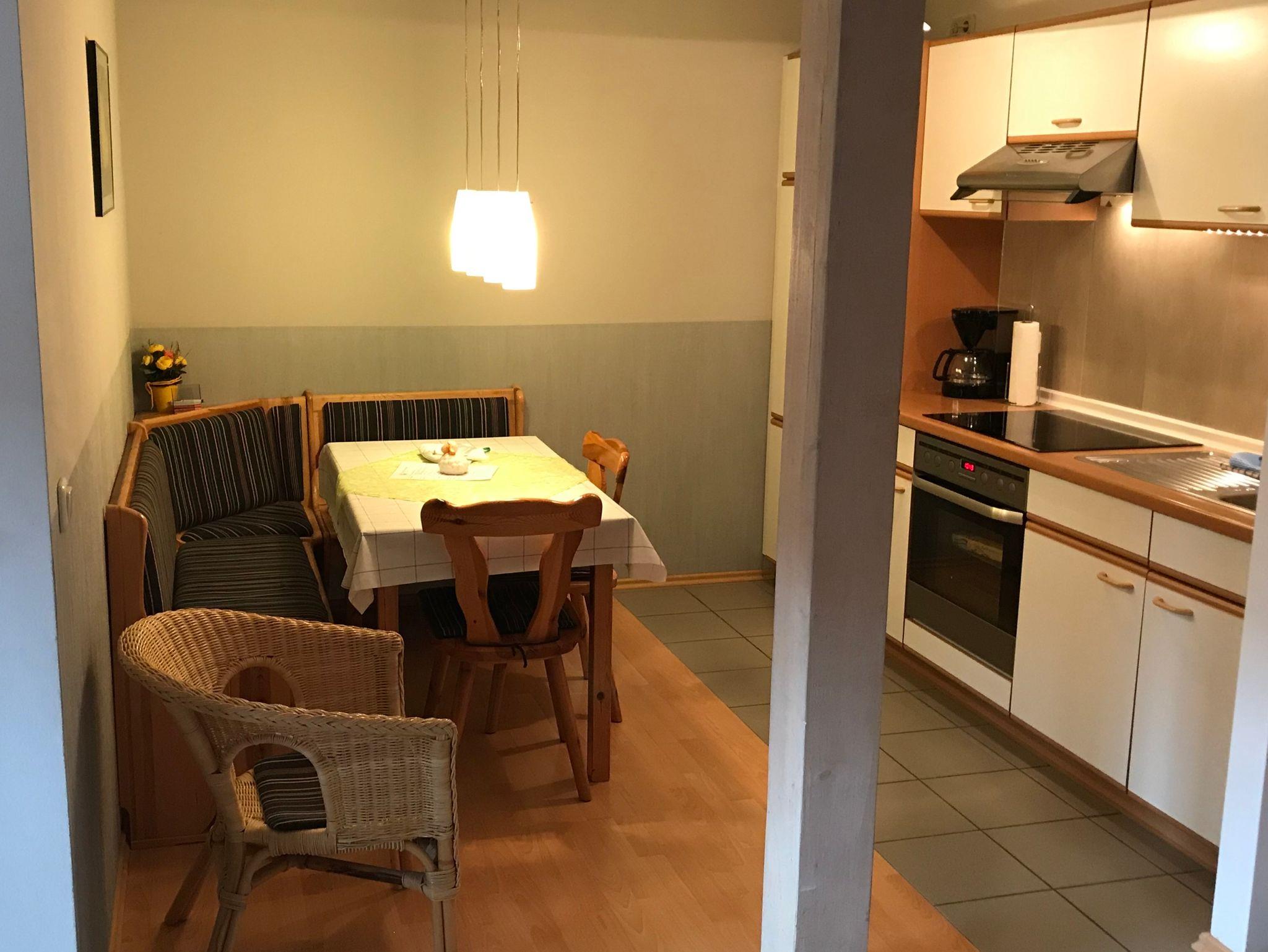 In der Küche ist ein gemütlicher Essplatz mit Eckbank und Stühlen für die ganze Familie.