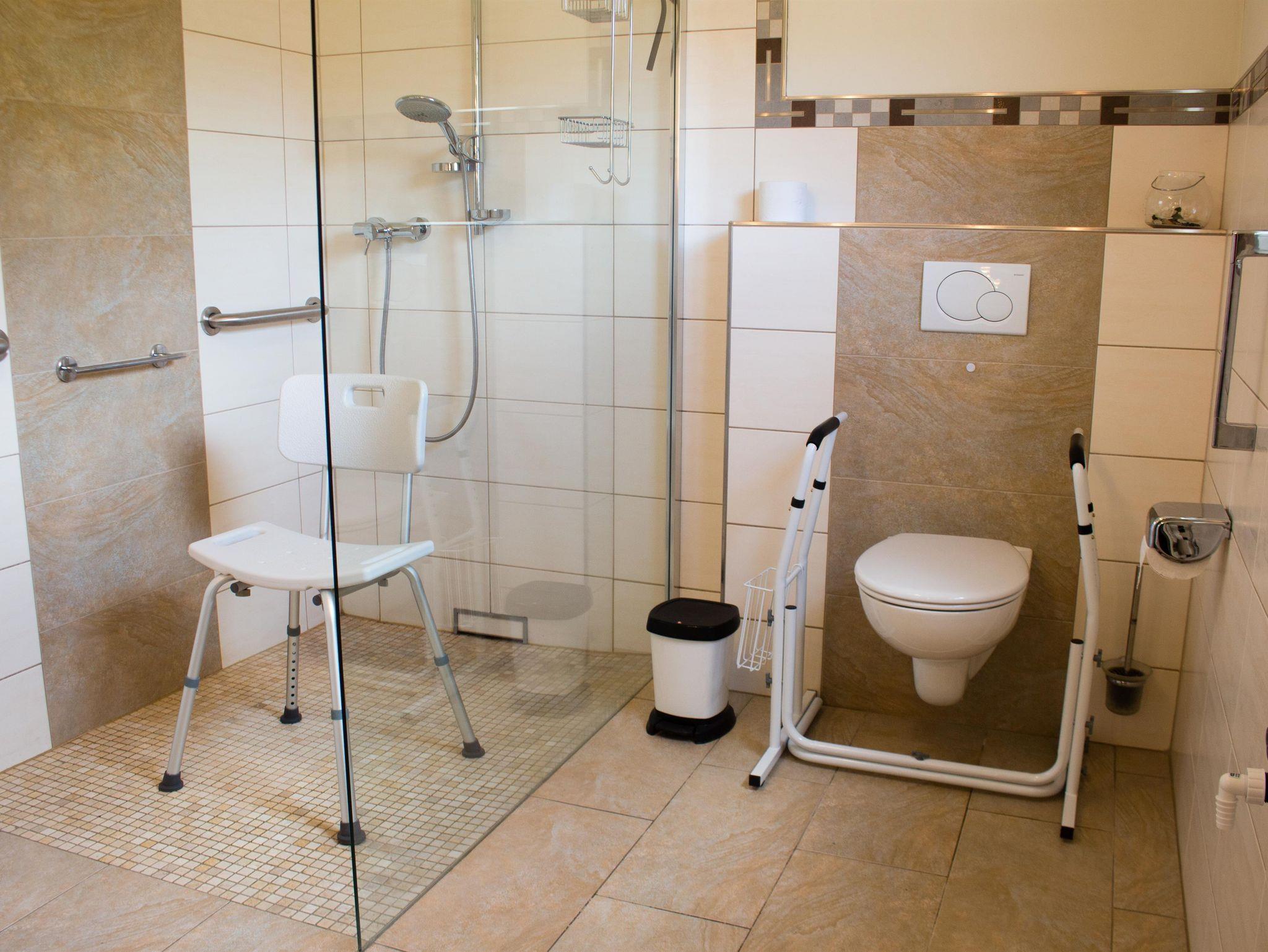 Im großen Bad befindet sich eine ebenerdige befahrbare Dusche. Es gibt zwei Waschgelegenheiten, eine davon ist unterfahrbar.