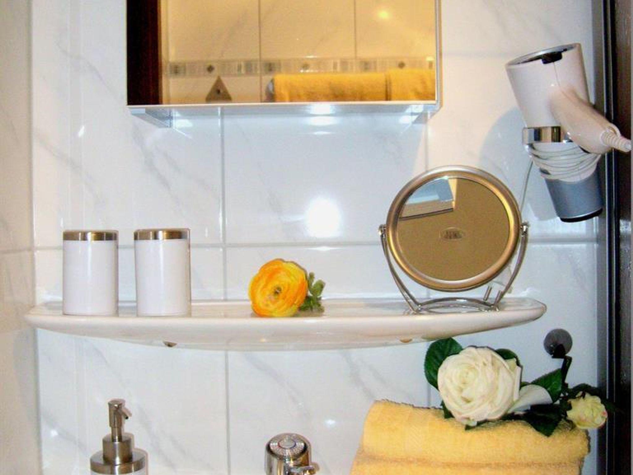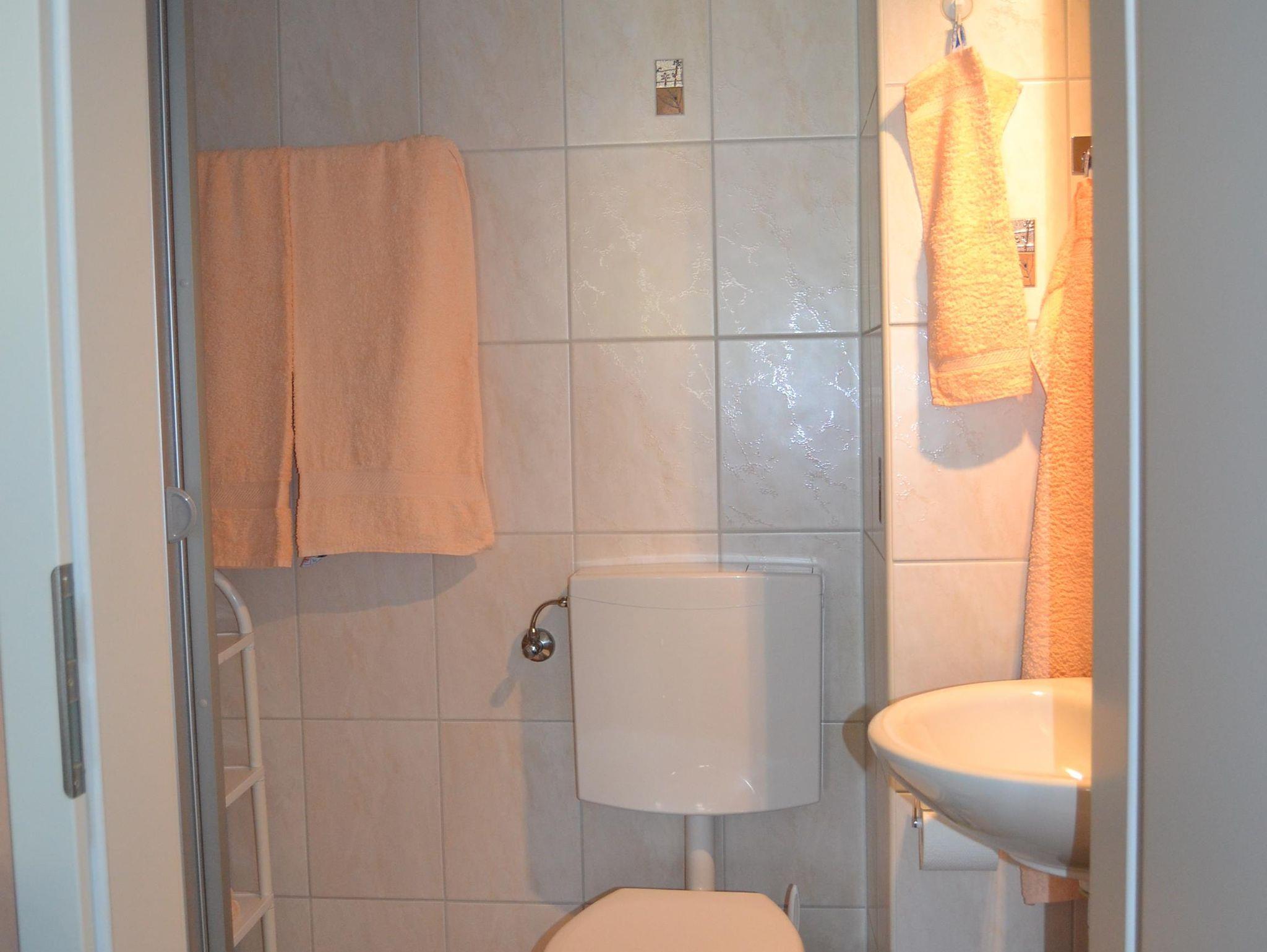 Doppelzimmer mit Dusche und WC, Küchenzeile, Sitzecke, Radio, SAT-TV, Toaster, Minibackofen, Wasserkocher, Föhn, Bettwäsche, Hand- und Küchentücher. Auf Wunsch auch Brötchenservice.