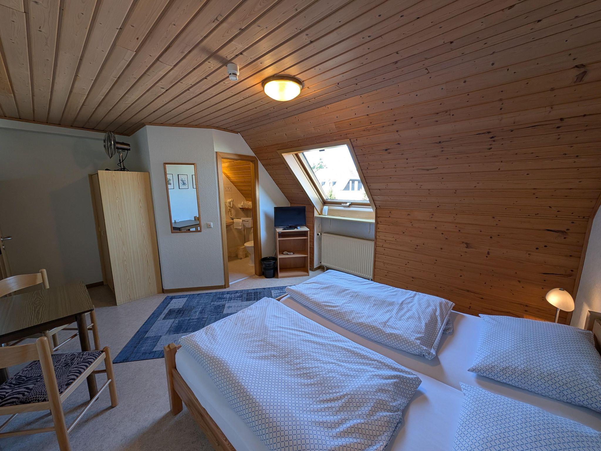 Doppelzimmer mit Dusche/WC, allergikerfreundlich, W-LAN, Flachbild-Sat-TV, Nichtaucherzimmer, Sitzecke. Zimmer zur Straßenseite. (2. Etage Dachgeschoß)
