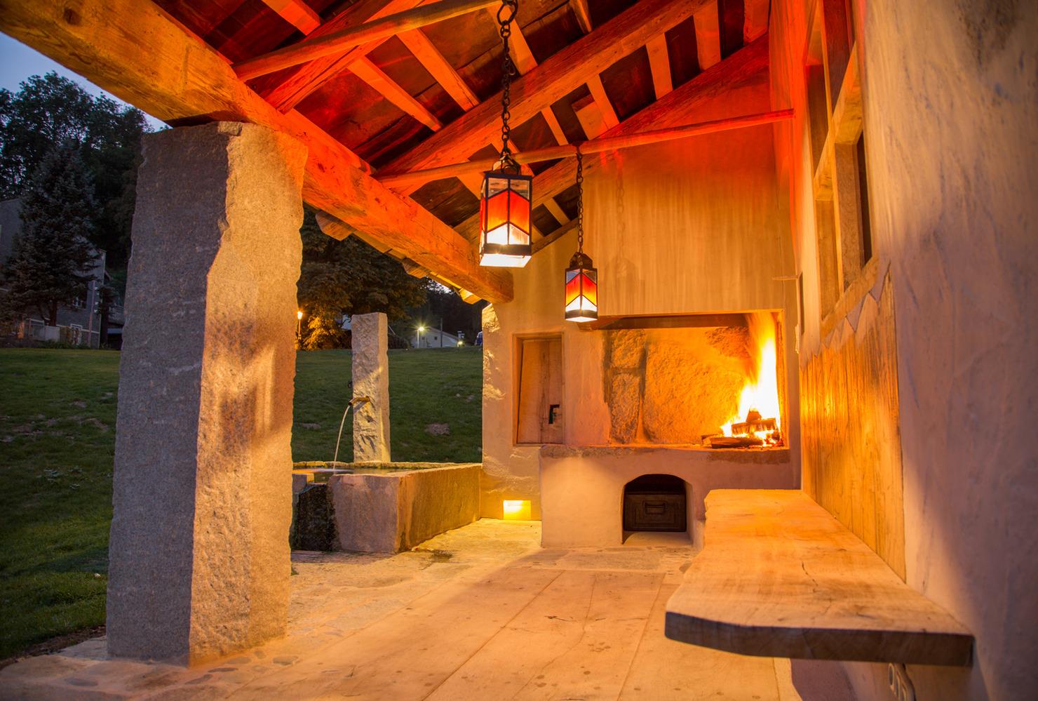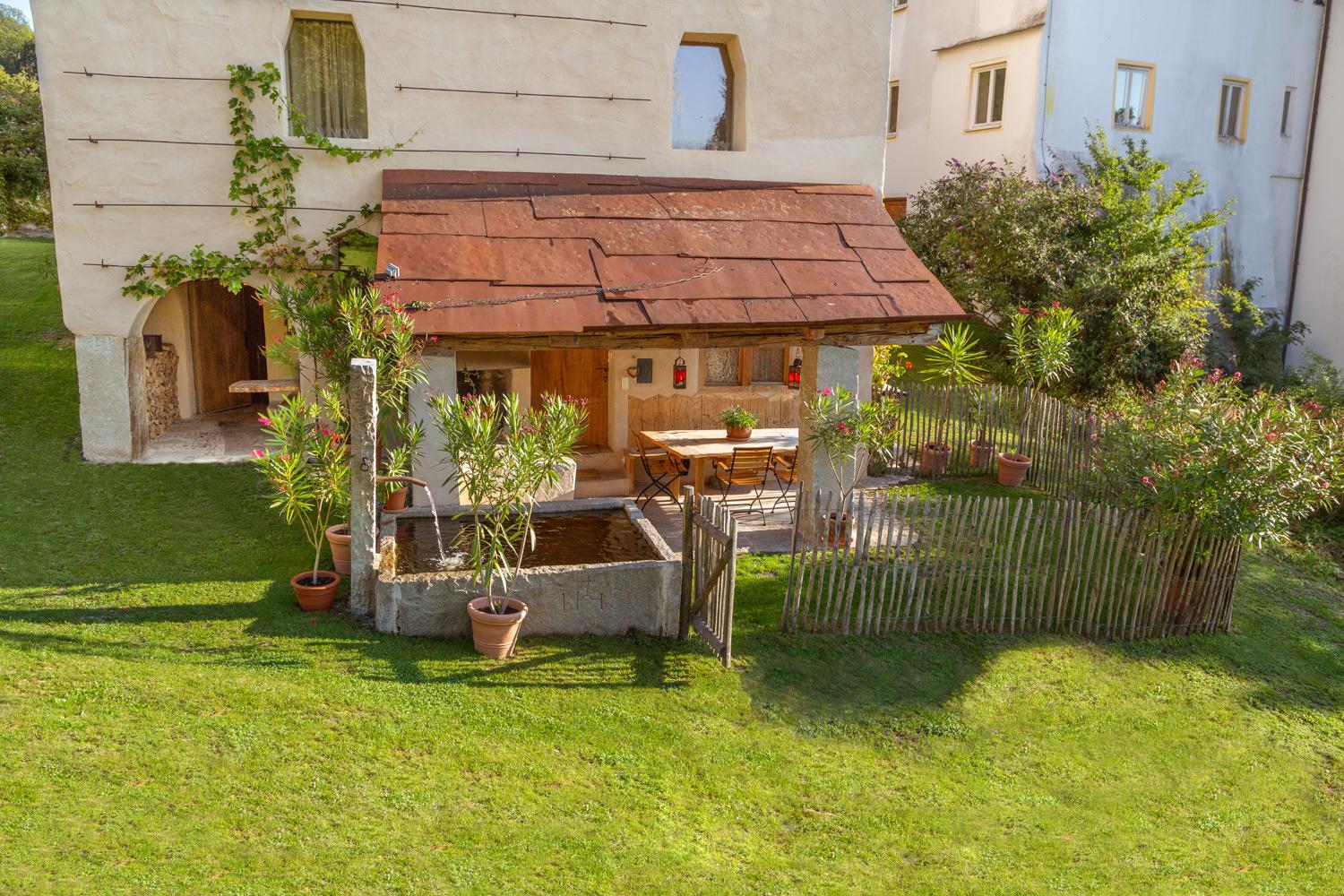Der private Garten mit idyllischem Freisitz und überdachter Terrasse, Natursteinbrunnen und offener Feuerstelle ist ein einzigartiger Platz für gemütliche Frühstücke und lauschige Abende bei Kaminfeuer.