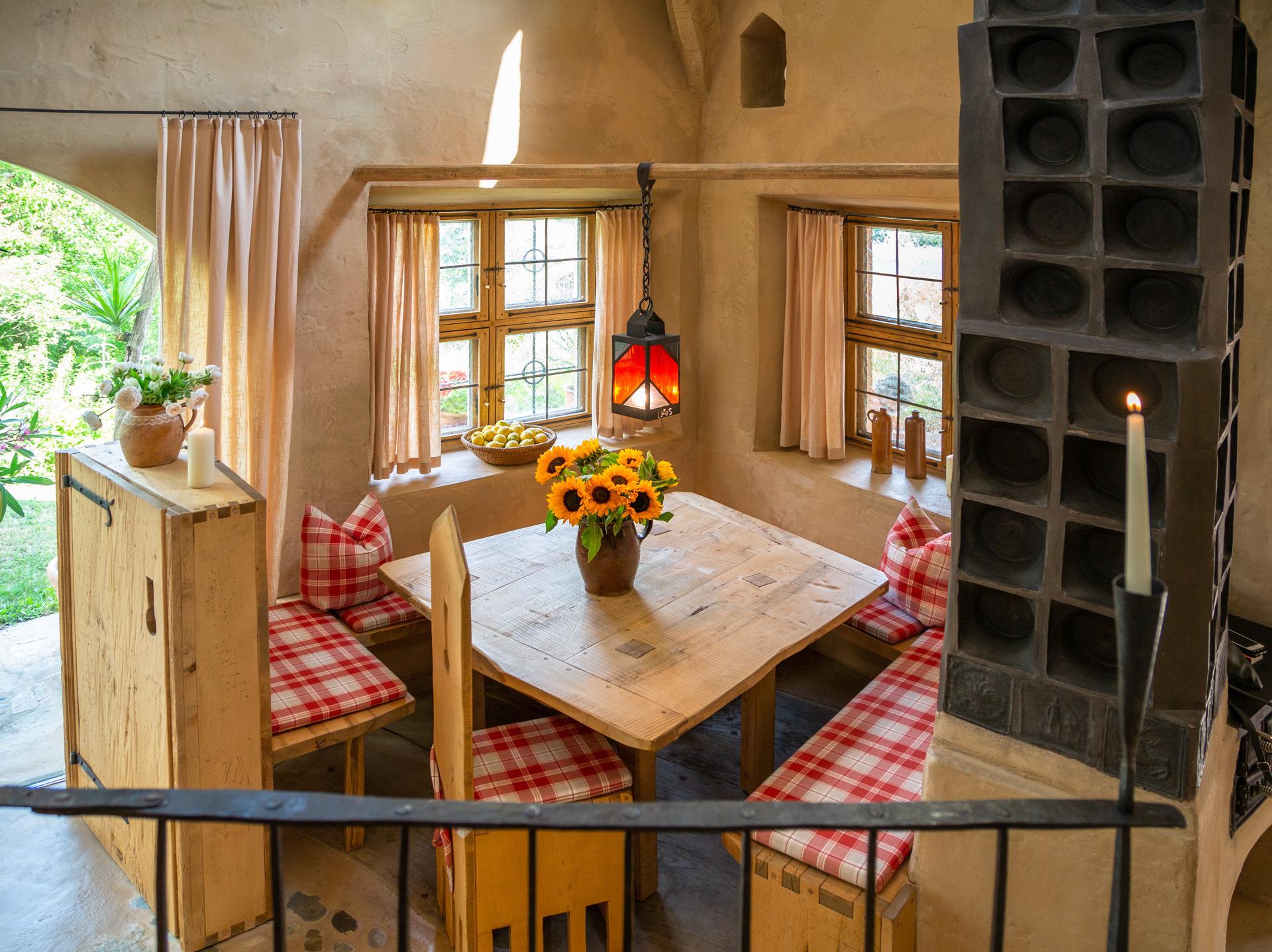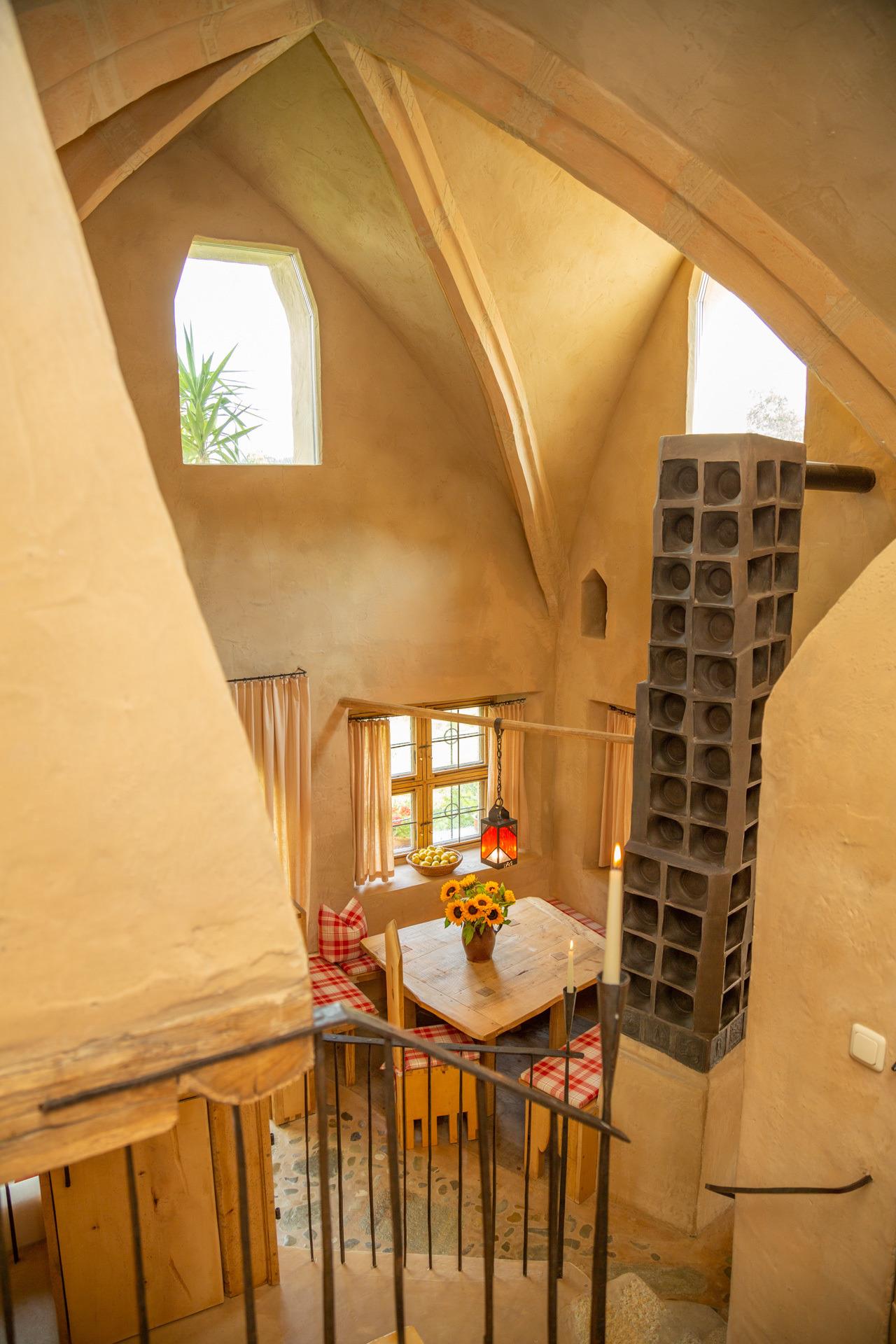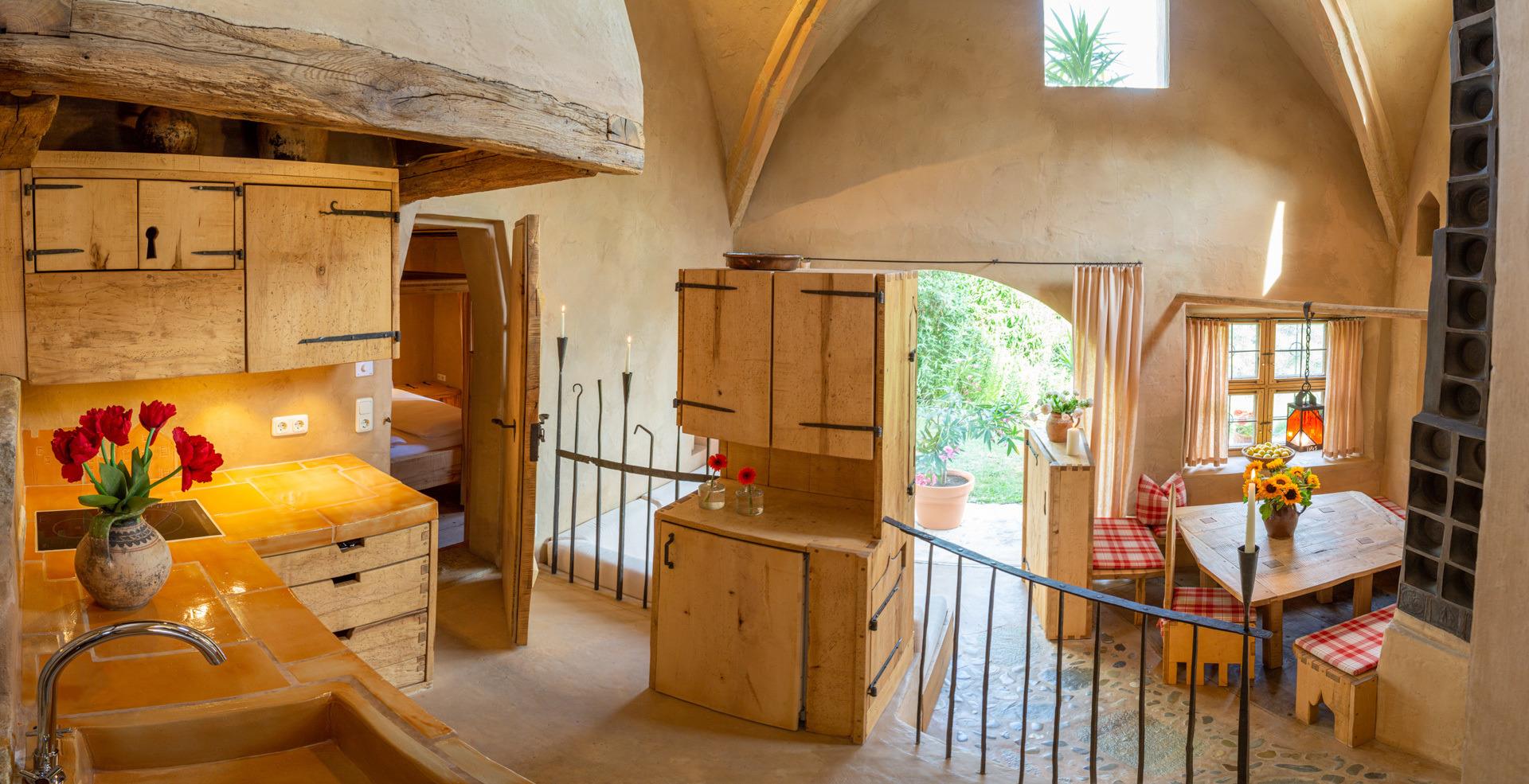 Der offene Wohnbereich mit Essplatz und einem Kachelofen, der in den Himmel zu ragen scheint, einer Sitzecke vor einem großen Glaselement mit wunderbarem Ausblick und einer Kochinsel unter einer imposanten gemauerten Kutte, wird überspannt von einem archaischen gotischen Kreuzrippengewölbe.