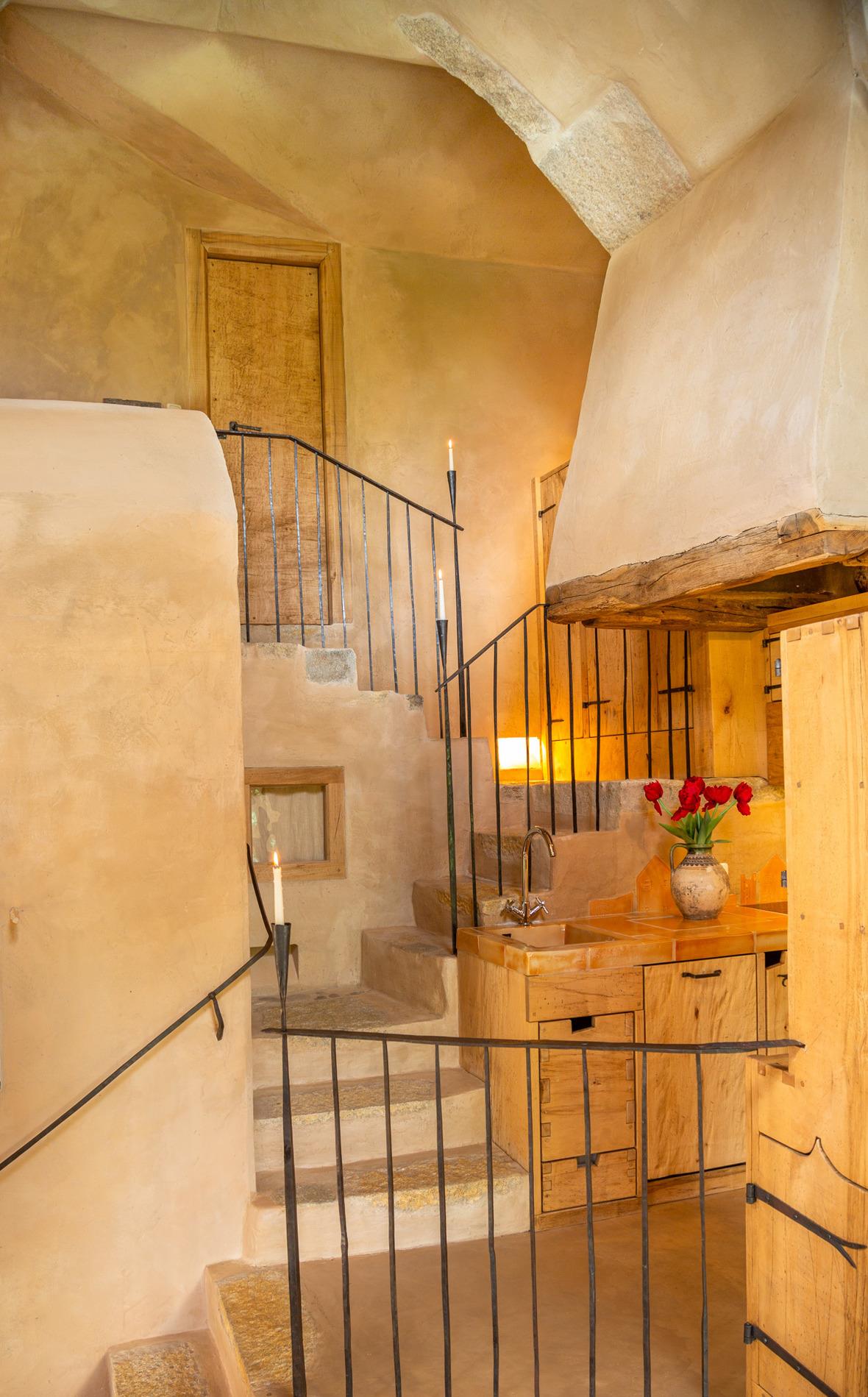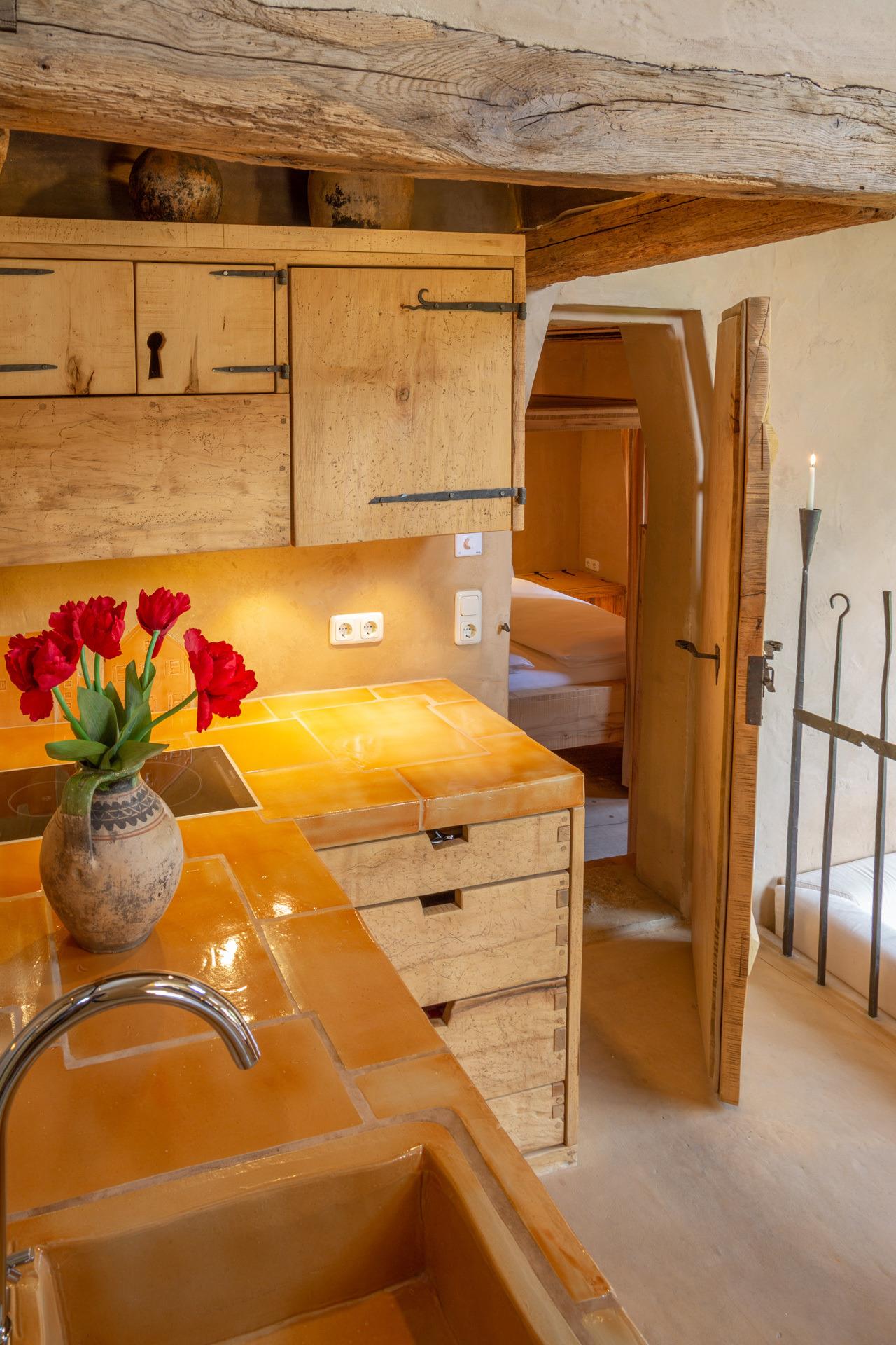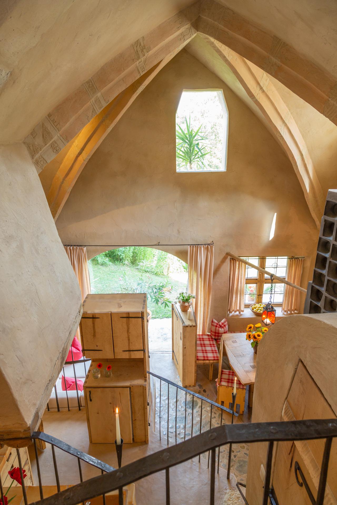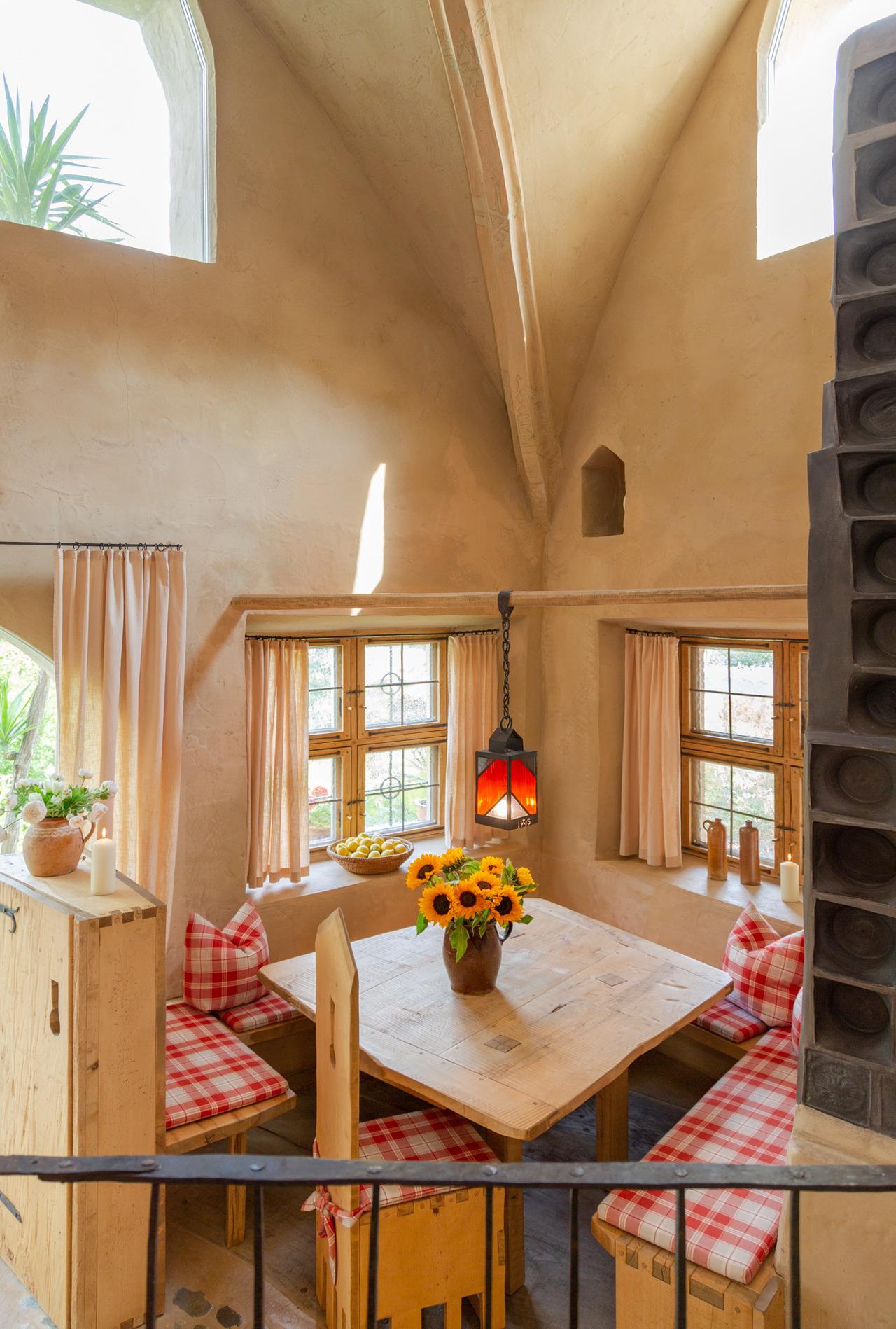 Der offene Wohnbereich mit Essplatz und einem Kachelofen, der in den Himmel zu ragen scheint, einer Sitzecke vor einem großen Glaselement mit wunderbarem Ausblick und einer Kochinsel unter einer imposanten gemauerten Kutte, wird überspannt von einem archaischen gotischen Kreuzrippengewölbe.