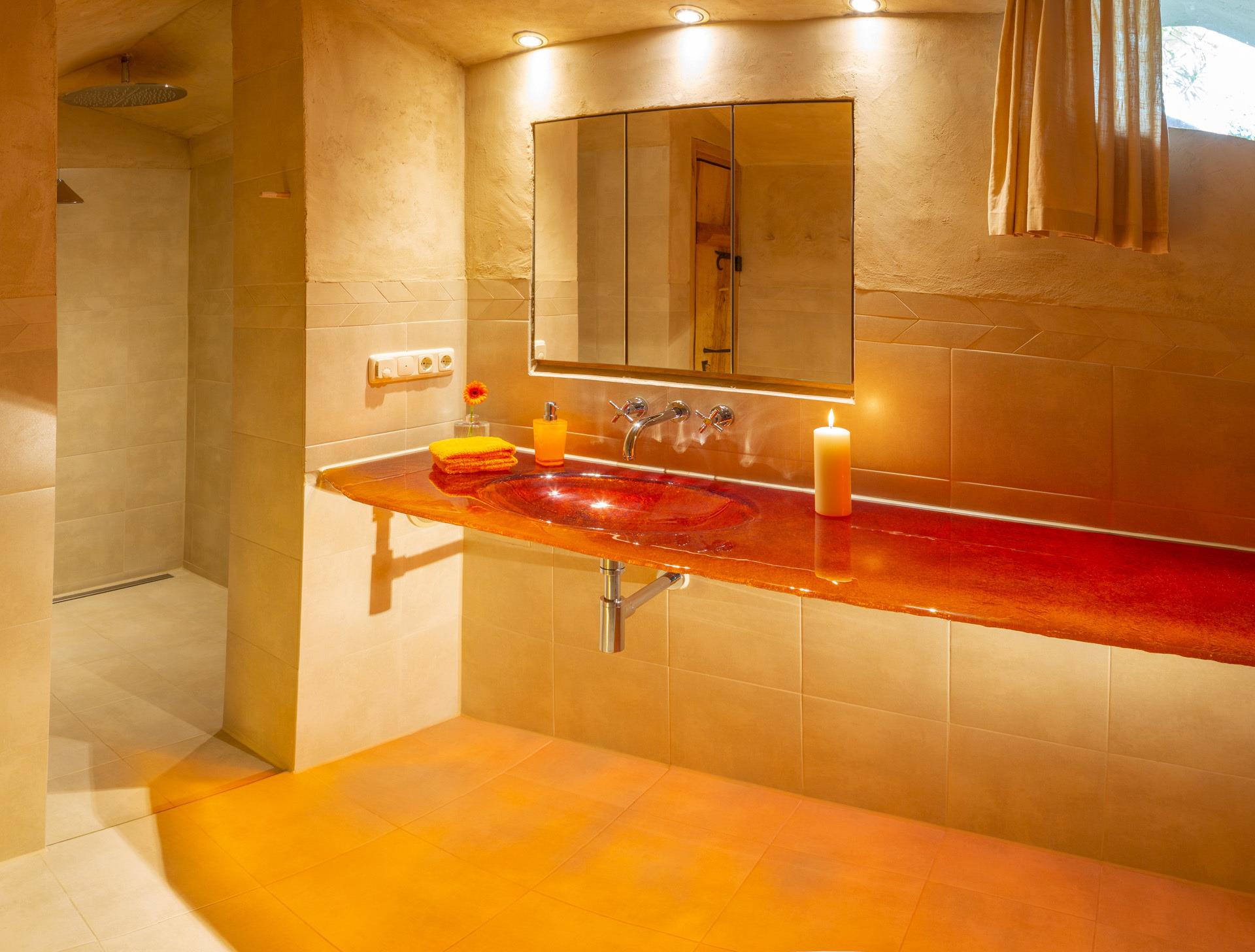 Ein weiteres Schlafzimmer mit Himmelbett und Sitznische ist im Erdgeschoss und verfügt über direkten Zugang zu dem zweiten Badezimmer, das großzügig angelegt und mit Regendusche, rot eingefärbtem Glaswaschtisch und Wickelablage für die Kleinen ausgestattet ist.