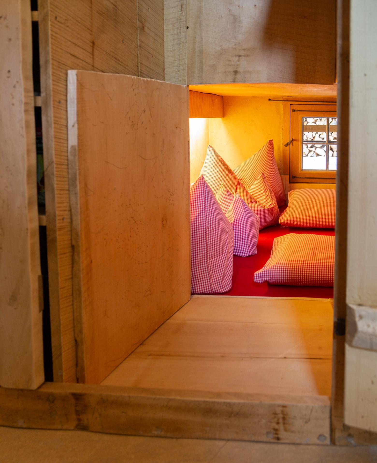 In einer Gewölbekuppel befindet sich auf zwei Ebenen das Reich der kleinen Gäste. Mit Sitzecke, Buffet und Kachelofen im kindgerechten Maßstab, Geheimgang und zwei Schlafhöhlen ist es ein spannender Raum zum Spielen und Schlafen.