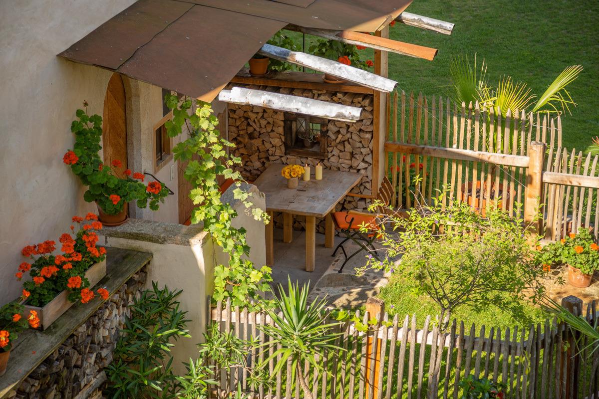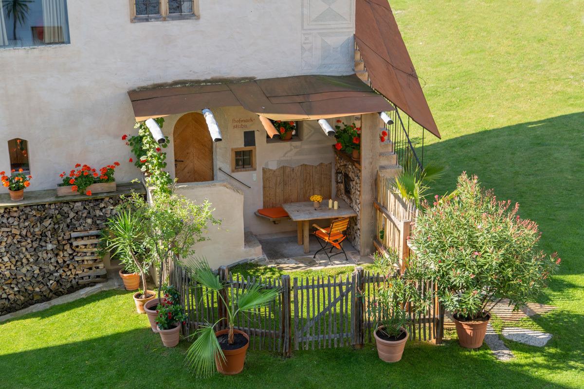 Besonders reizvoll sind der eigene Garten und der Freisitz der Hofmarkstubn. Der Freisitz, überdacht mit altem Blech und eingerahmt von aufgerichtetem Brennholz, ist ein lauschiges Plätzchen zum Genießen und Wohlfühlen.