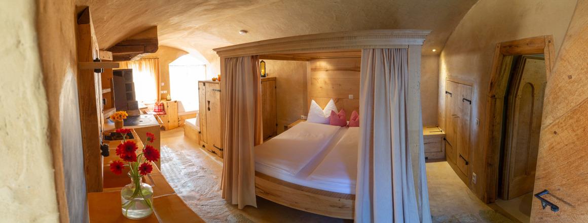 Die Hofmarkstubn im mittelalterlichen Kreuzgradgewölbe mit romantischem Himmelbett ist ein traumhaftes Domizil für zwei Personen. Der gemütliche Essbereich, die wunderschöne Sitzecke vor dem Glaselement und der heimelige Kachelofen machen das Wohlfühlambiente perfekt.