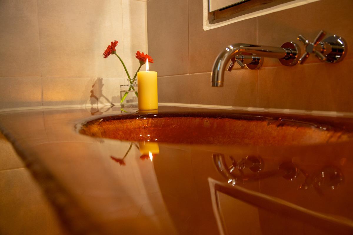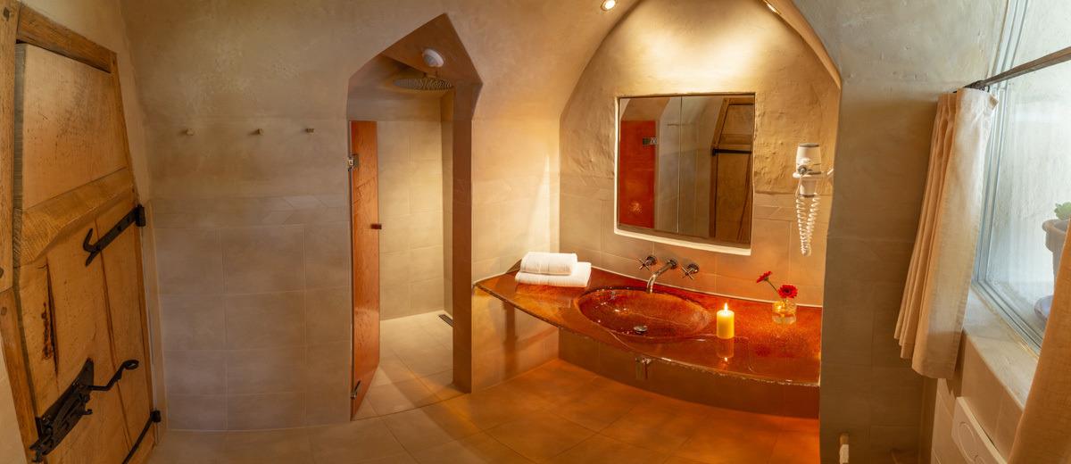Das Badezimmer im markanten Gewölbe verwöhnt mit Regendusche und brillanten Farbspiel der leuchtenden Rottöne von Waschtisch und Dusche.