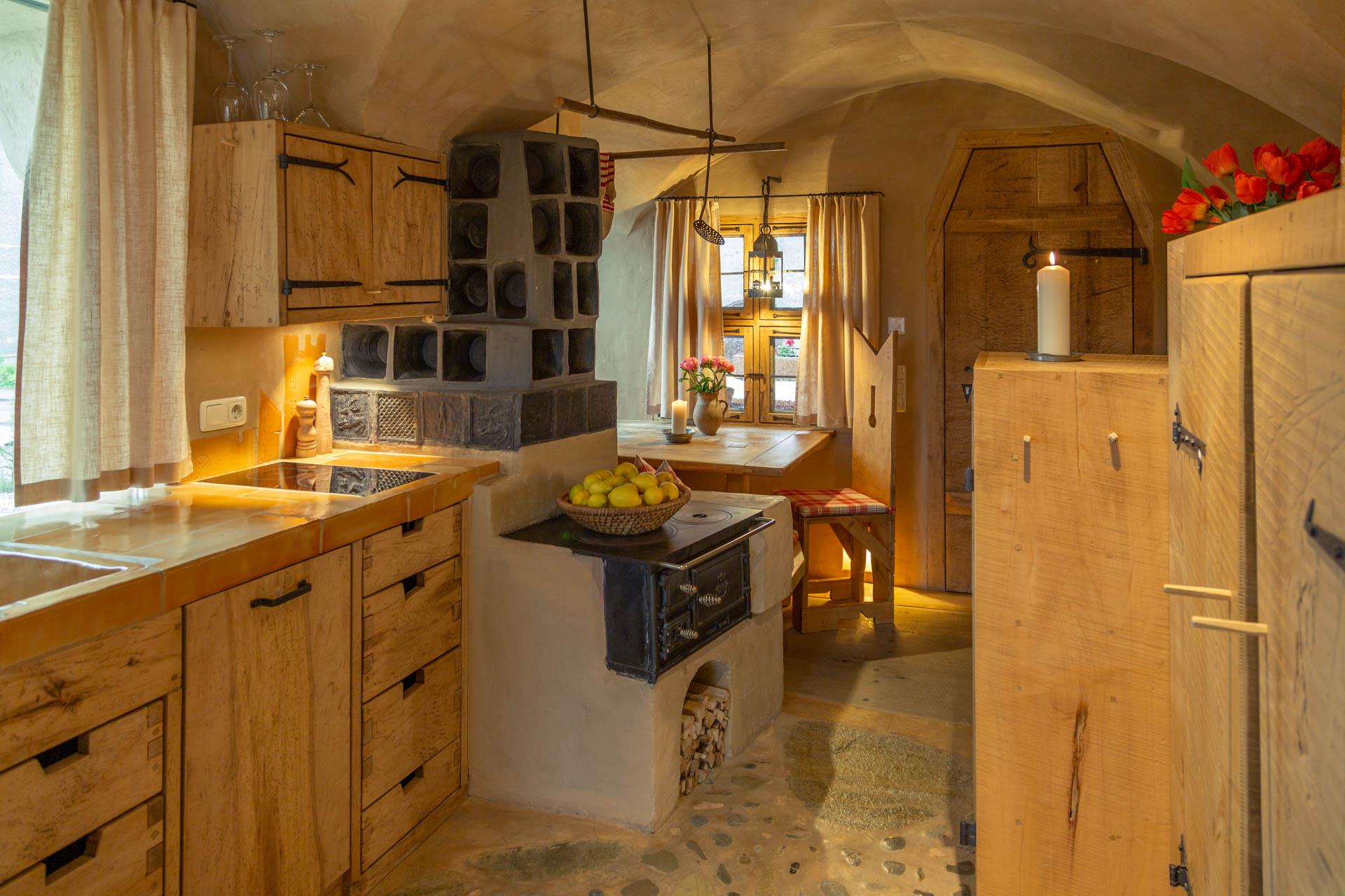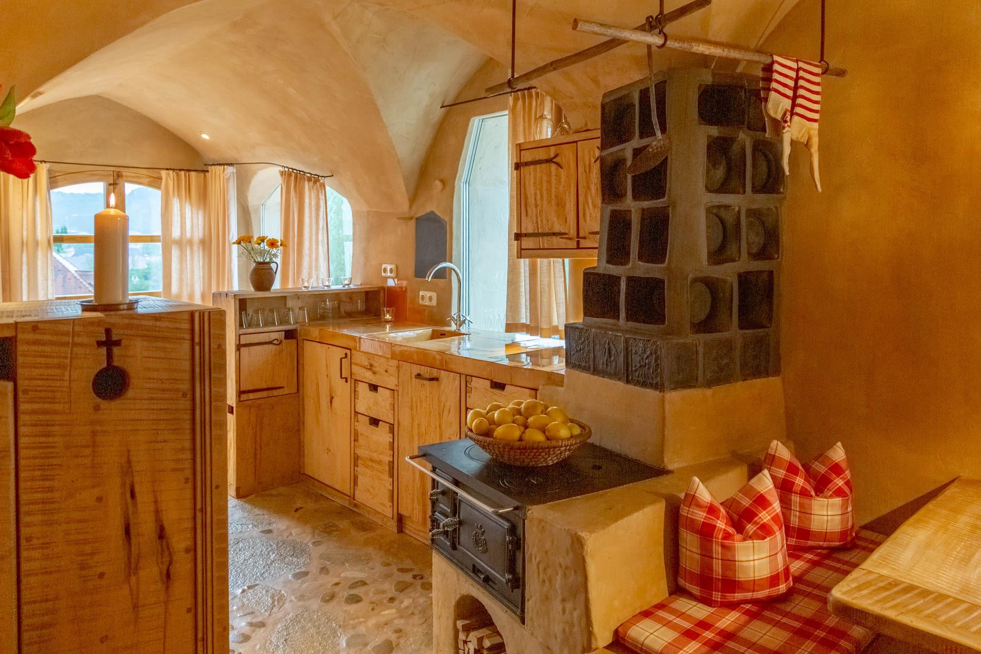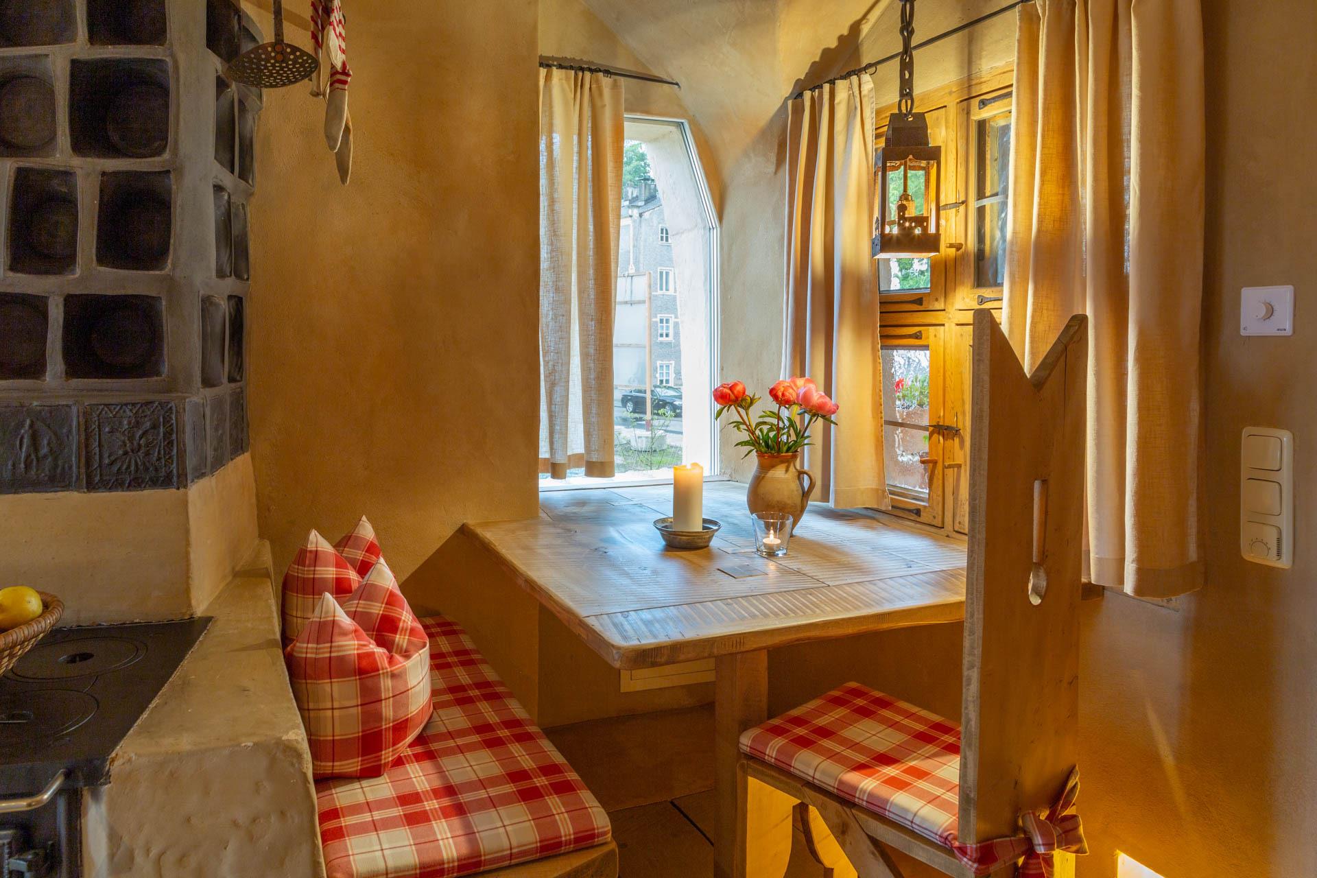 Der Essbereich beim gemütlichen Kachelofen, die Sitzecke mit herrlichem Blick und das bezaubernde Bett in einer holzumrandeten Gewölbenische werden auch Sie begeistern.