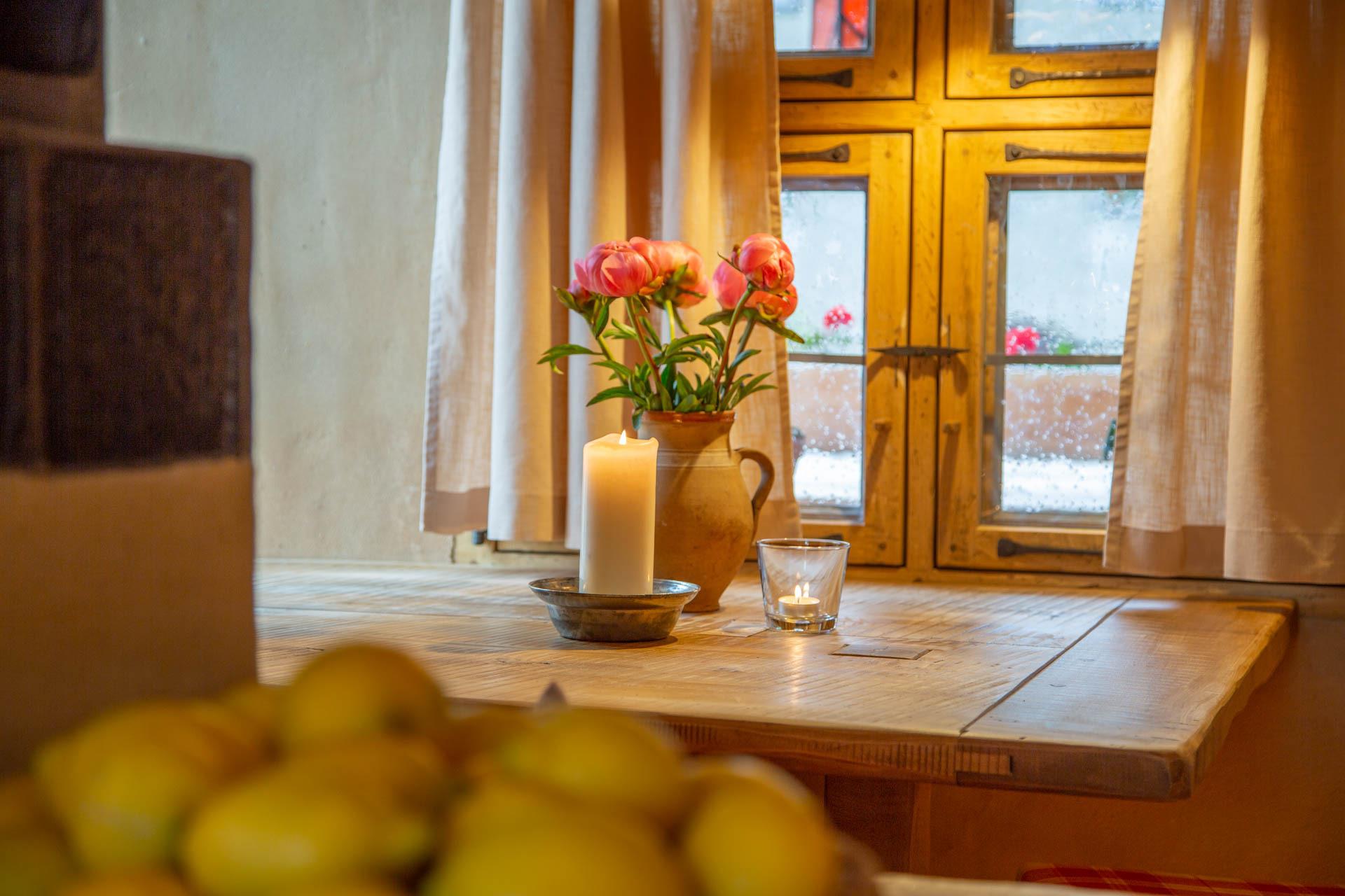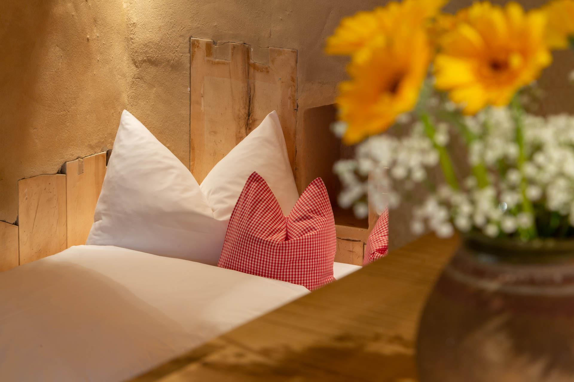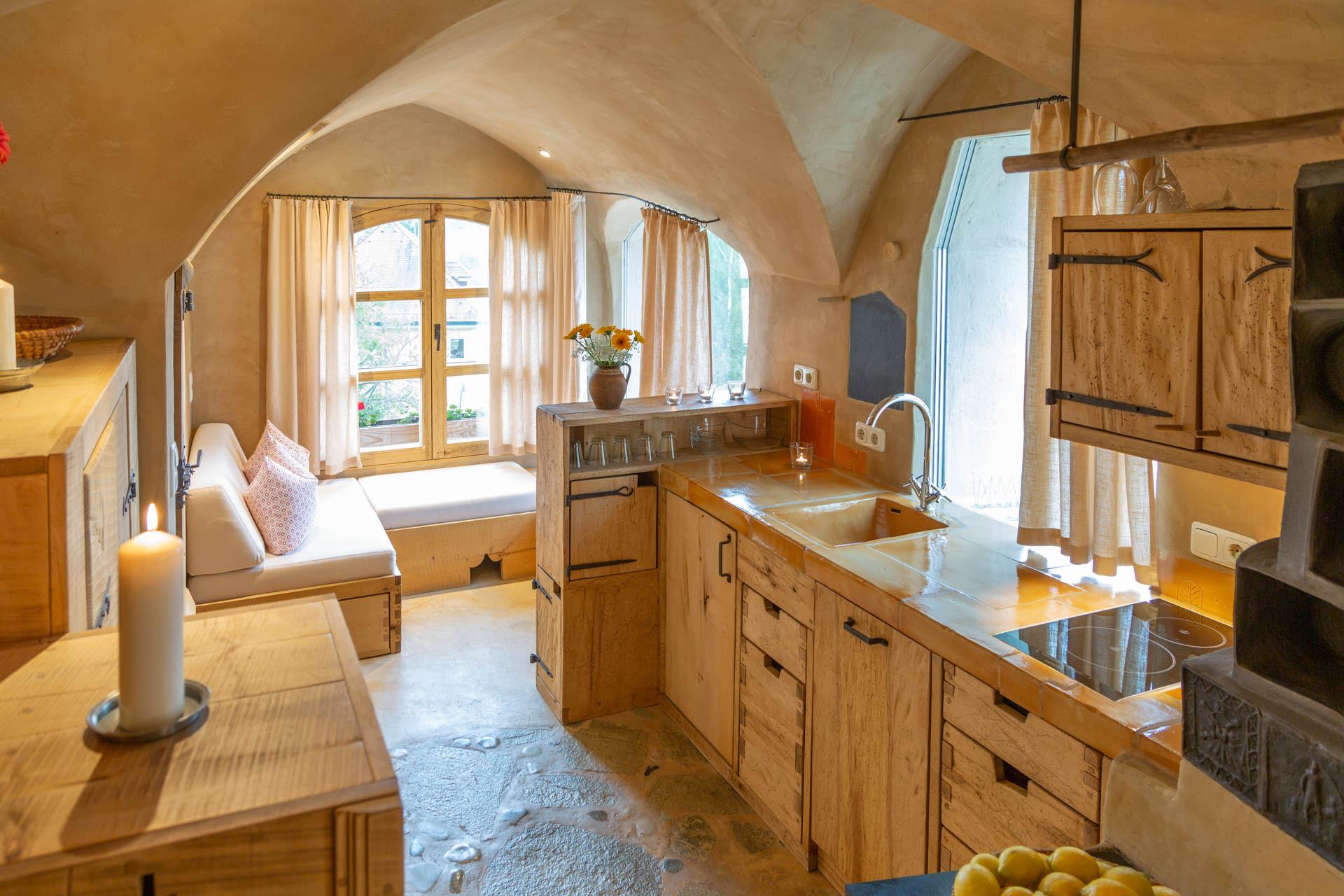 Der Essbereich beim gemütlichen Kachelofen, die Sitzecke mit herrlichem Blick und das bezaubernde Bett in einer holzumrandeten Gewölbenische werden auch Sie begeistern.