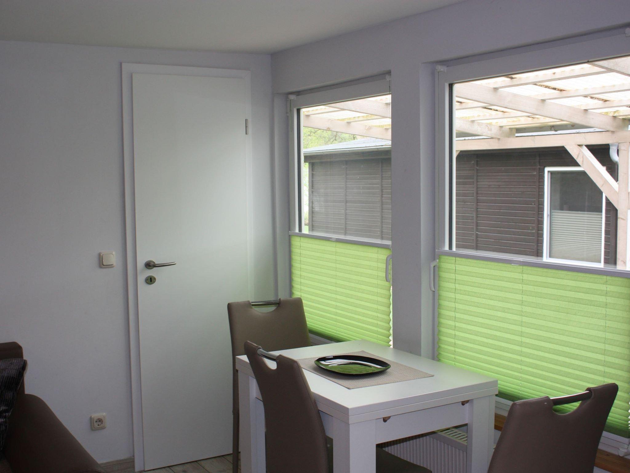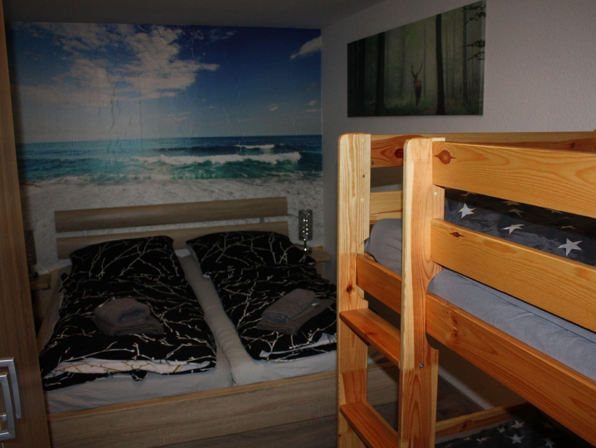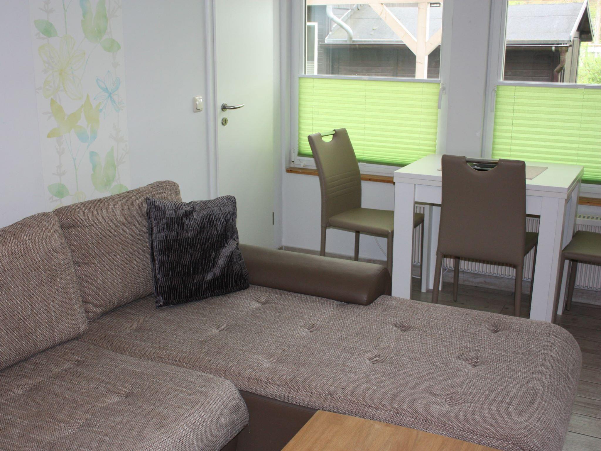 Bungalow am Waldrand bietet:1 Schlafraum für 4 Personen mit Doppelbett und Etagenbett, 1 Wohnraum mit Schlafcouch, Essbereich und offener Küche, sowie ein Bad mit Dusche/WC und Waschmaschine.