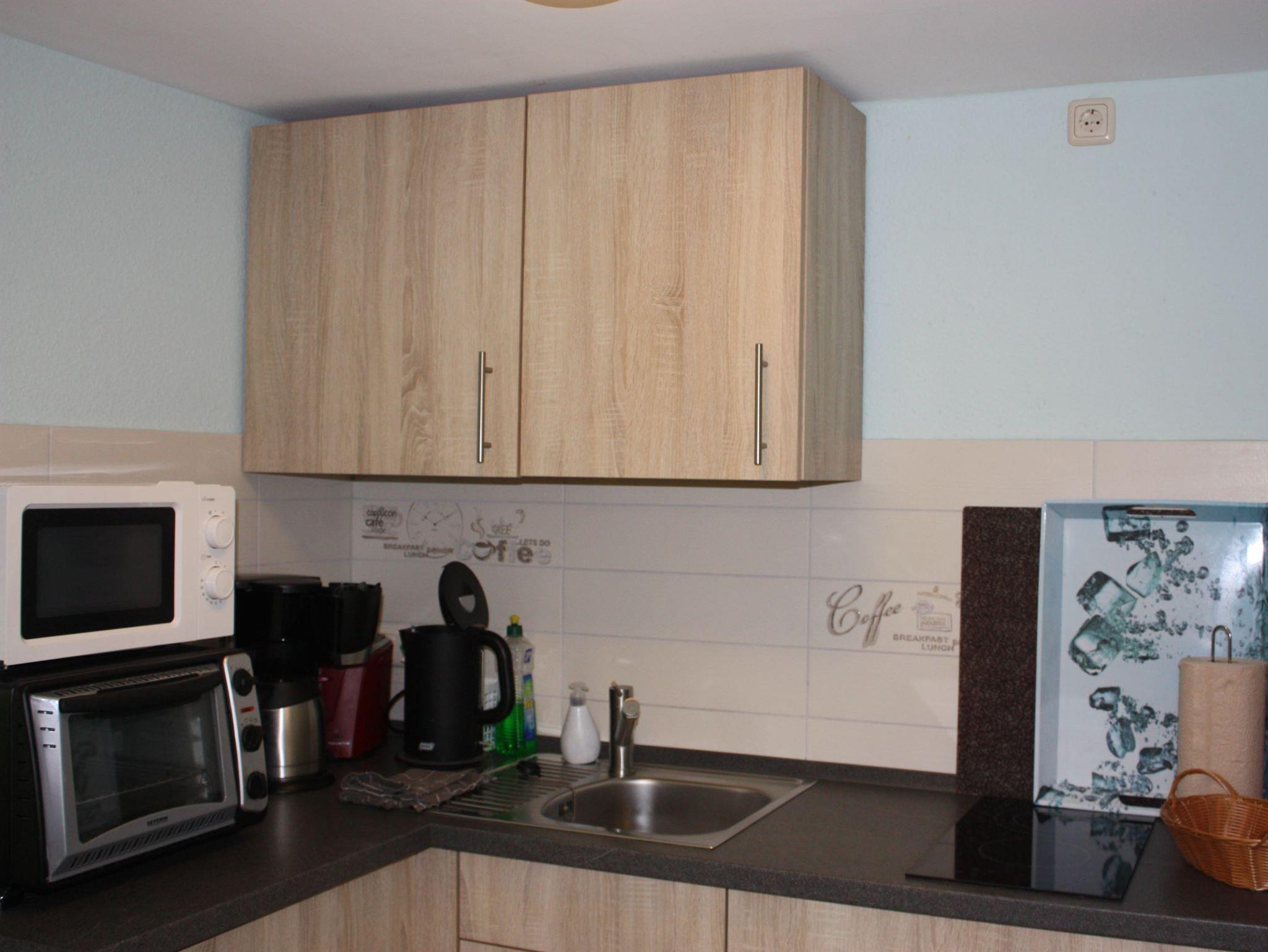 Die Küchenzeile bietet einen Kühlschrank mit Gefrierfach, Kaffeemaschine, Toaster, Wasserkocher, Mikrowelle und einen kleinen Tischbackofen, sowie ein 2 Platten Serankochfeld. Die überdachte Terrasse läd zum Verweilen ein.