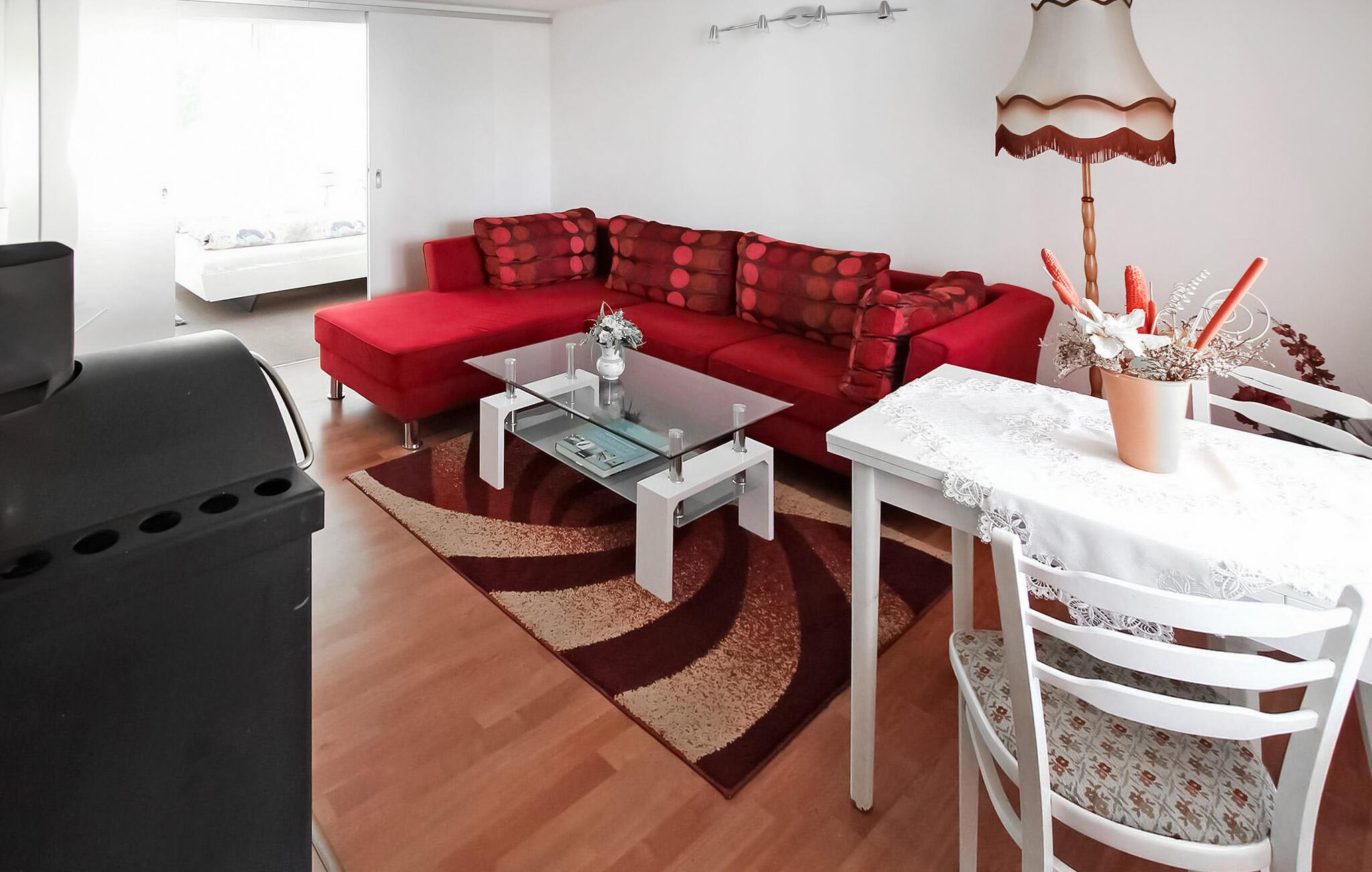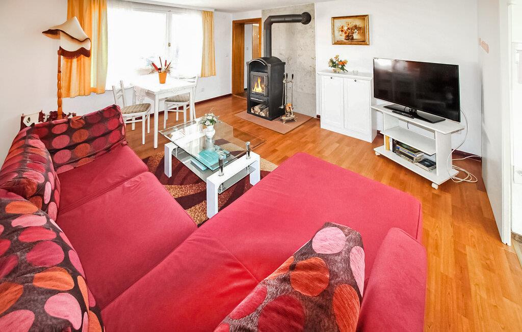Dieses Ferienhaus ist ausgestattet mit Wohnzimmer (Eckcouch, Esstisch und Kaminofen), daran anschließend 1 Schlafzimmer mit Doppelbett, einem weiteren Schlafzimmer mit kleinem Doppelbett, Pantryküche, DU/WC, E-Heizung.