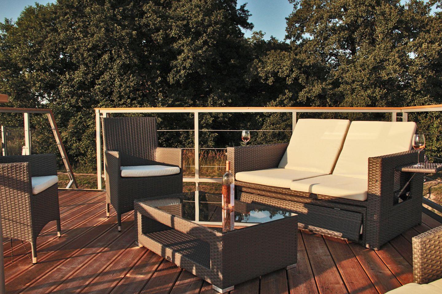 Das Hausboot ist schiffig-modern gestaltet und eingerichtet. Es verfügt über einen großzügigen Wohnbereich mit integrierter, gut-ausgestatteter Küchenzeile, sowie zwei Schlafzimmern. (1 x Doppelbett, 1 x Einzelbett) Klimaanlage zum kühlen und heizen. Das Bad mit komfortabler Regen-Dusche, WC und Waschbecken. Eine Infrarot-Kabine für 2 Personen sorgt für wohlige Wärme und Entspannung an kühlen Tagen. Auf dem Dach bietet eine gemütlich möblierte Dachterrasse zusätzliche Sonnenfläche.