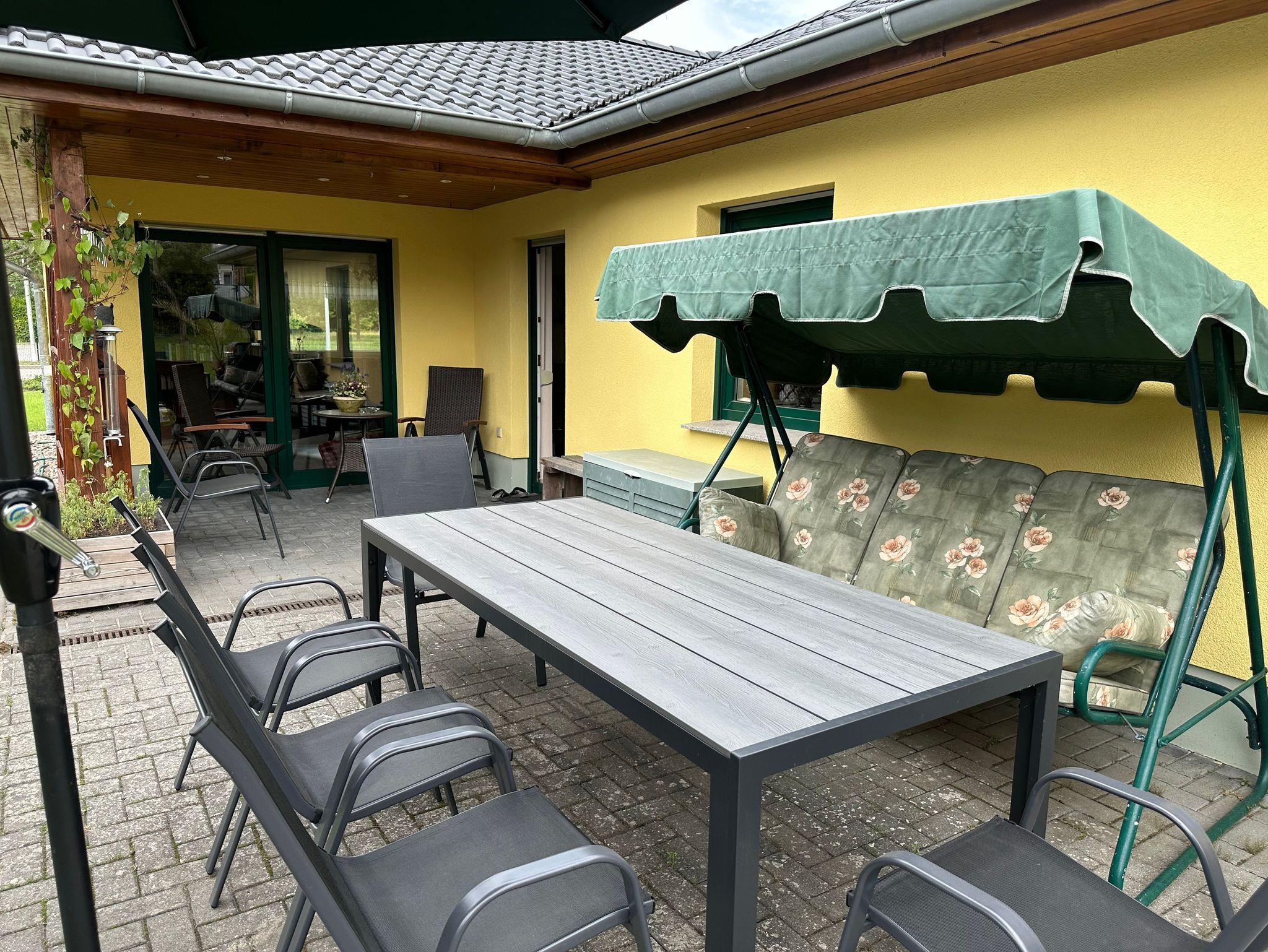 Eine schöne große teilweise überdachte, möblierte Terrasse auf einem schön bepflanztem umzäunten Grundstück.