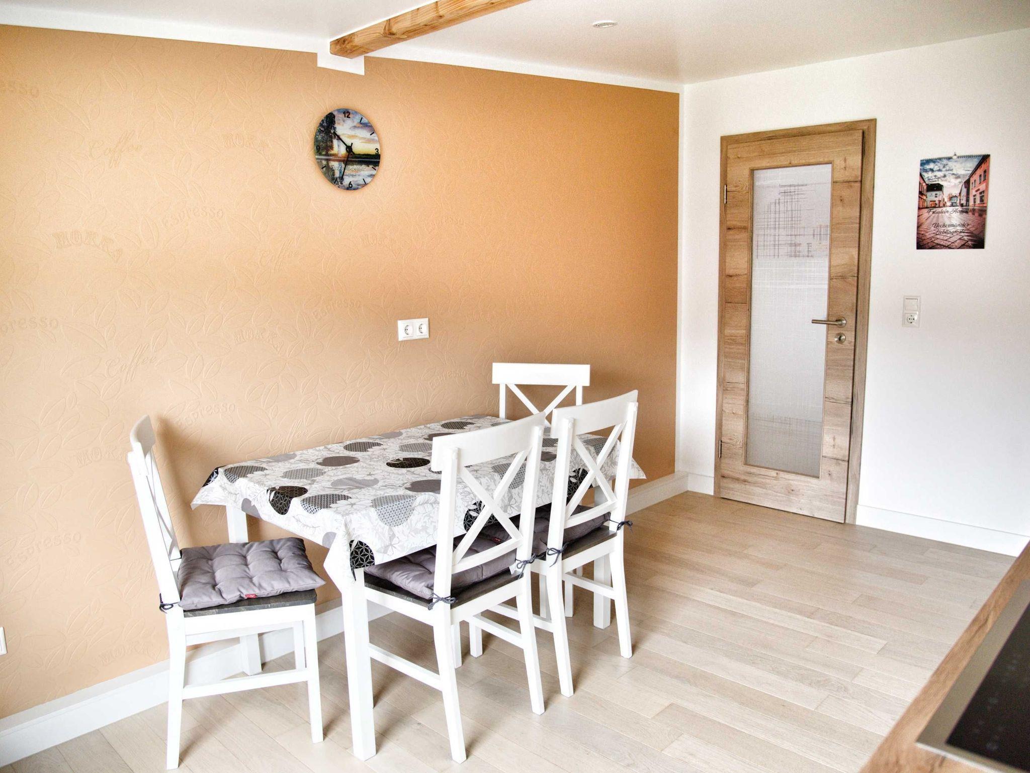 Die Ferienwohnung wurde 2021 komplett kernsaniert und ist modern eingerichtet. Sie bietet Platz für 4 Personen und besteht aus einem komfortablen Wohnzimmer (mit Smart-TV, Internetradio), einem gemütlichen Schlafzimmer (Doppelbett), dem Kinderzimmer (zwei Betten, Flachbildschirm), einer sehr geräumigen, voll ausgstatteten Küche (mit Sitzgelegenheiten), dem großen Bad (mit Kingsize-Dusche) und einem großen Flur (mit Garderobe, etc.). Auf Absprache ist auch Aufbettung möglich. Die Betten im Kinderzimmer und die Couch im Wohnzimmer lassen sich ausziehen. Wir möchten darauf hinweisen, dass die Wohnräume über eine Treppe zu erreichen sind.