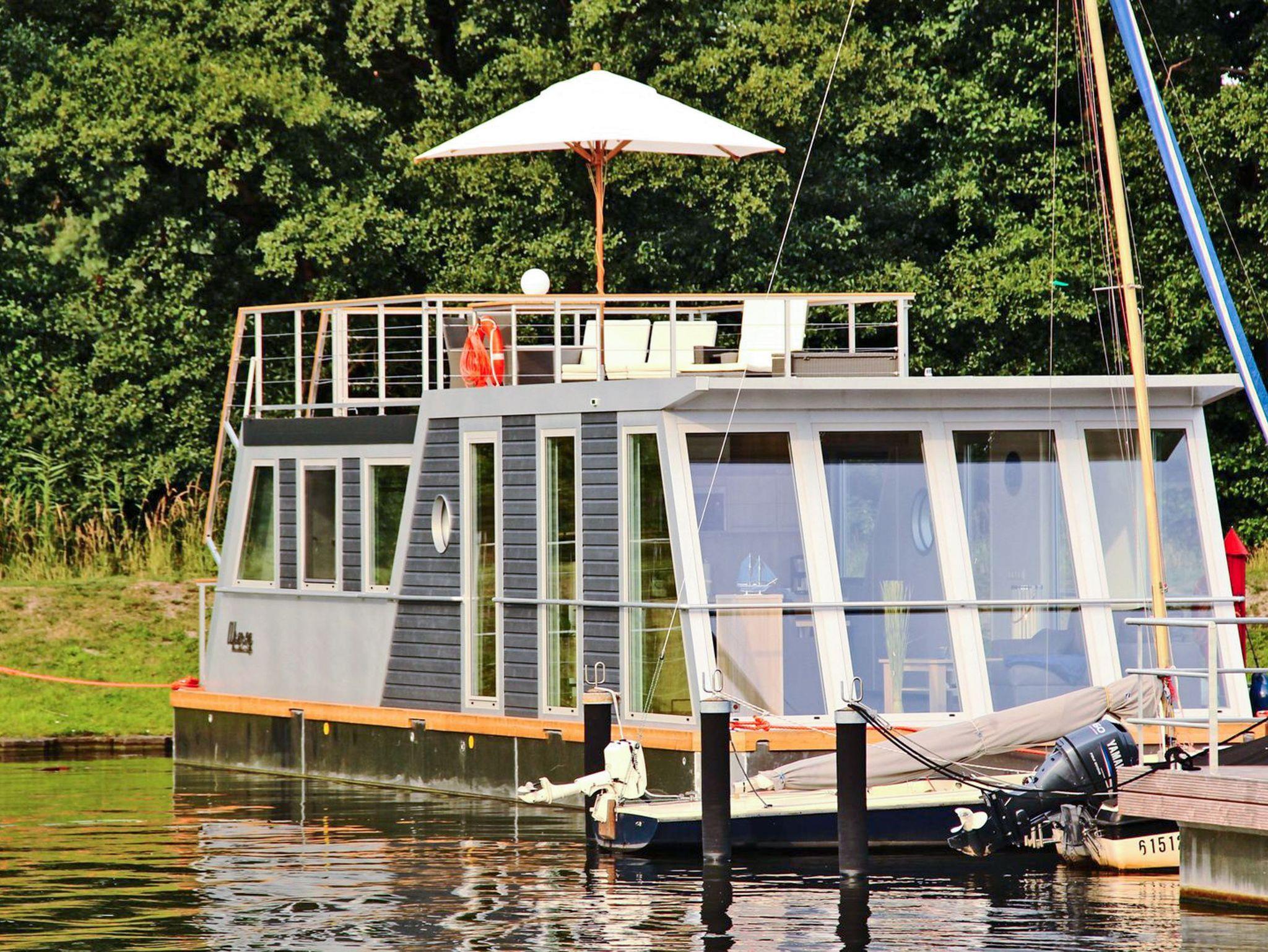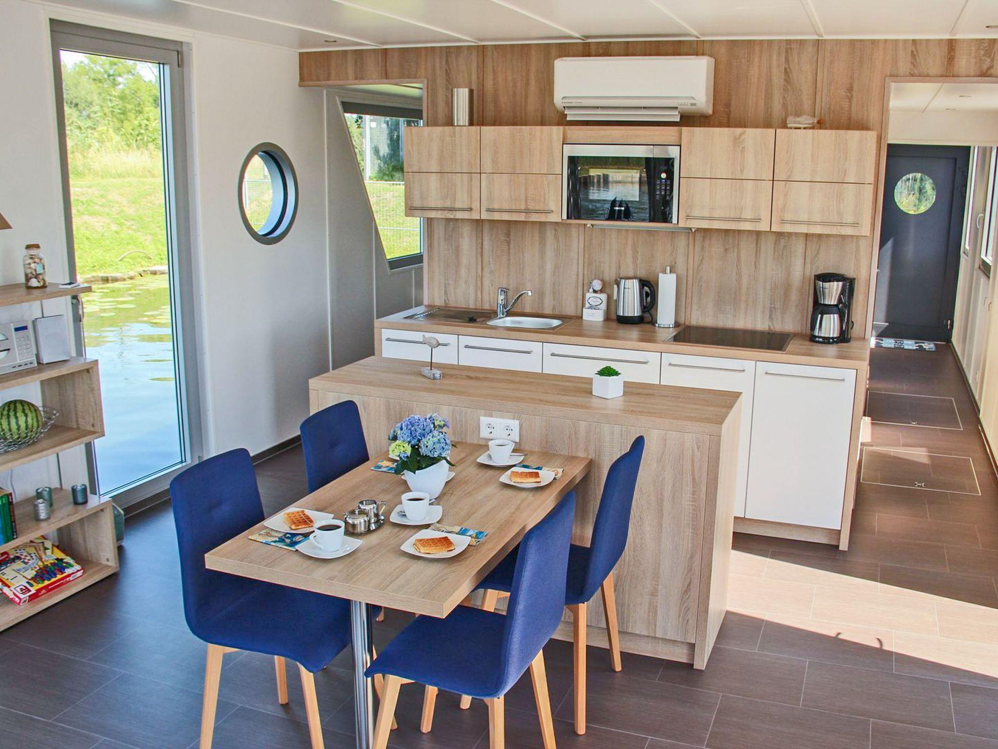 Erleben Sie maritimen Komfort im Floating House Xenia direkt am Wasser mit Terrasse und Panoramablick in Ueckermünde.