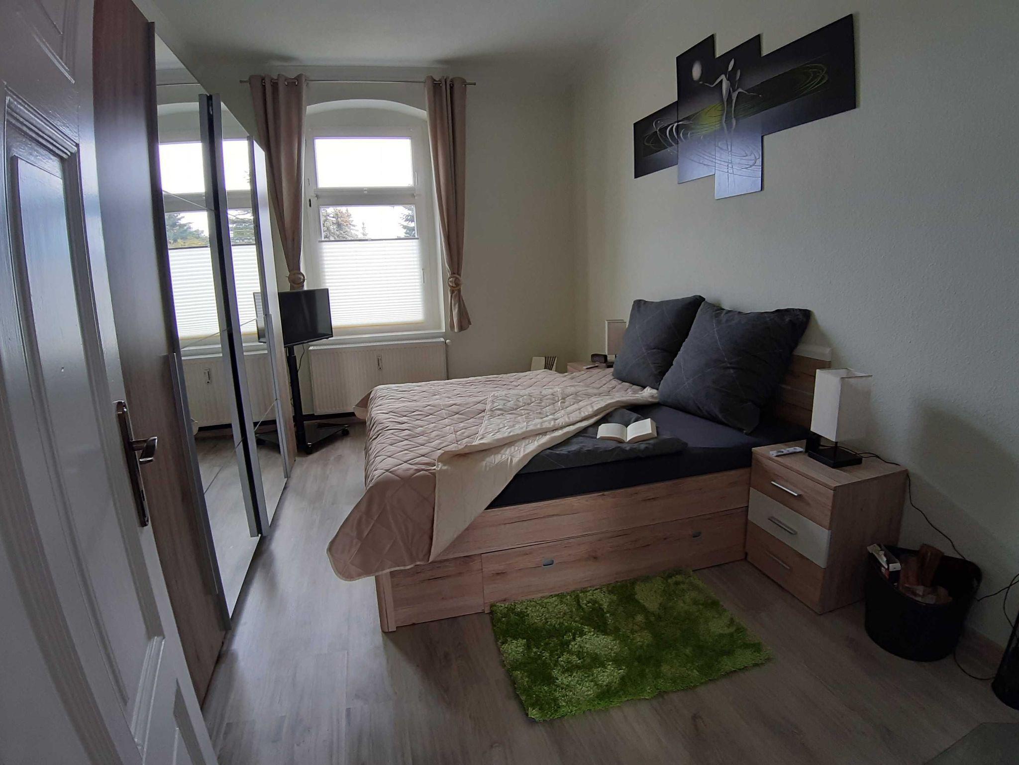 Die Fußböden im Wohn- und Schlafbereich sowie im Flur sind mit Laminat ausgelegt. Im Schlafzimmer erwartet die Gäste ein großes Doppelbett (1,80 x 2,00 m) mit verstellbaren Lattenrosten und hochwertigen Matratzen. Ein großer Kleiderschrank bietet Platz für die Urlaubsgarderobe. Nachttische mit Touchlampen und 2 Fernbedienungen für das