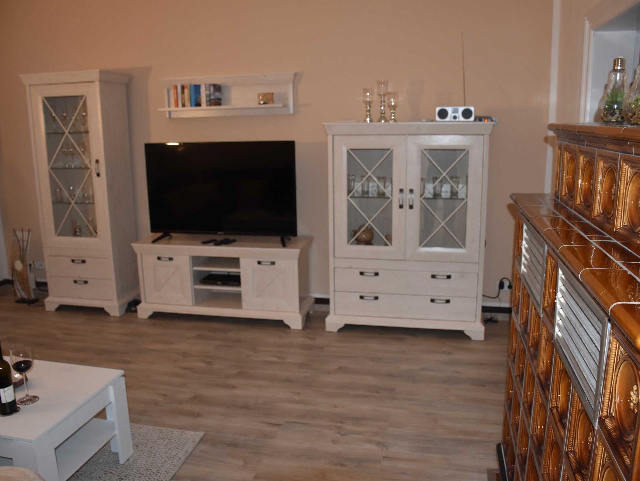 Im Wohn - und Schlafzimmer sind Flachbildfernseher vorhanden. Für Gemütlichkeit sorgen im Wohnzimmer eine große Eckcouch, die ausziehbar ist (auf eine Liegefläche auf eine 1,40 x 1,80) sowie ein großer Kachelofen.
