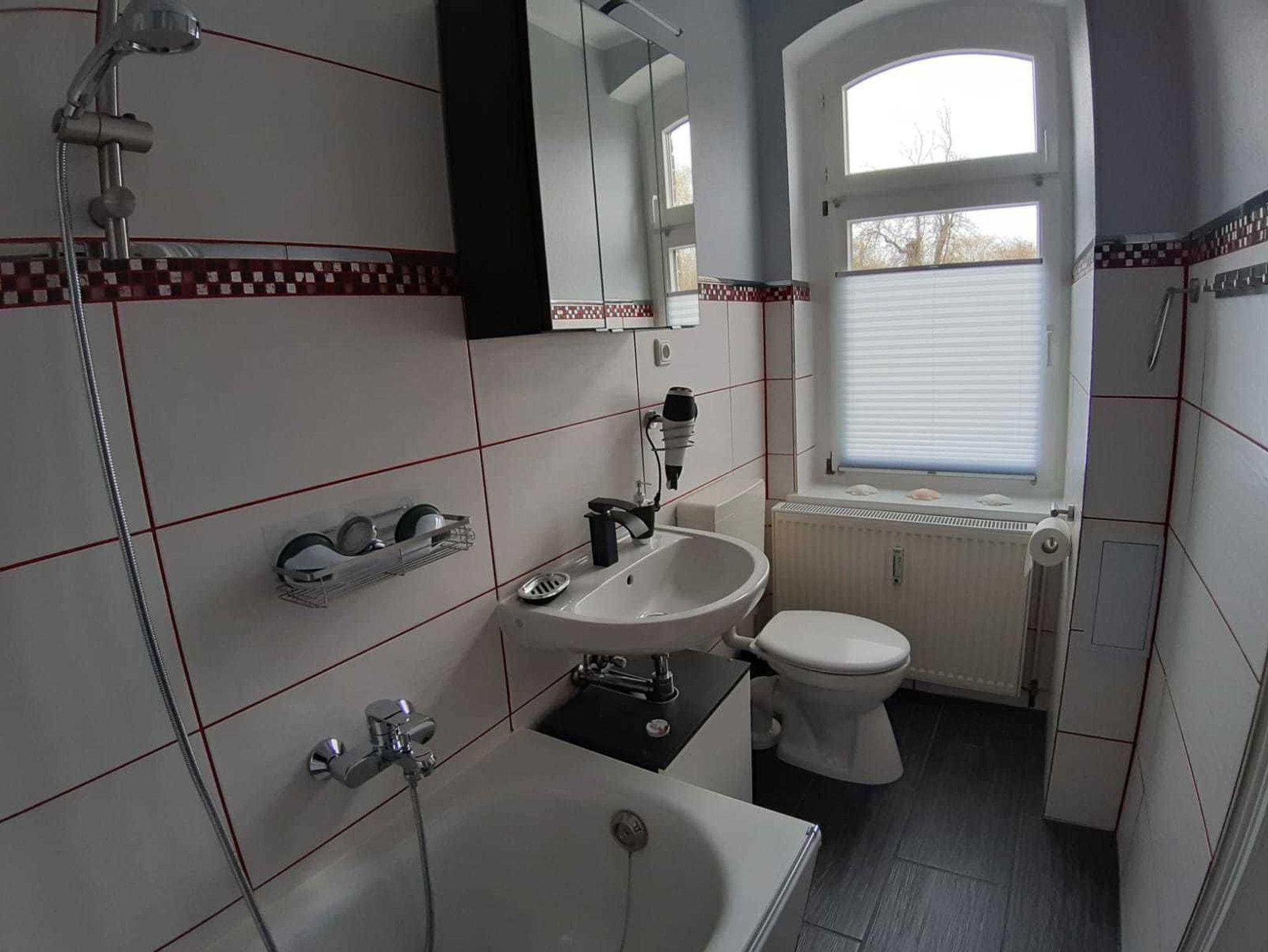 Die Einbauküche mit Essbereich und das Badezimmer mit Badewanne, Duschmöglichkeit und WC verfügen über große Fenster.