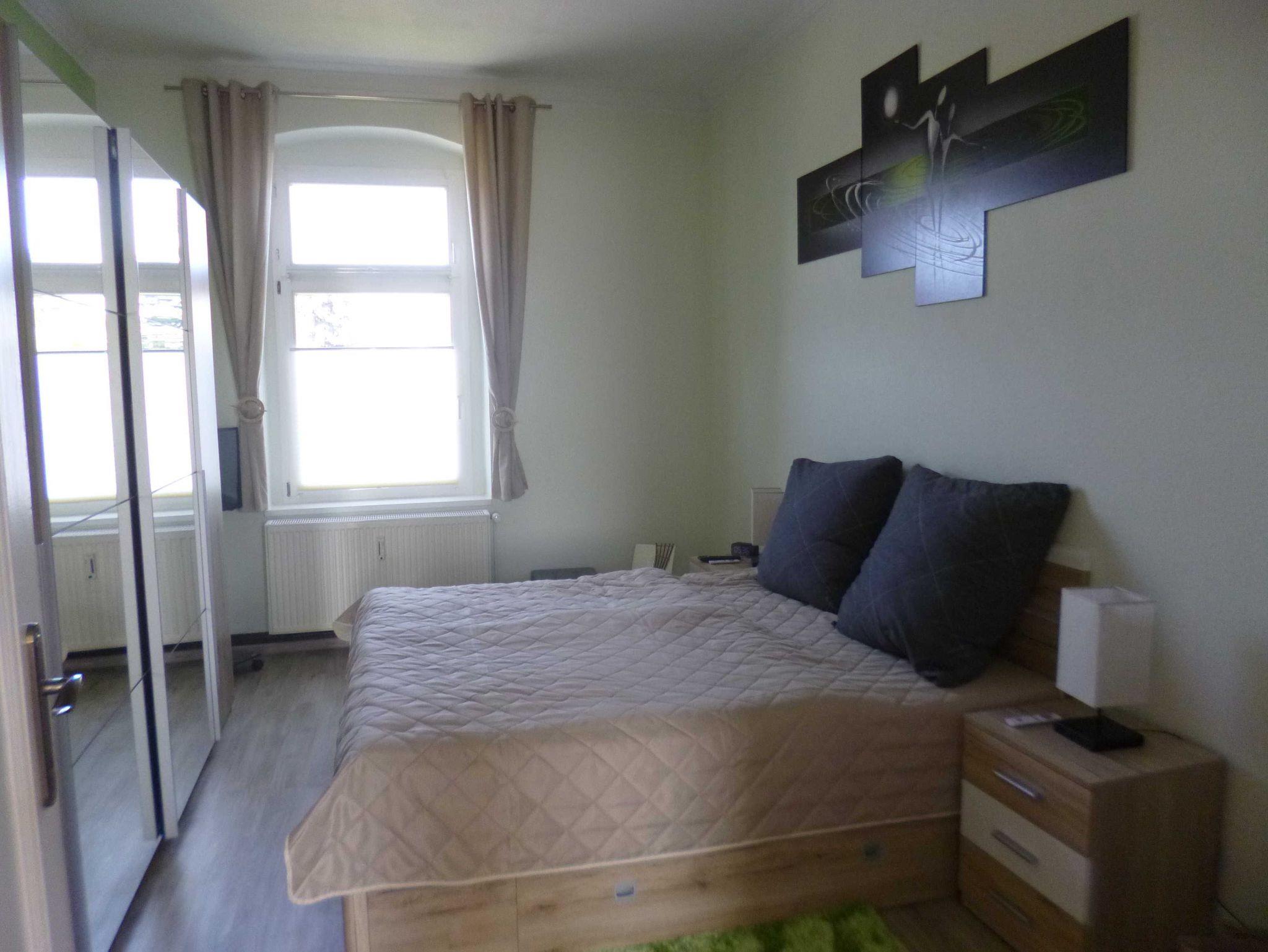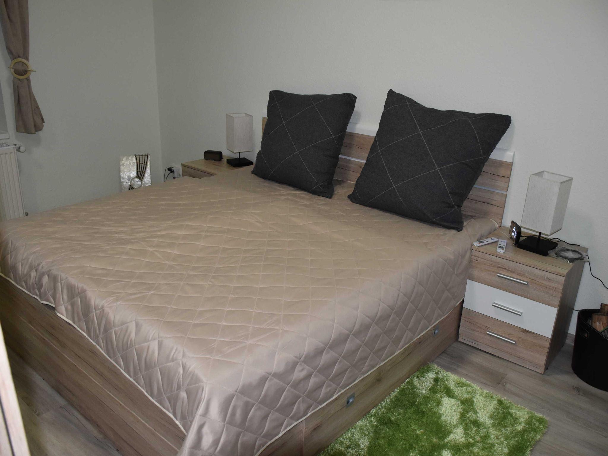 Die Fußböden im Wohn- und Schlafbereich sowie im Flur sind mit Laminat ausgelegt. Im Schlafzimmer erwartet die Gäste ein großes Doppelbett (1,80 x 2,00m) mit verstellbaren Lattenrosten und hochwertigen Matratzen. Ein großer Kleiderschrank bietet Platz für die Urlaubsgarderobe. Nachttische mit Touchlampen und 2 Fernbedienungen für das