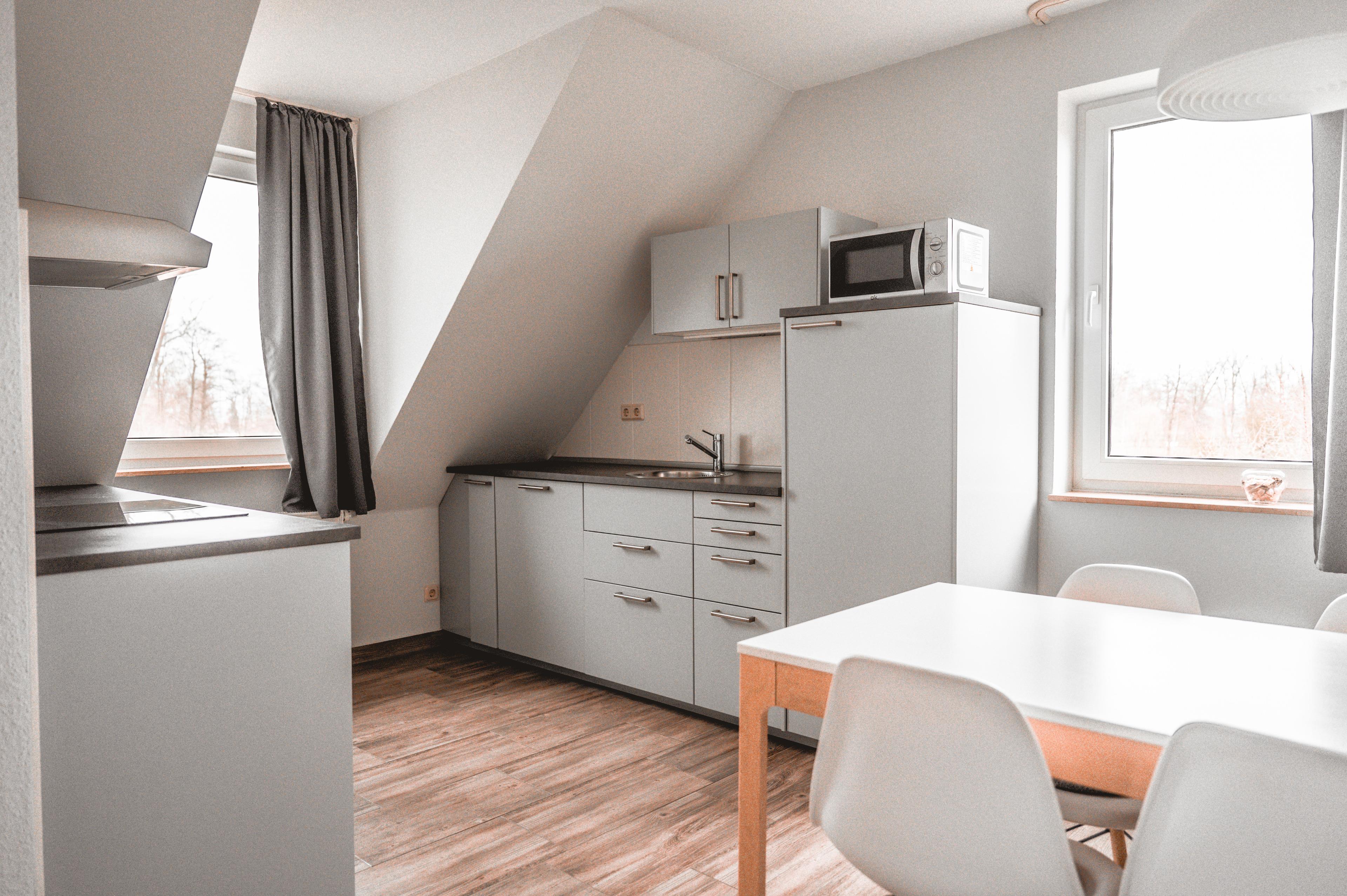Ihre große Einbauküche ist zum Wohnzimmer hin teiloffen, was den Raum großzügiger erscheinen lässt. Die Küchenzeile ist sehr gut ausgestattet. Bestandteile sind unter anderem ein Cerankochfeld, ein Backofen, eine Mikrowelle, eine Kaffeemaschine, viel Geschirr sowie ein Kühlschrank mit Gefrierfach. In Ihrem offenen Wohn- und Essbereich steht Ihnen eine gemütliche Sitzecke zur Verfügung.