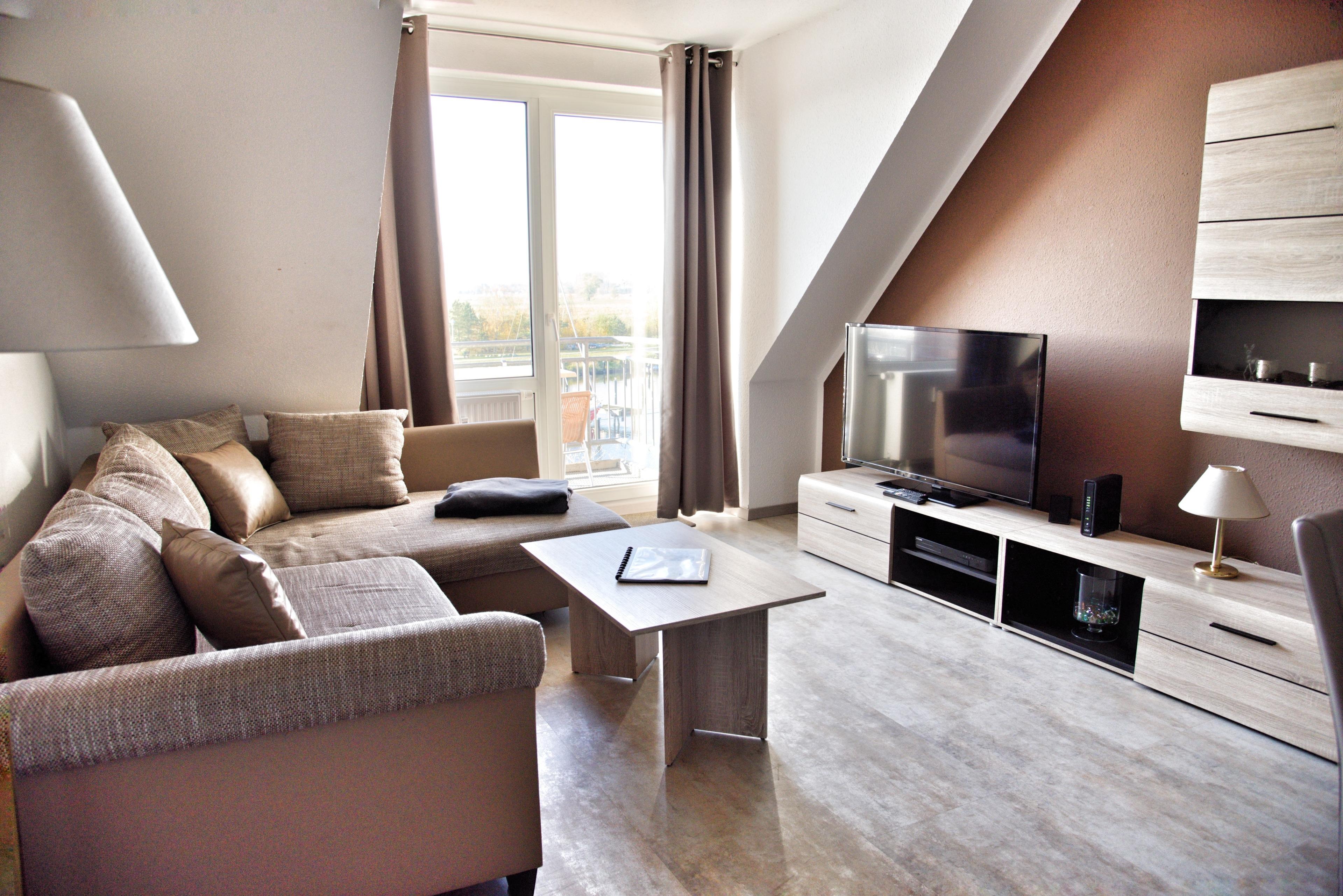 Das Wohnzimmer bietet Ihnen einen Esstisch mit sechs Stühlen, ein ausziehbares Schlafsofa mit einem Schlafplatz für zwei Personen und einen Sessel. Multimedial steht Ihnen ein großer Flachbildfernseher Verfügung. Ihre Ferienwohnung hat einen Kabelanschluss. Einige Gesellschaftsspiele warten hier schon auf Sie.