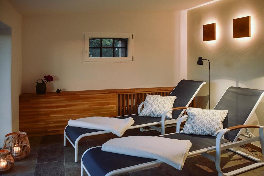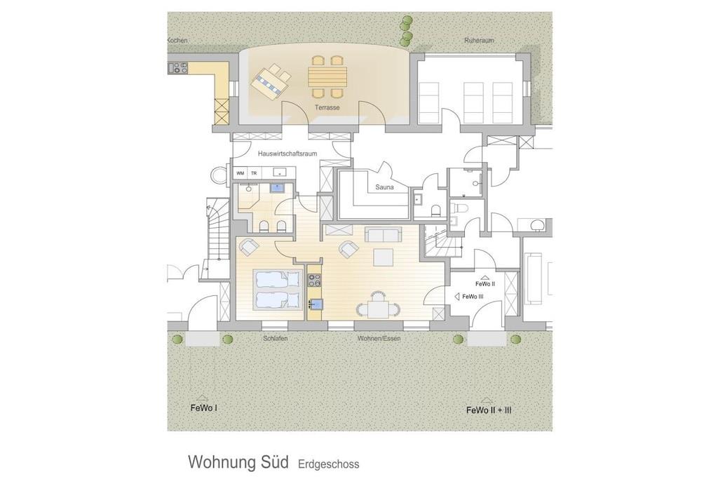 *** Besuchen Sie unsere Webseite: www.huus-uelvesbuell.de *** Inmitten der weiten Marschlandschaft Eiderstedts steht unser fast 120 Jahre altes Reetdachhaus Huus Uelvesbüll, das wir 2017 mit Liebe zum Detail grundlegend saniert haben. Aus jedem Fenster unseres lichtdurchfluteten Hauses mit den drei Hausteilen Ost, Süd und West schauen Sie in die Weite: auf Deiche, Felder und grasende Schafe. Die äußere Weite wird auch innen spürbar: durch eine schnörkellose, skandinavisch inspirierte und sehr hochwertige Einrichtung und Ausstattung. In der Wohnung Richtung Süden finden Sie auf 45qm ein Wohnzimmer mit Küchenzeile und Essplatz, ein Schlafzimmer, in dem Sie wahlweise zwei Einzelbetten oder ein Doppelbett vorfinden und ein Badezimmer. Im Haus stehen Ihnen ein großzügiger Saunabereich mit Ruheraum sowie ein Hauswirtschaftsraum zur Verfügung. Eine Aufladesäule für E-Autos ist auf dem Parkplatz des Hauses verfügbar.
