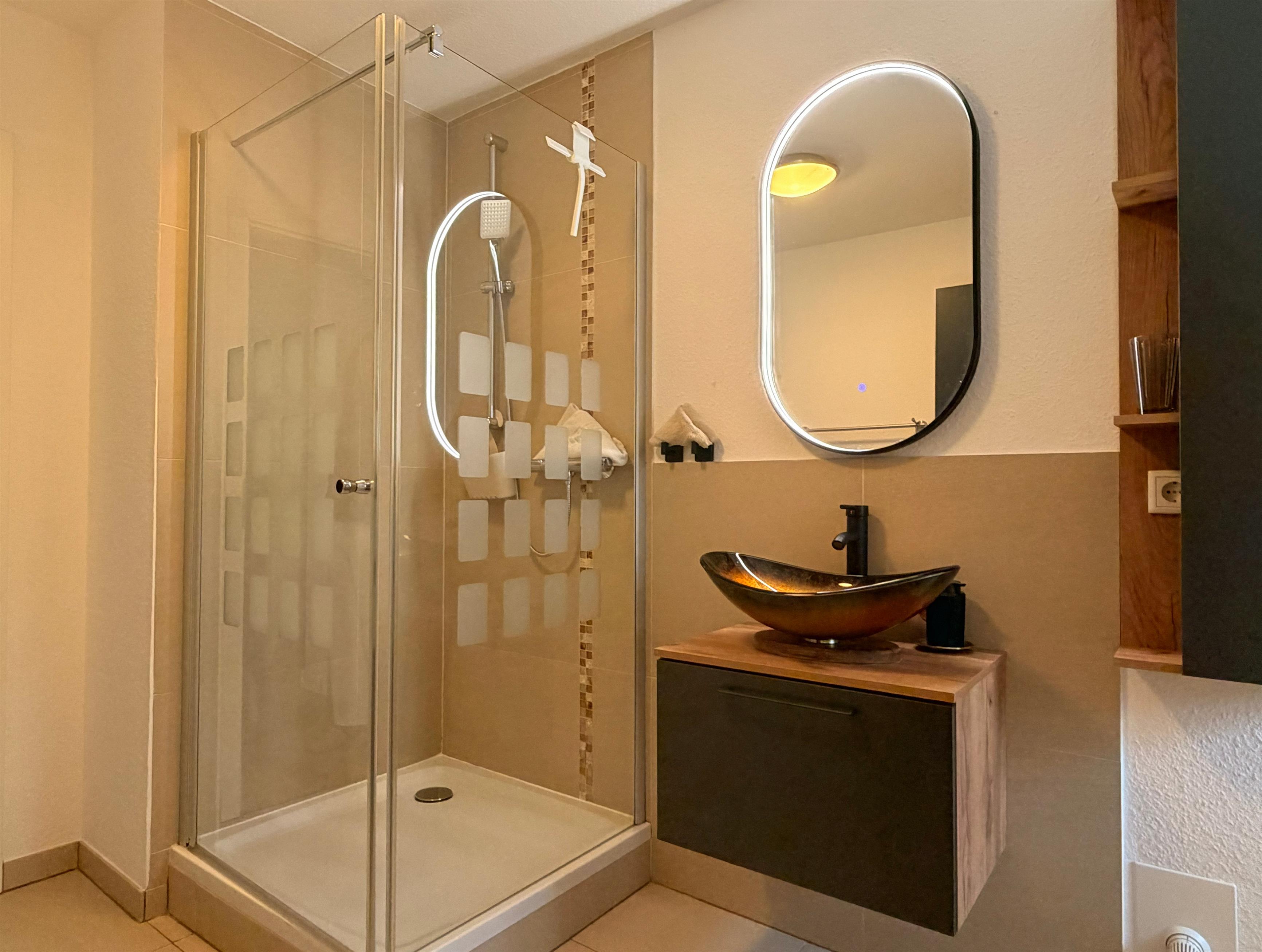 Das Haus wurde vollständig modernisiert, um den heutigen Komfortwünschen zu entsprechen. Dabei war es uns sehr wichtig, den Charme des historischen Gebäudes zu erhalten. Die Wohnung verfügt über ein Wohn/Essbereich mit Kaminofen und einer offenen Küche, einem Bad und den getrennten Schlafzimmern. Das erste Schlafzimmer ist mit einem Boxspring-Doppelbett und begehbarem Kleiderschrank ausgestattet, im Zweiten befinden sich je nach Belegung 2 oder 3 einzelne Betten.